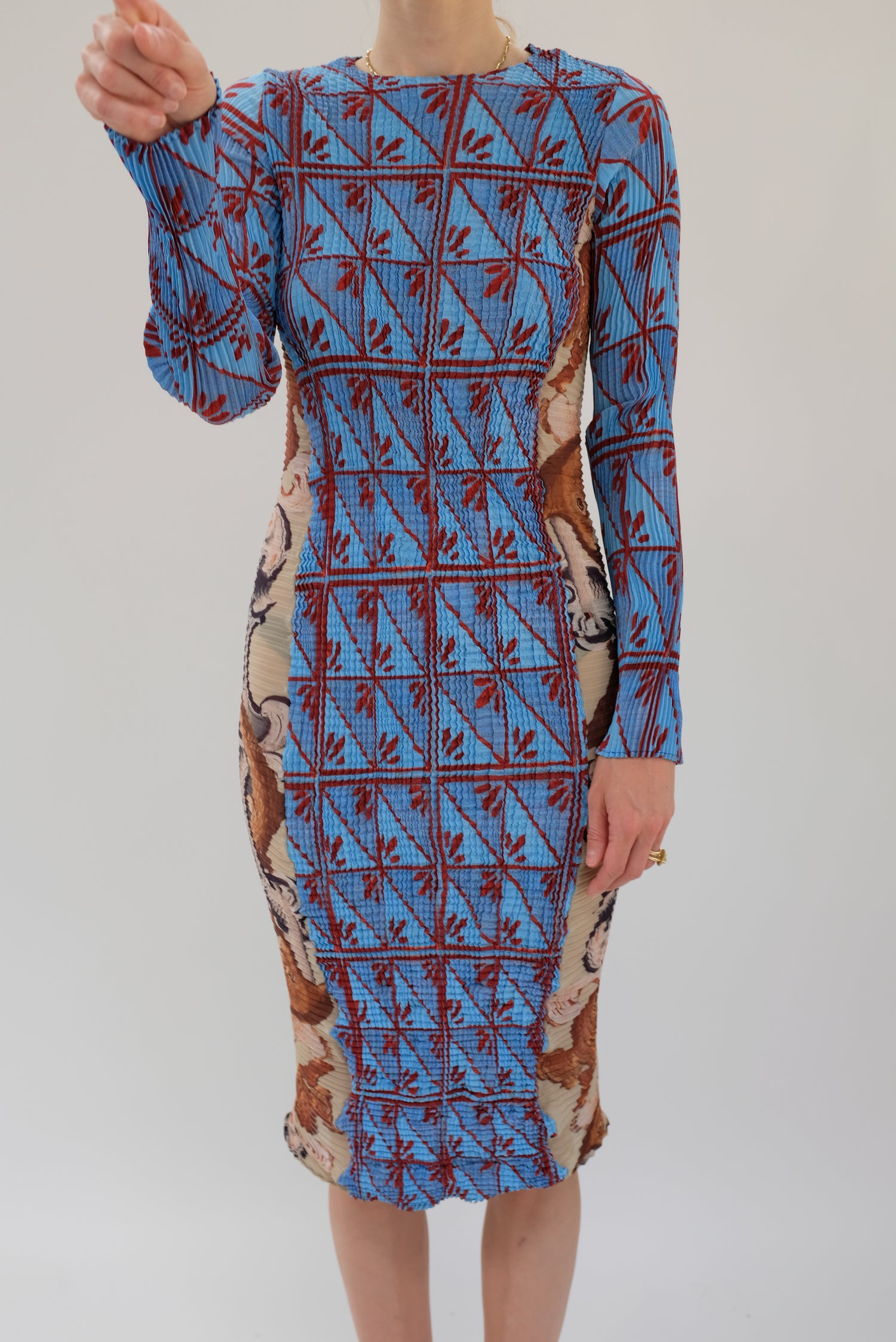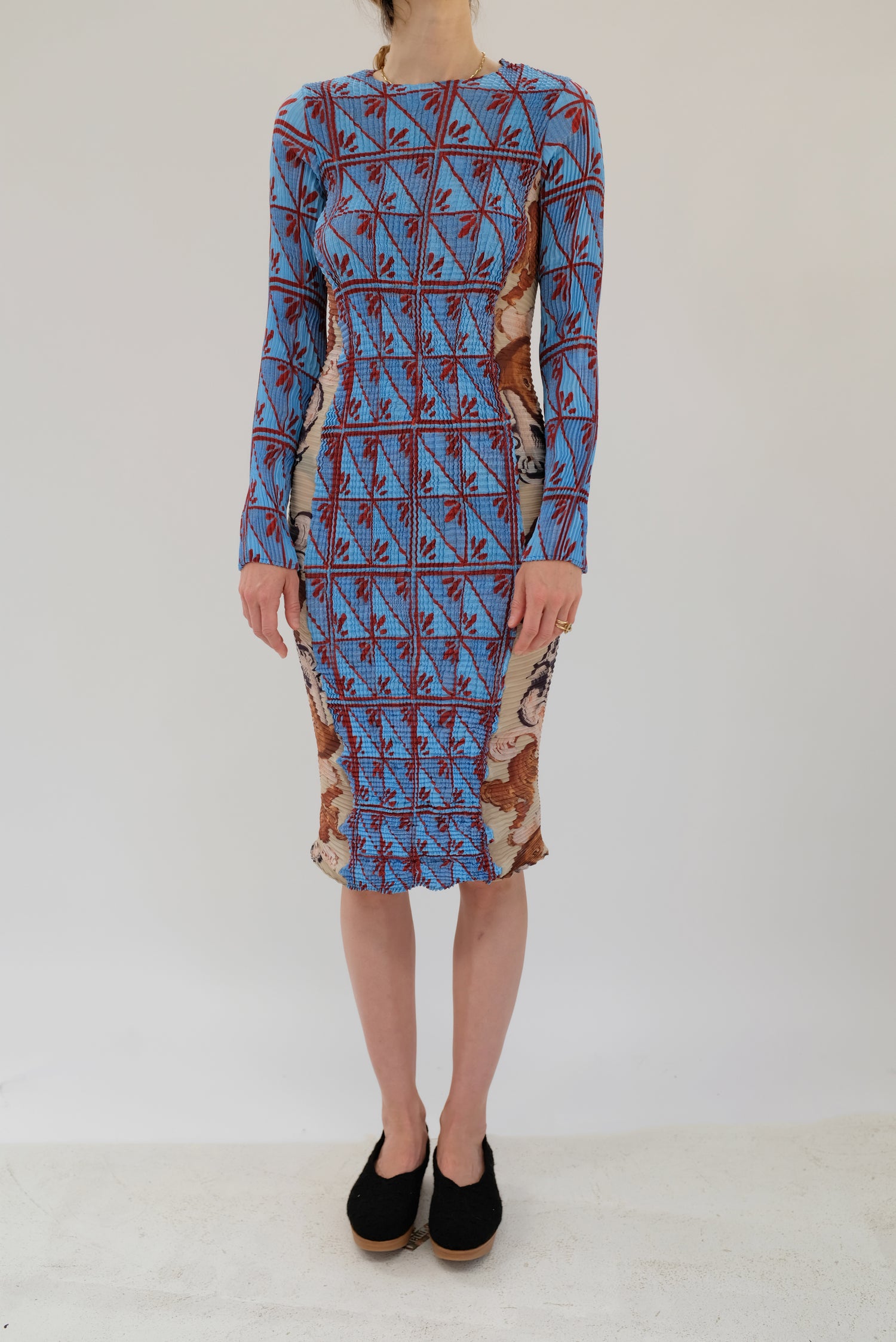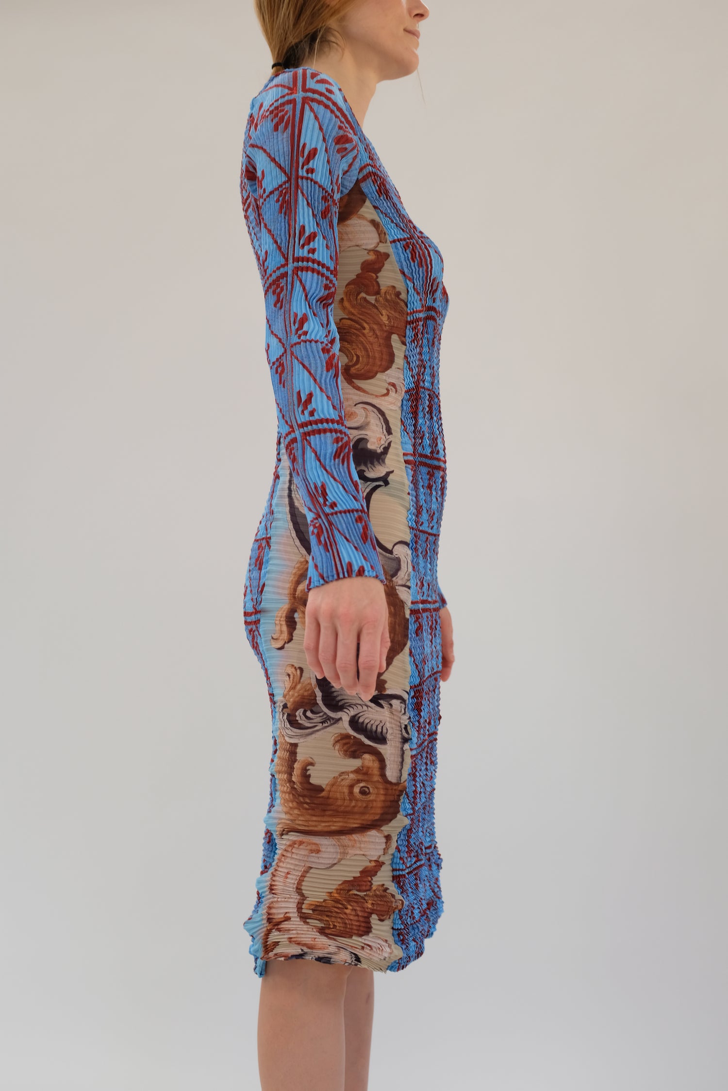 Beautiful handmade dress. Hand pleated using arashi shibori technique. Pattern placement, pleating and measurements vary as each dress is handmade individually. High neckline, long sleeved, slightly sheer. One size fits most. 100% PES Chiffon. Very limited edition.
