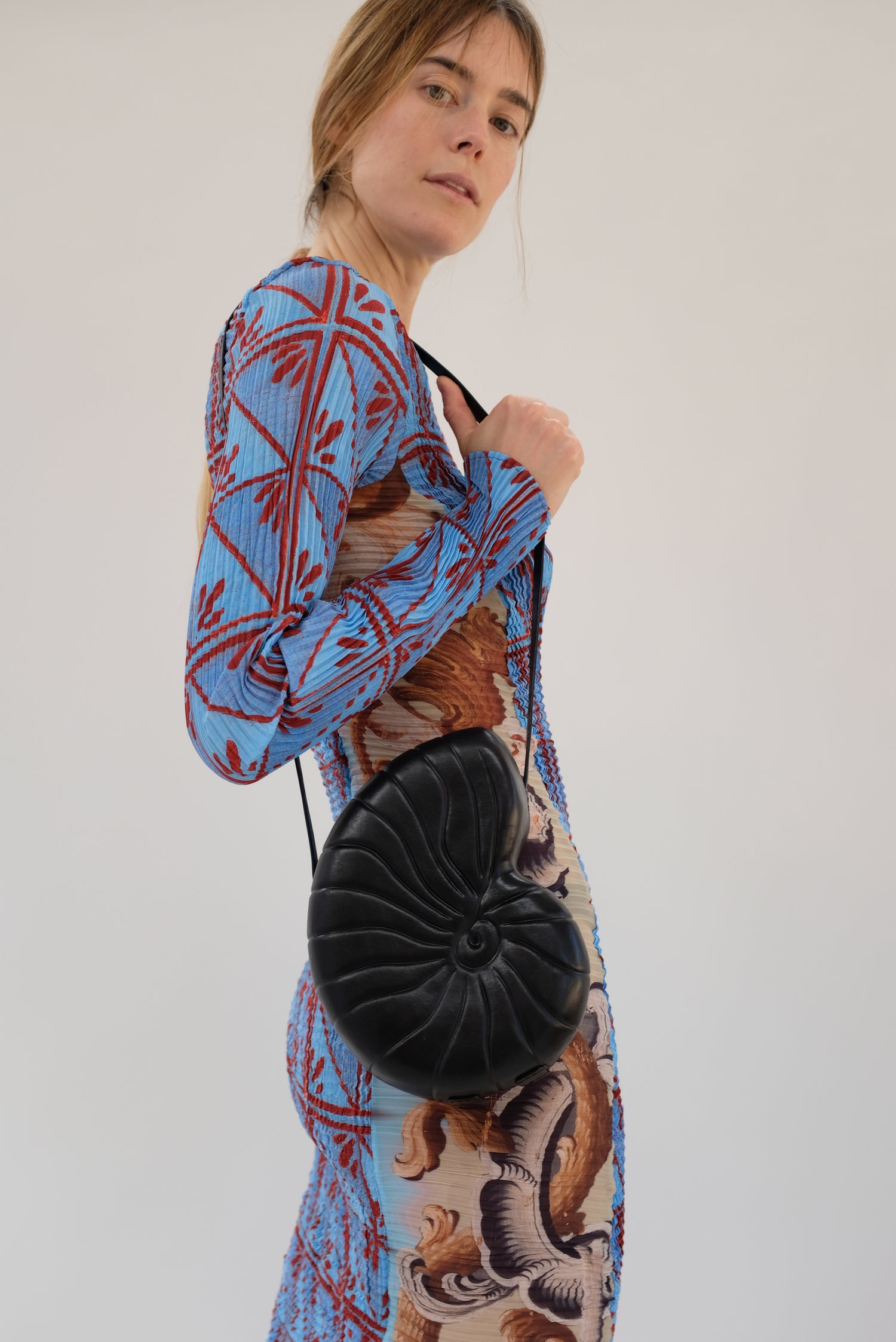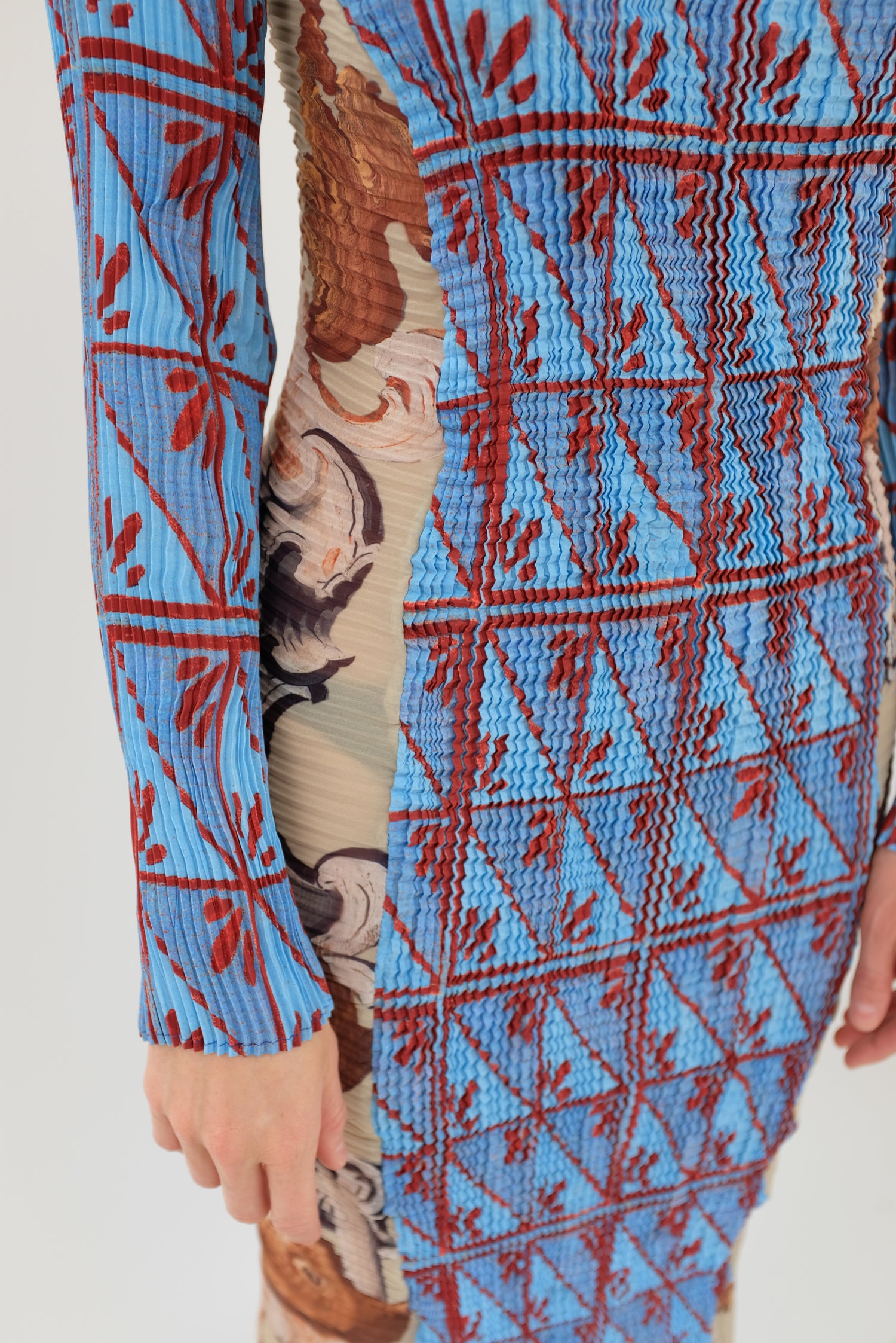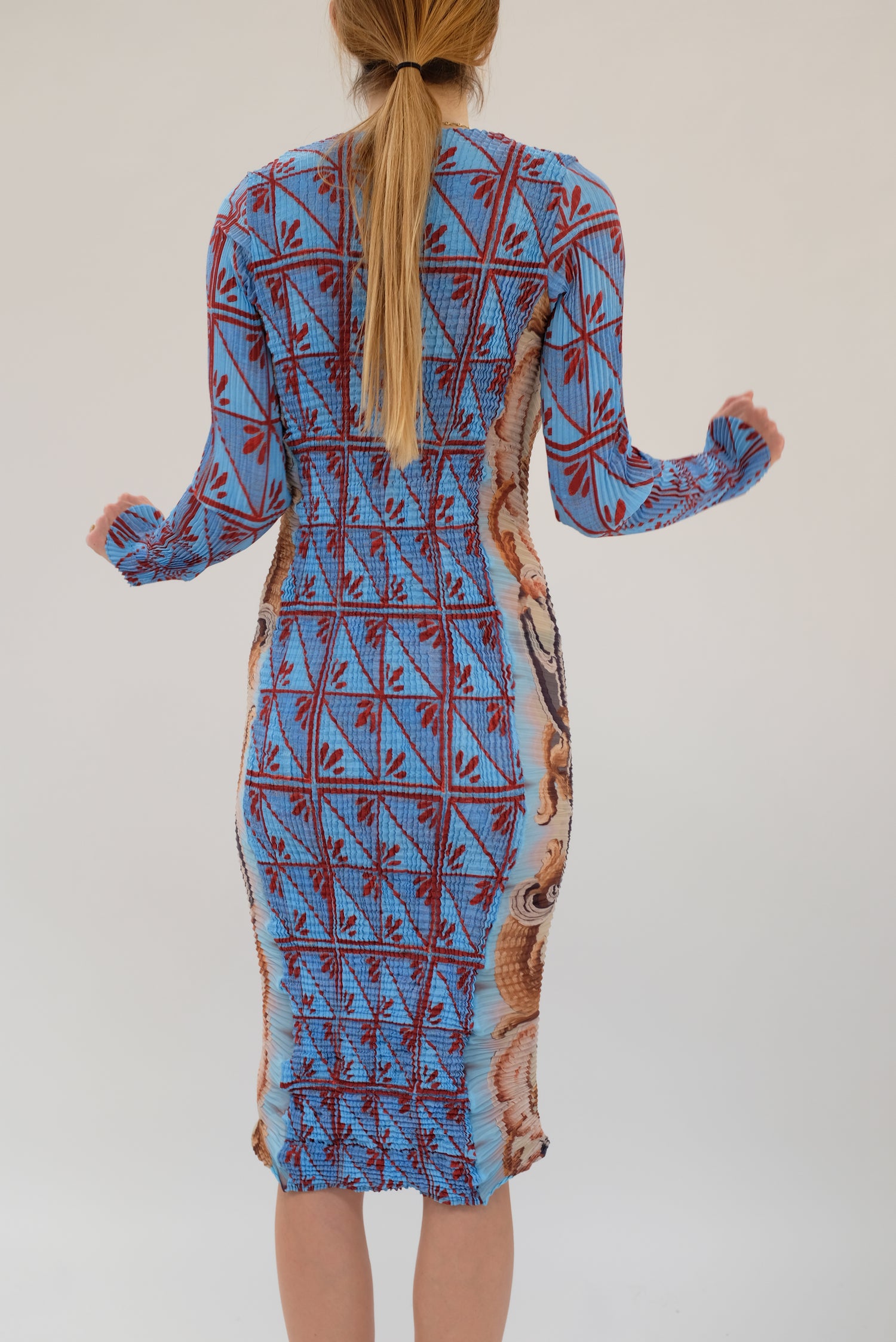 Beautiful handmade dress. Hand pleated using arashi shibori technique. Pattern placement, pleating and measurements vary as each dress is handmade individually. High neckline, long sleeved, slightly sheer. One size fits most. 100% PES Chiffon. Very limited edition.