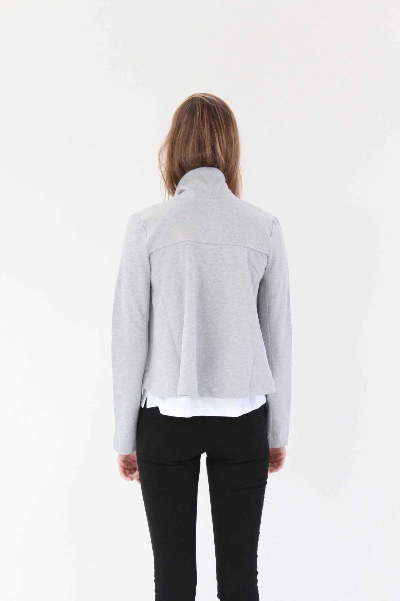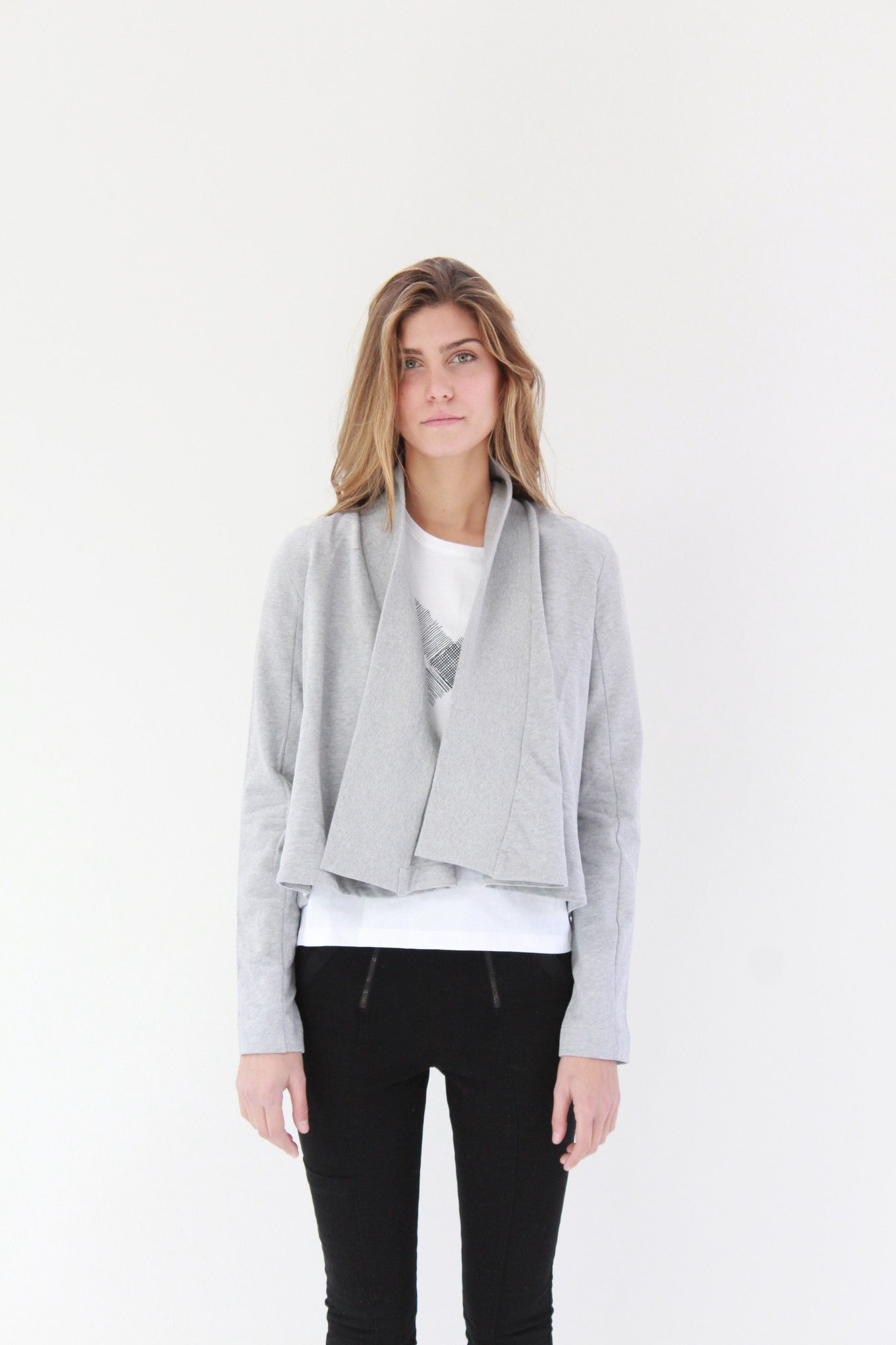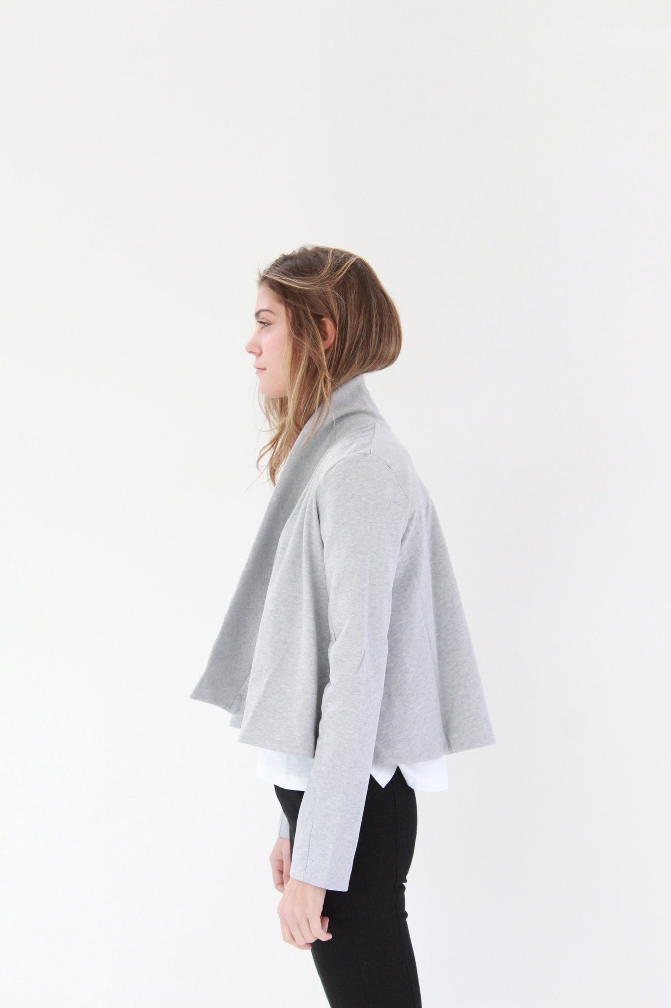 Swing, wrap front cardigan with fitted sleeves & rib collar band. Premium 100% certified organic cotton fair trade heavyweight loop knit.