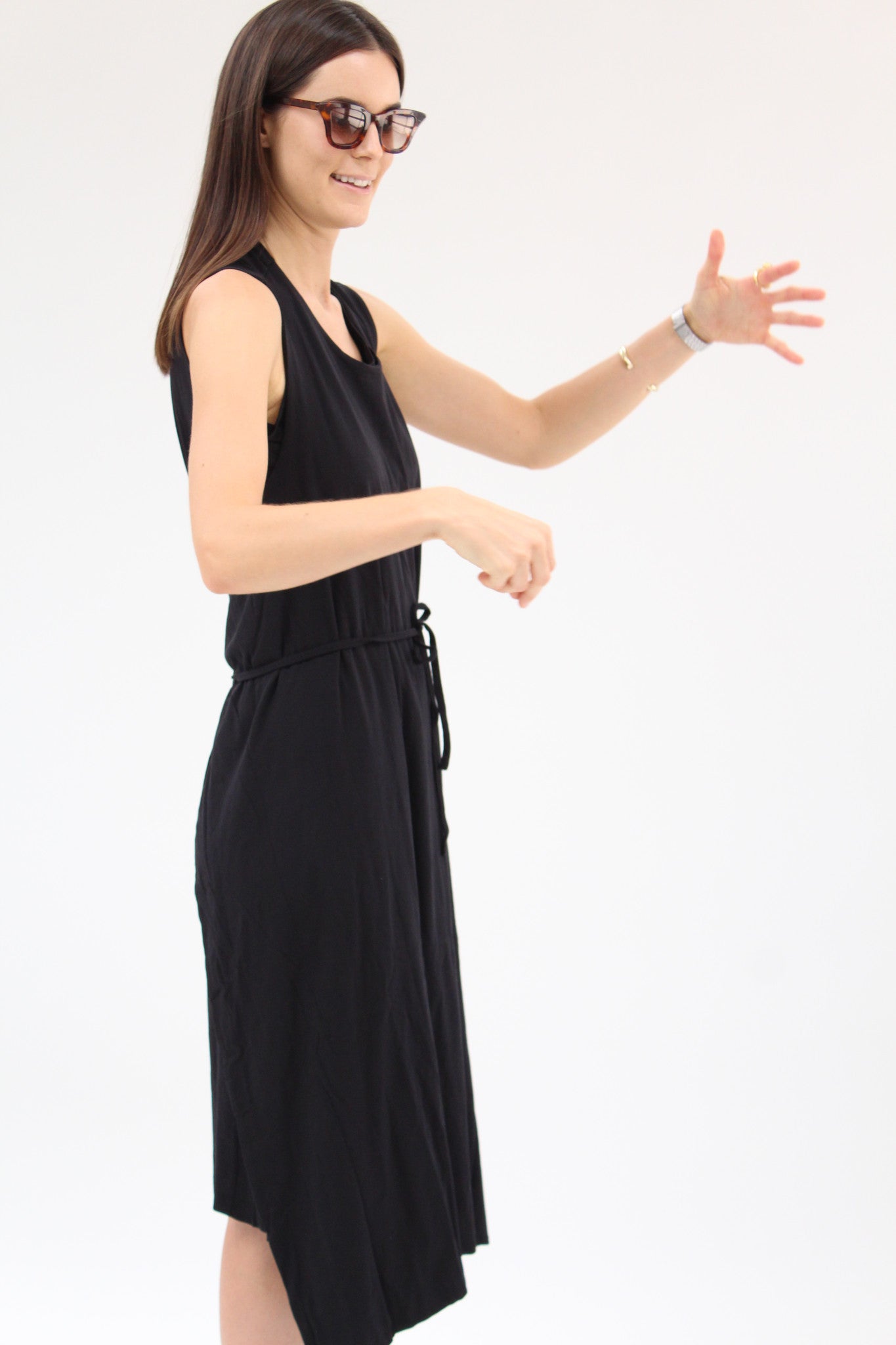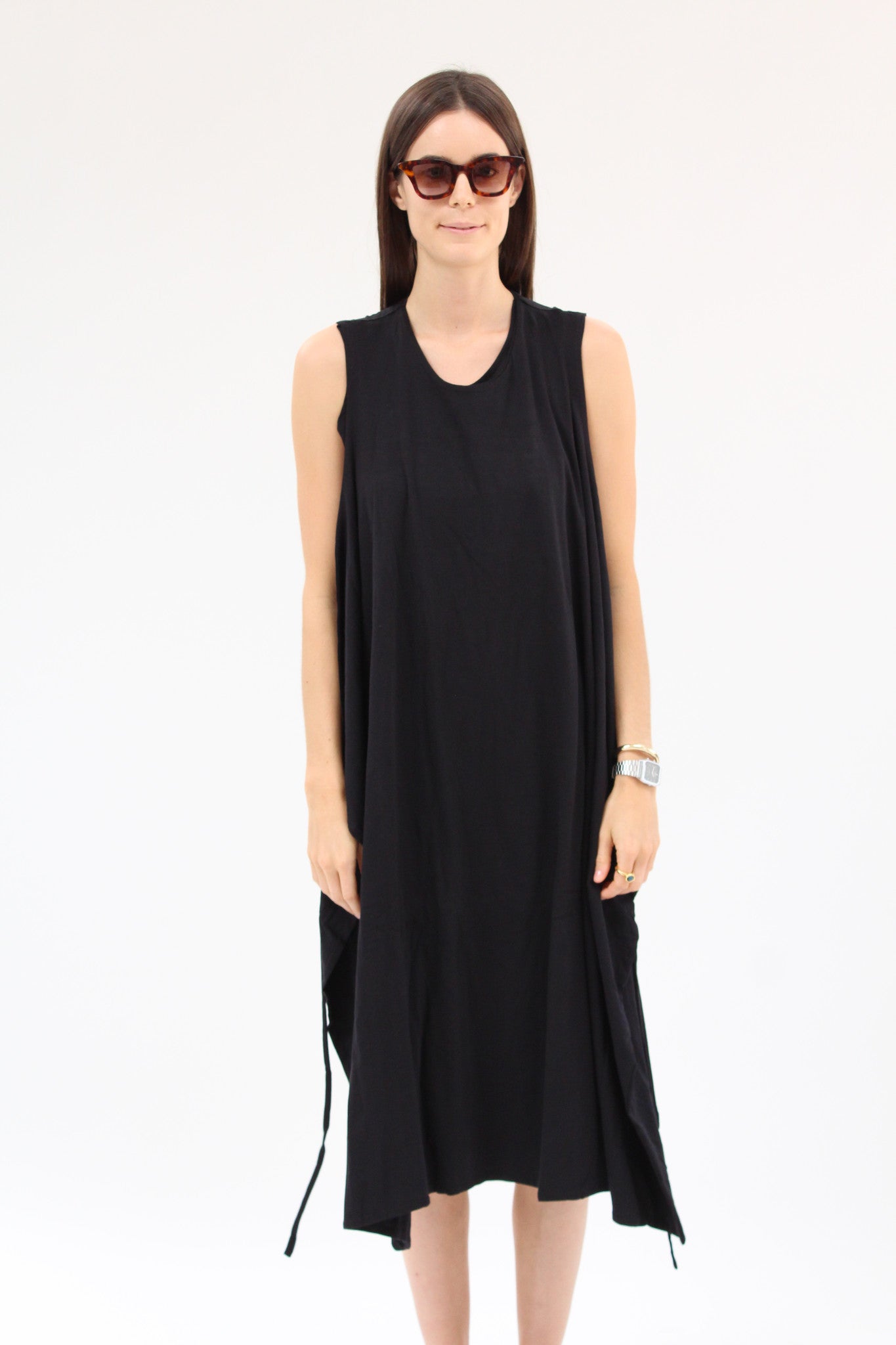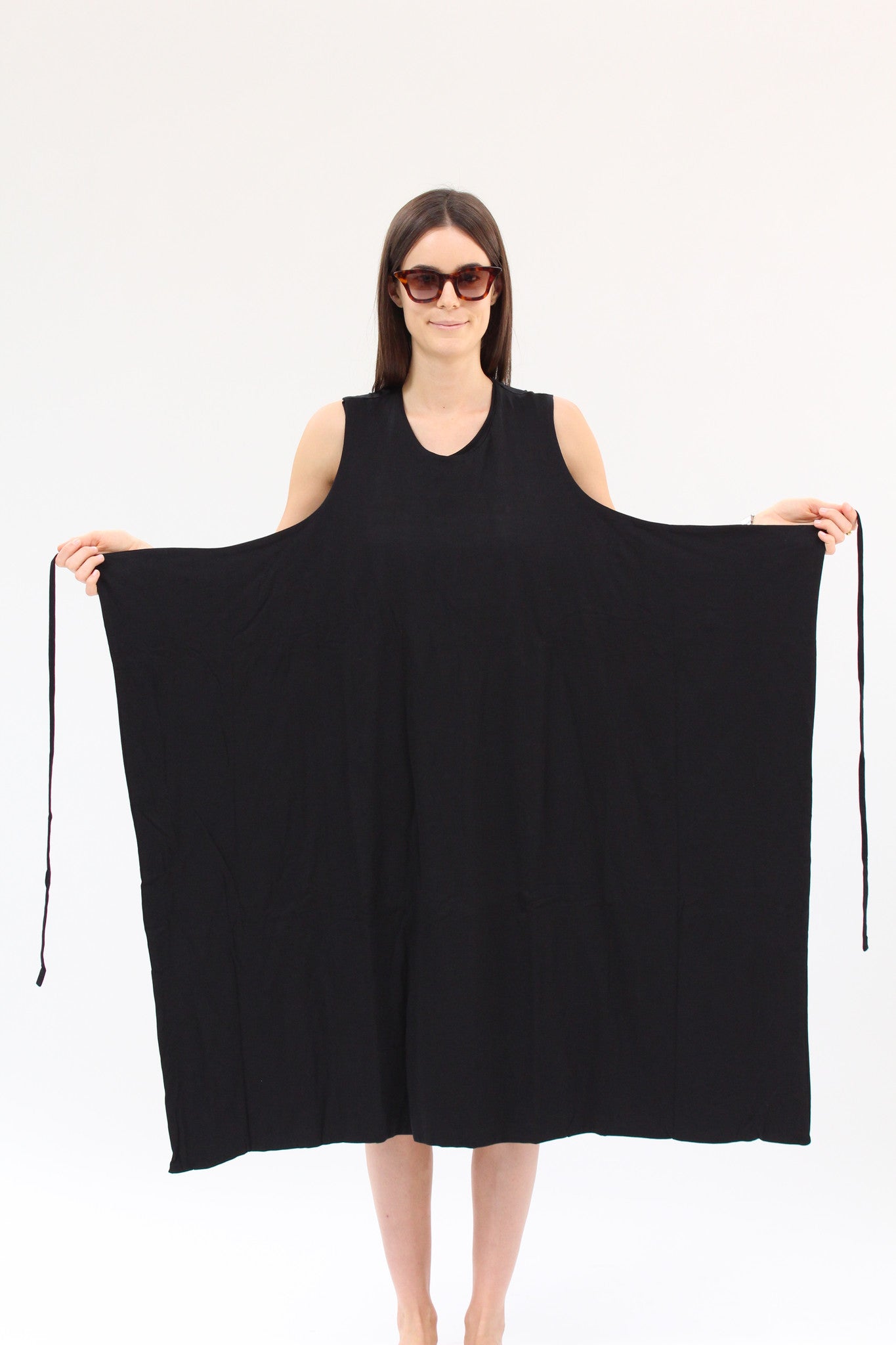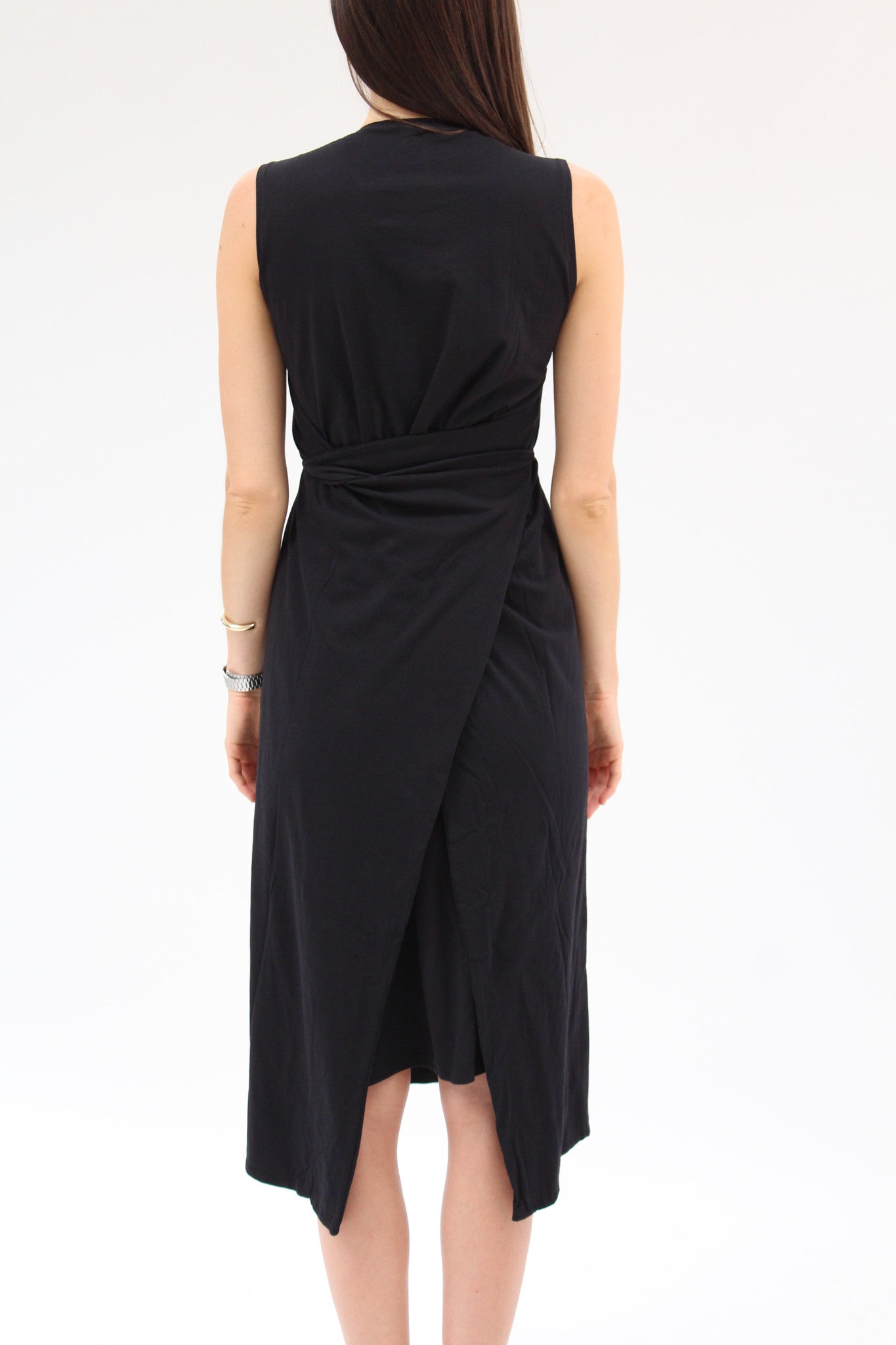 100% certified fair trade organic cotton jersey. Double layered, scoop neck dress, semi-fitted under dress & loose overlay wrap with ties. Versatile dress that can be worn at least 4 different ways! -adjustable front panel can be worn loose or tied, in the front or back.