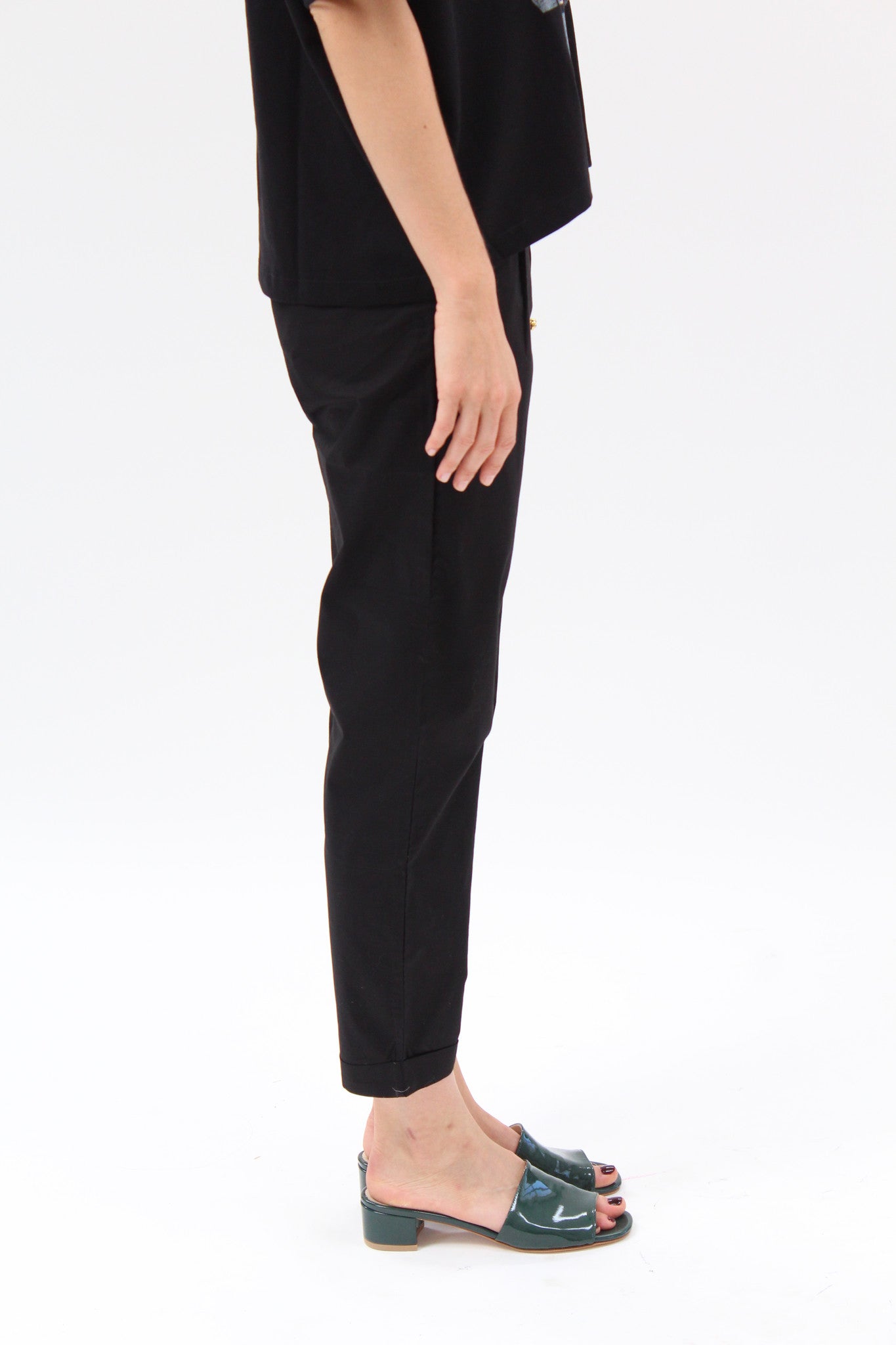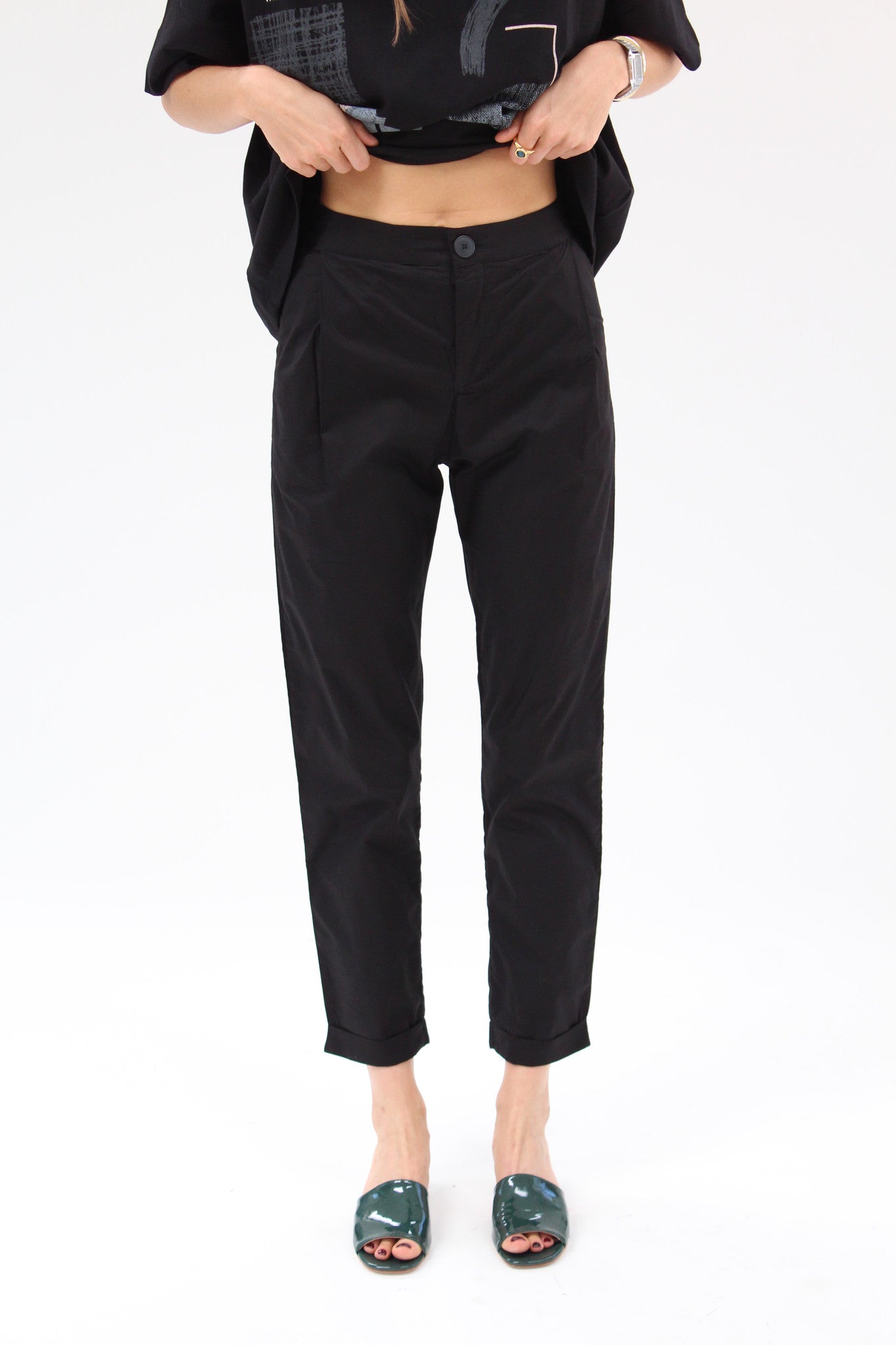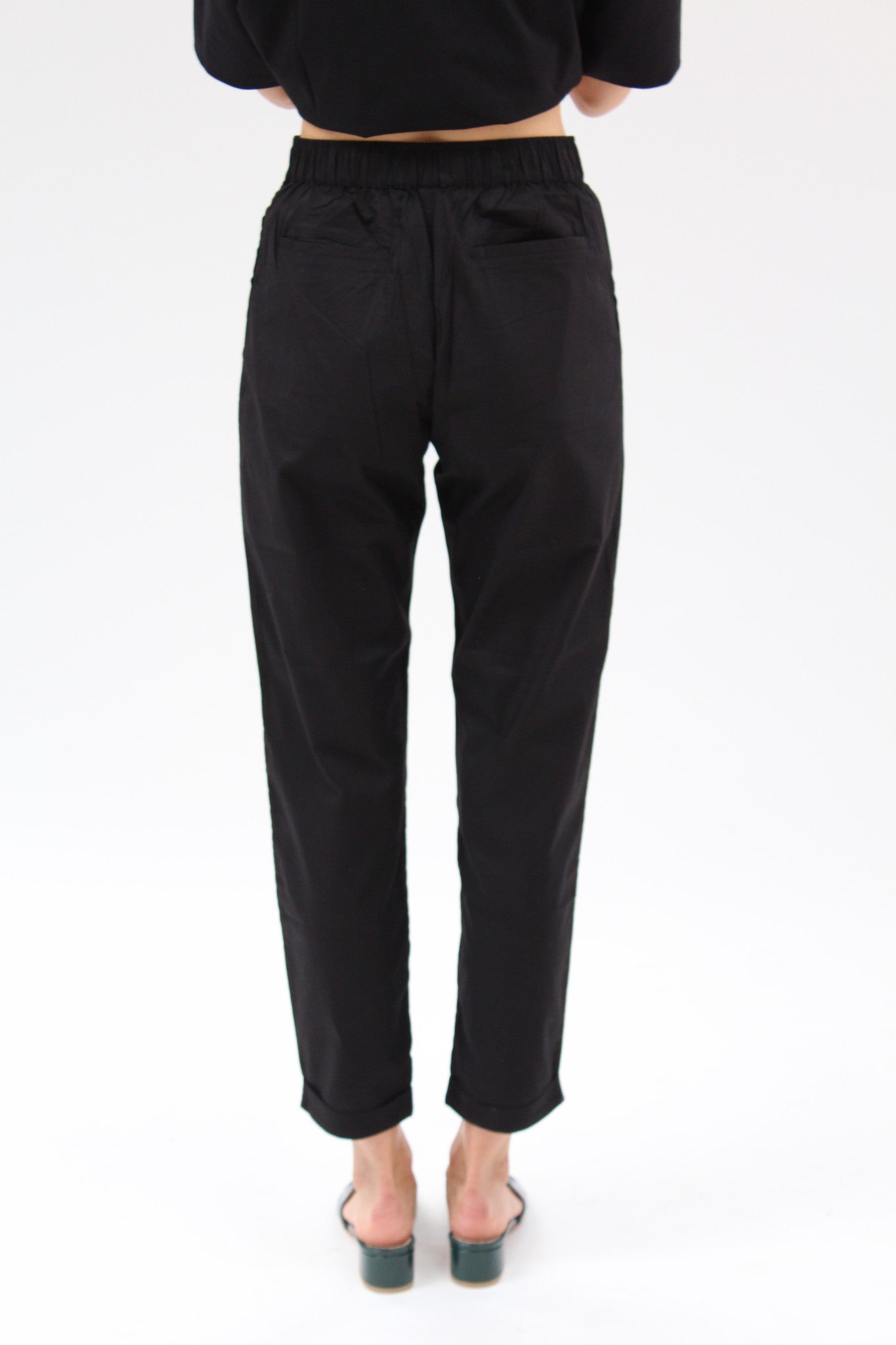 Slim fit pant with button fly front, elasticated back waistband & cuffed hem. Side seam welt & back welt pockets. 100% certified fair trade organic cotton poplin. Italian made recycled hemp buttons. Running true to size. Abigail is wearing size small and she is 5 9"