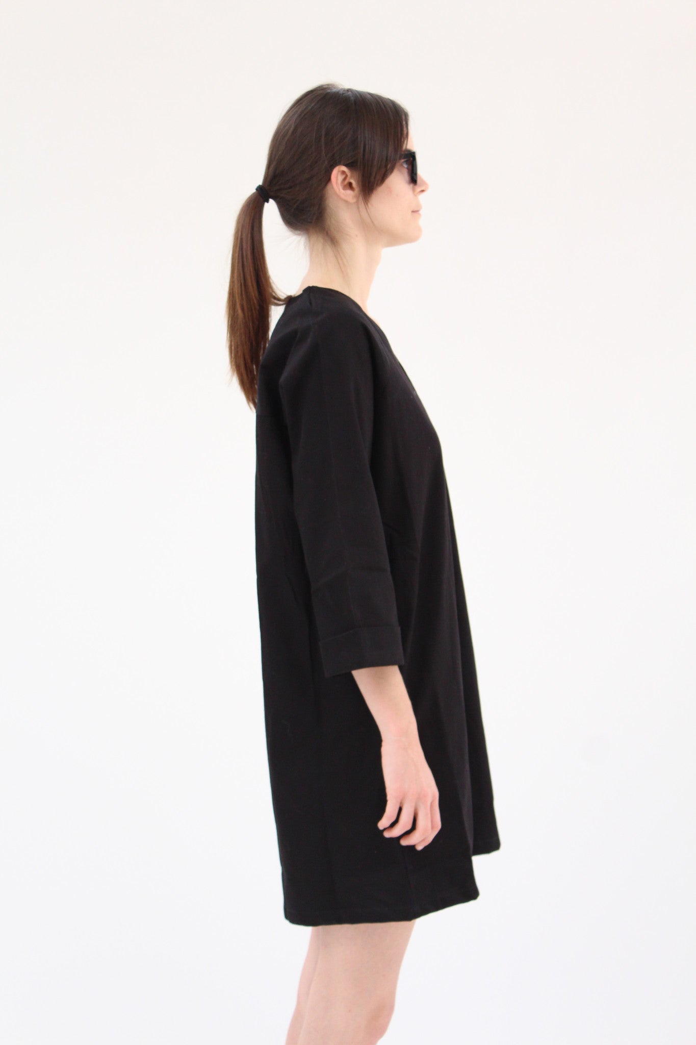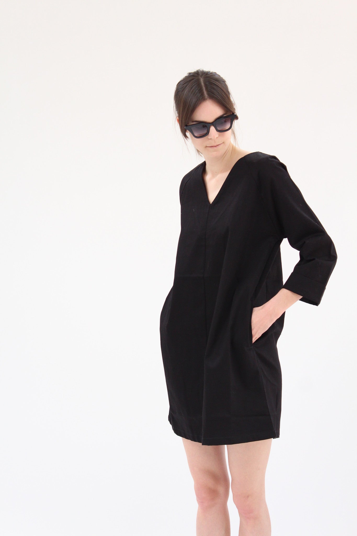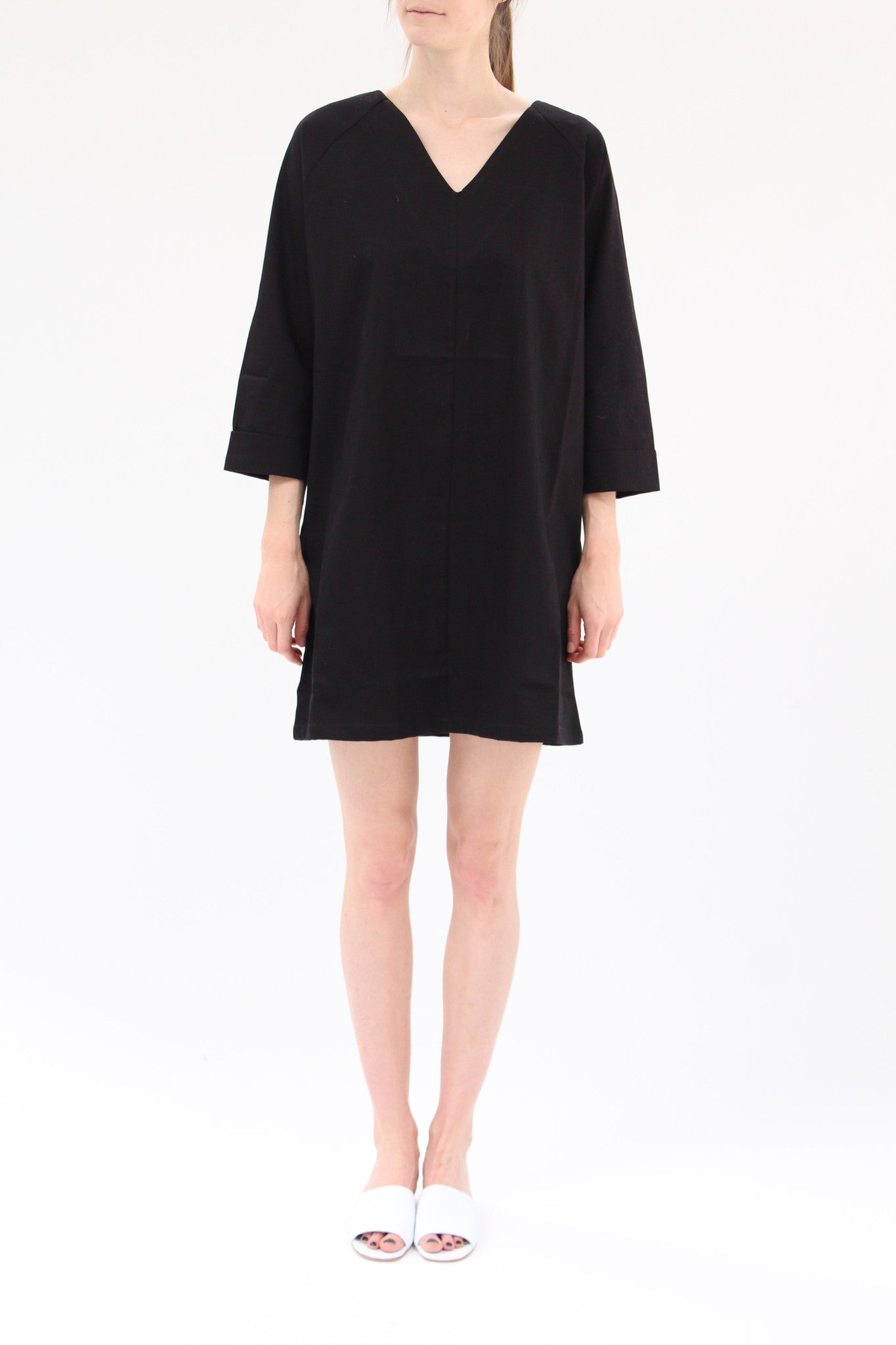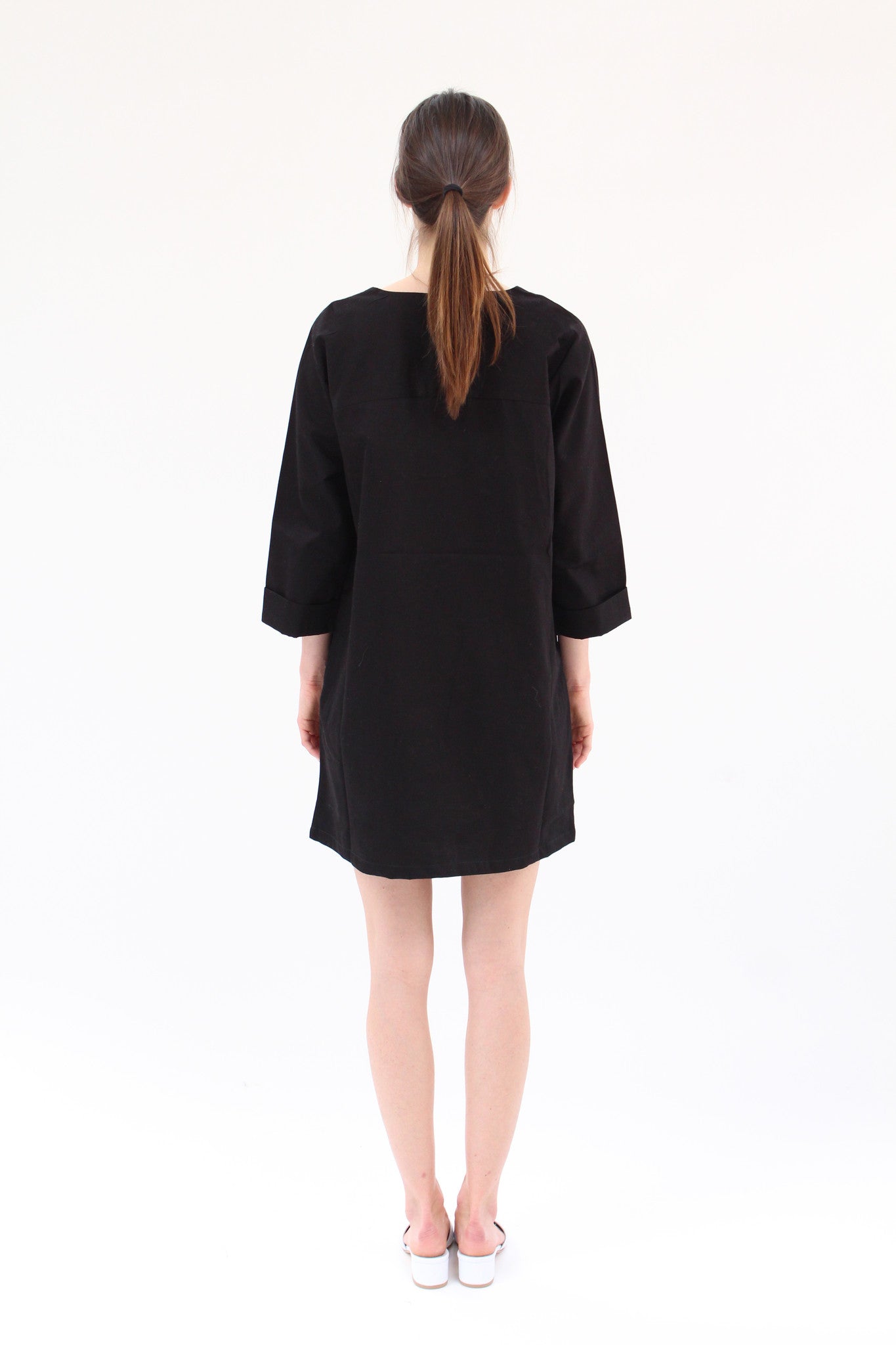 Straight, loose fit, raglan sleeve dress with v-neck, side welt pockets and turn-up sleeve cuffs. 100% premium certified organic fair trade cotton twill. 36” total length