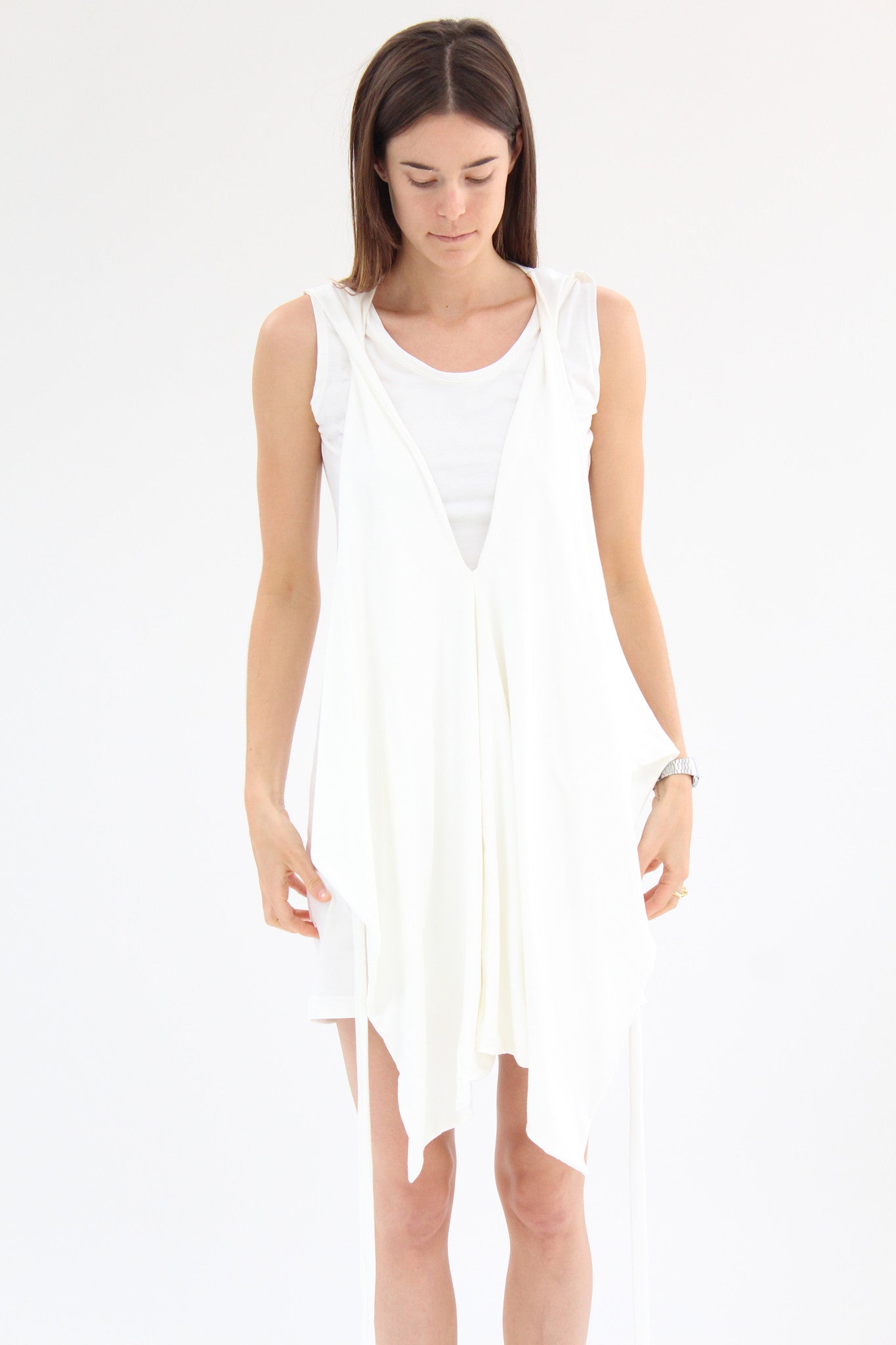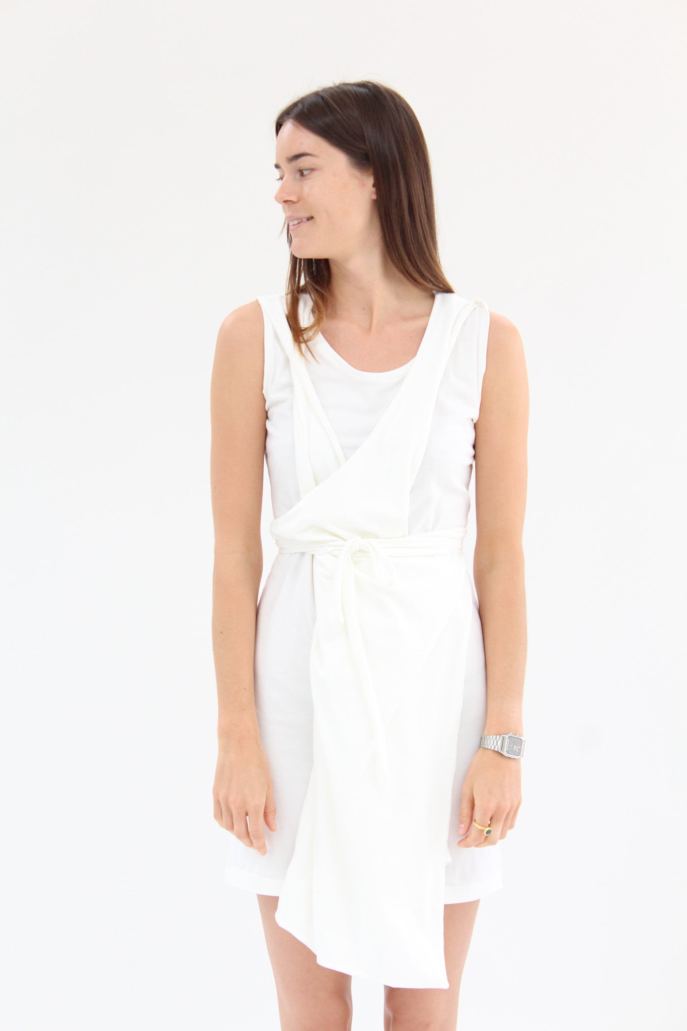 100% organic cotton jersey dress, fiber-reactive dyed, double layered, scoop neck dress, semi-fitted under dress with loose overlay criss-cross wrap with ties. Versatile dress that can be worn at least 4 different ways! -adjustable front panel can be worn loose or tied, in the front or back.