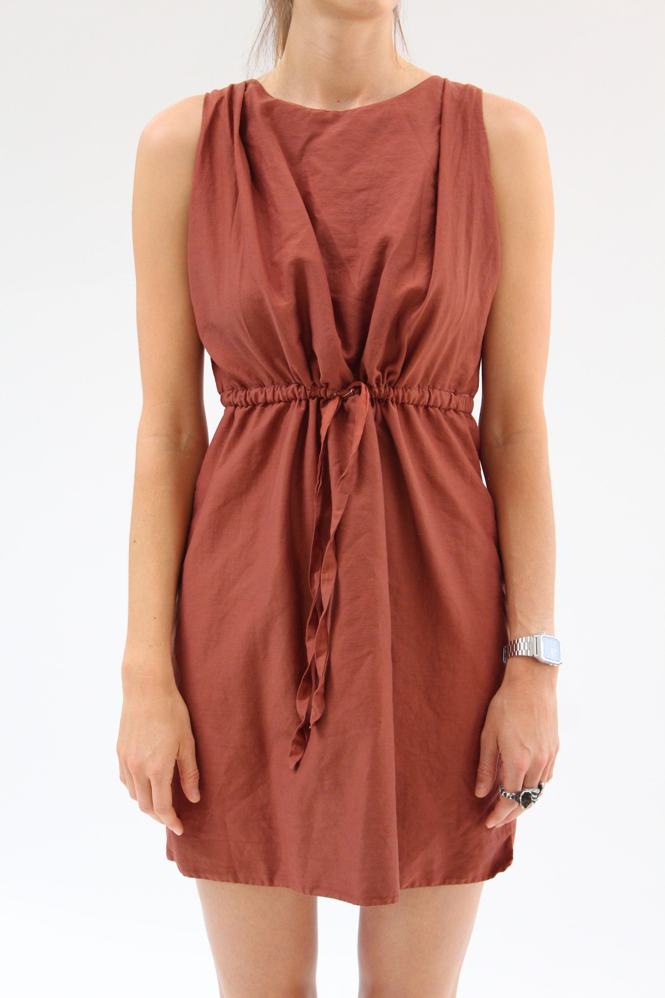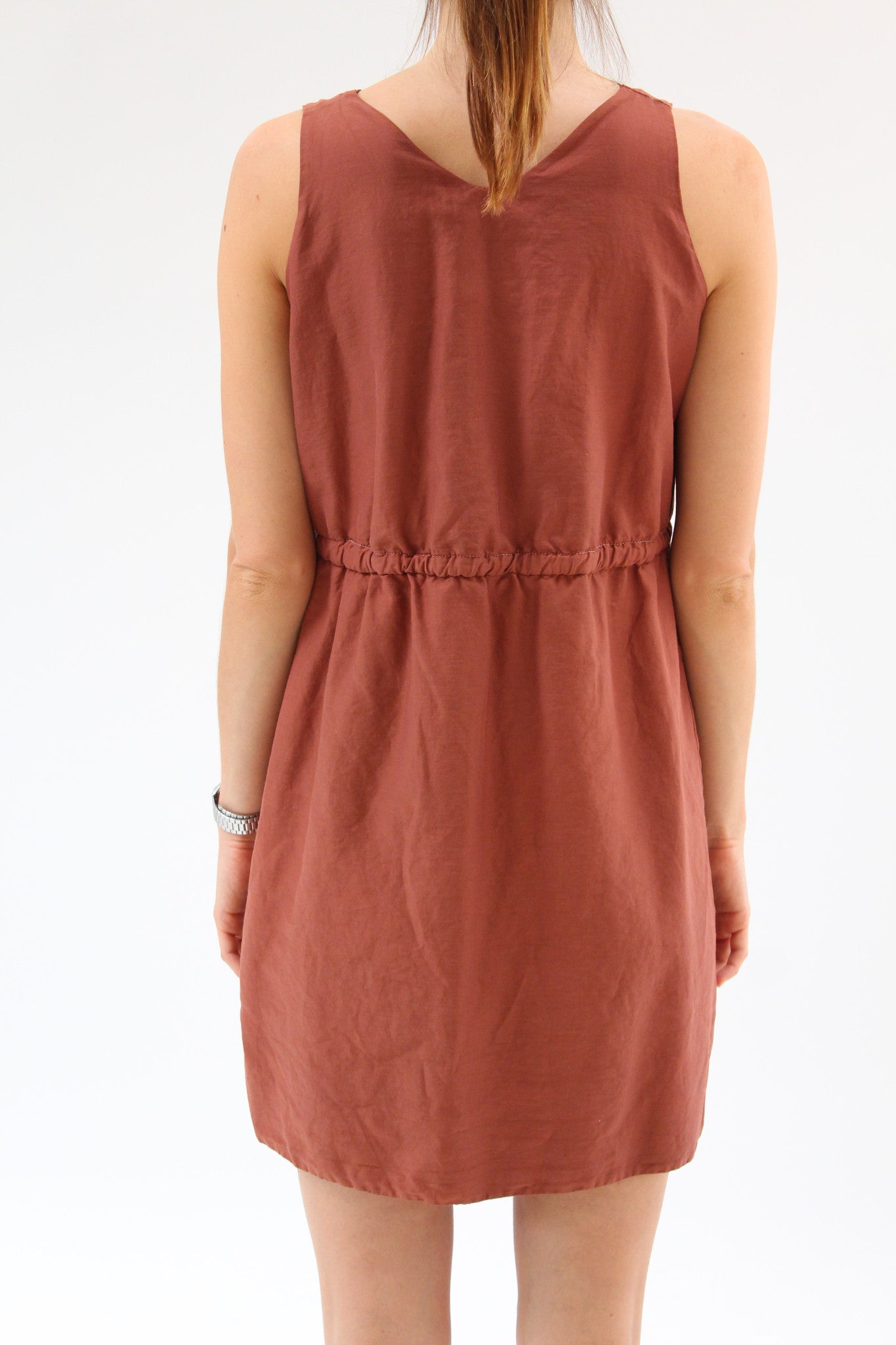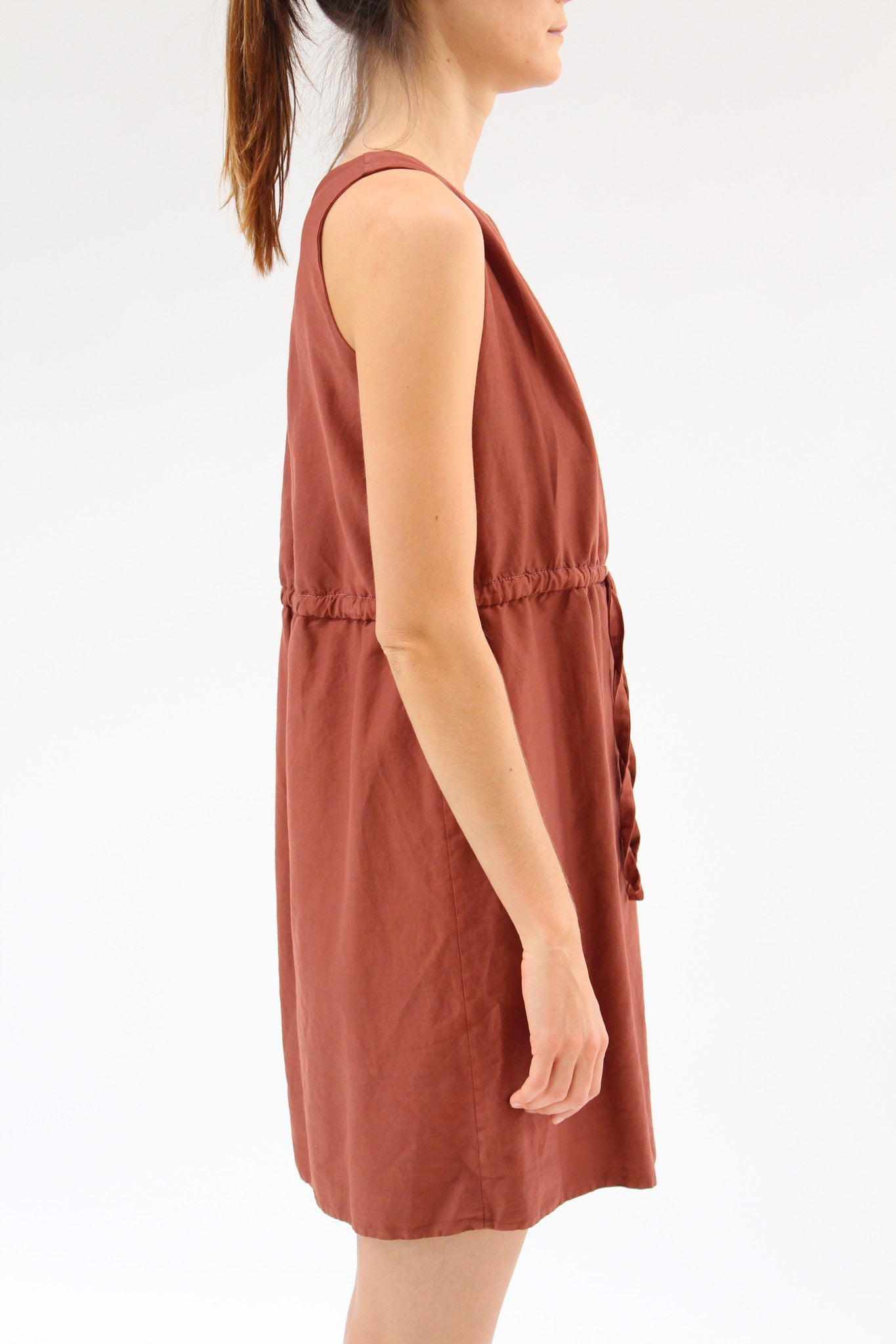 100% organic cotton woven, double layer dress black inner and outer, slip on style, slit at hem, loose and comfortable. Folded pleat detail at neckline, all enclosed seams, now with waist tie.