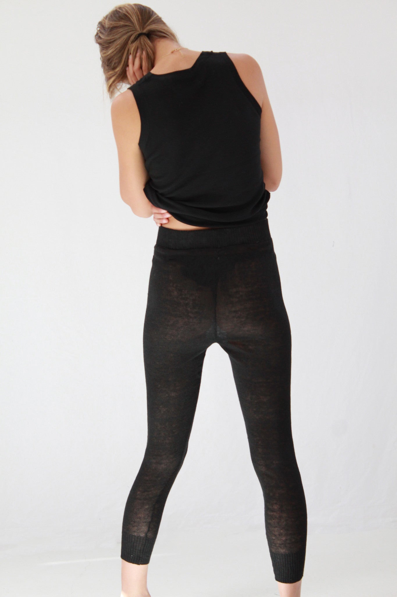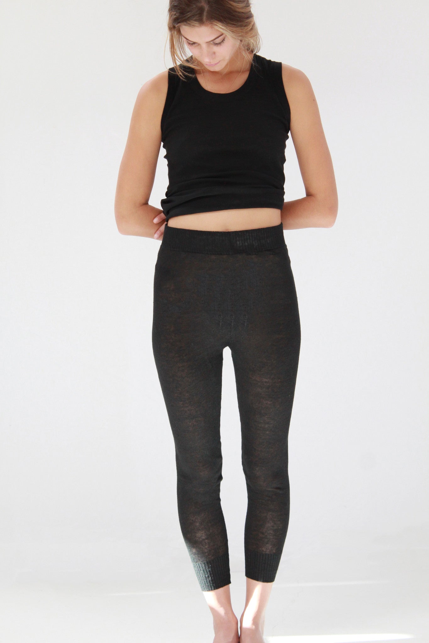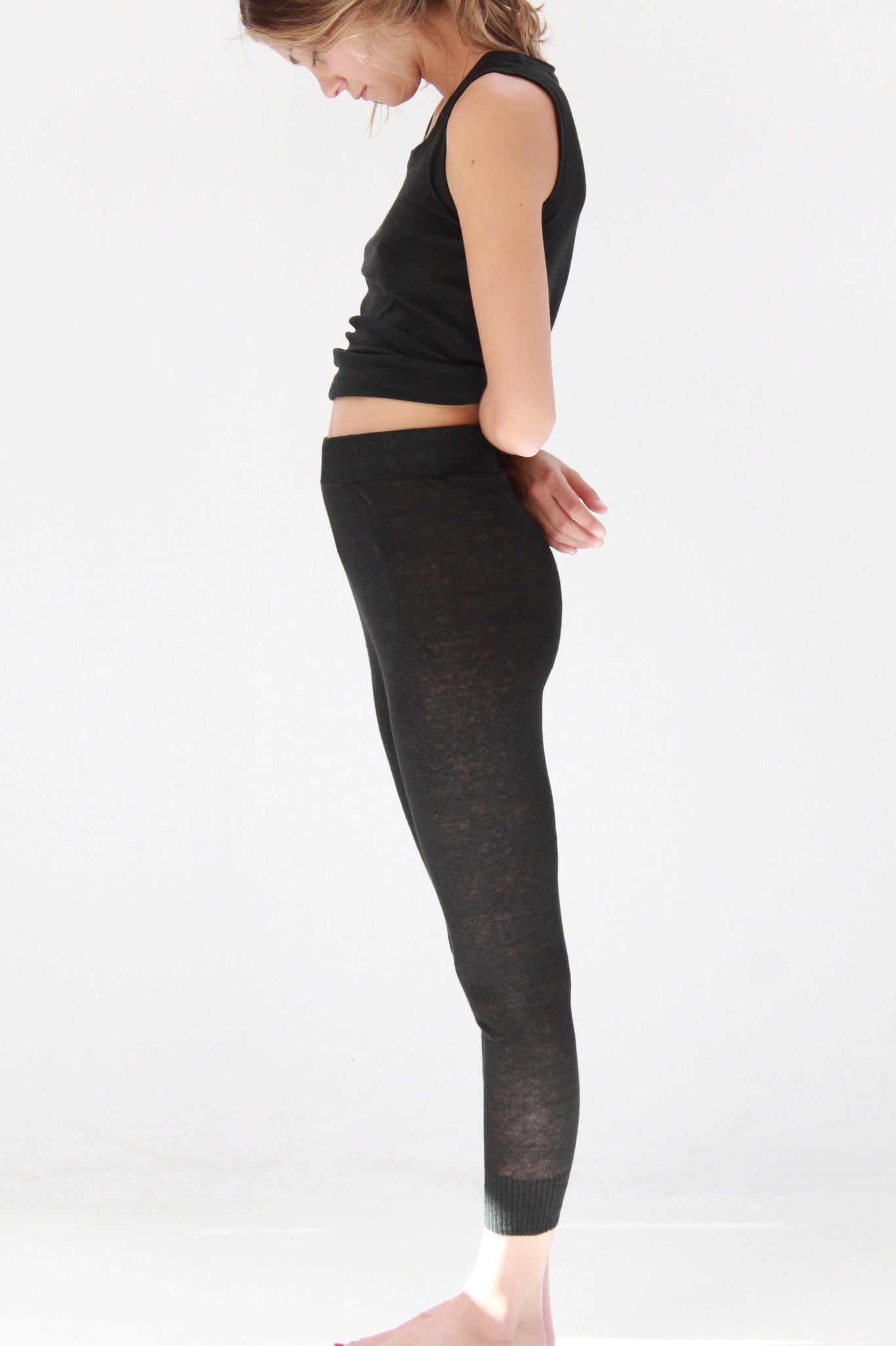 100% linen knit sweats, 2" cuff, wide gentle elastic true waist. Machine washable, gentle cold. Available in black, white and spice. Exclusive to Beklina.