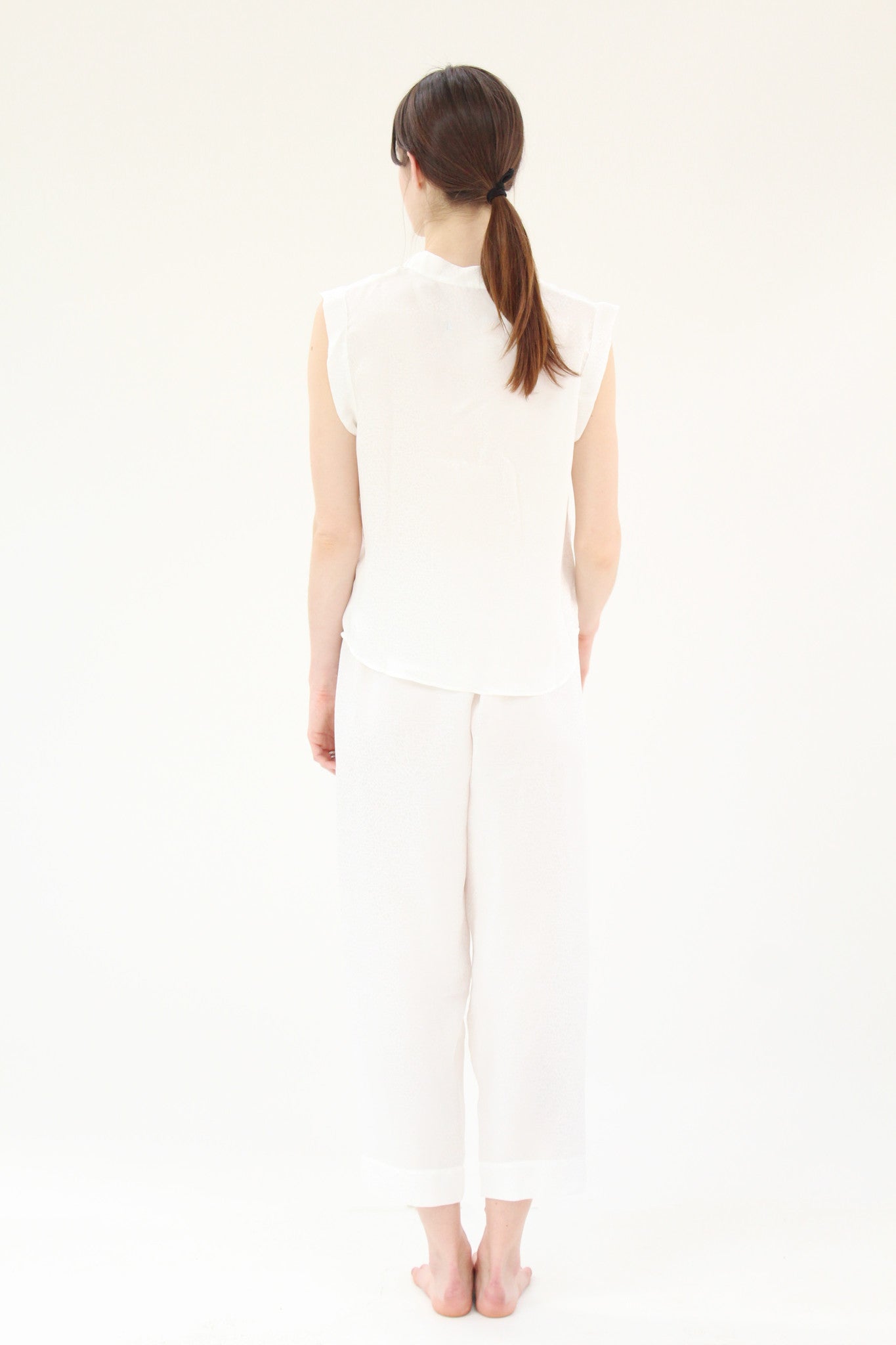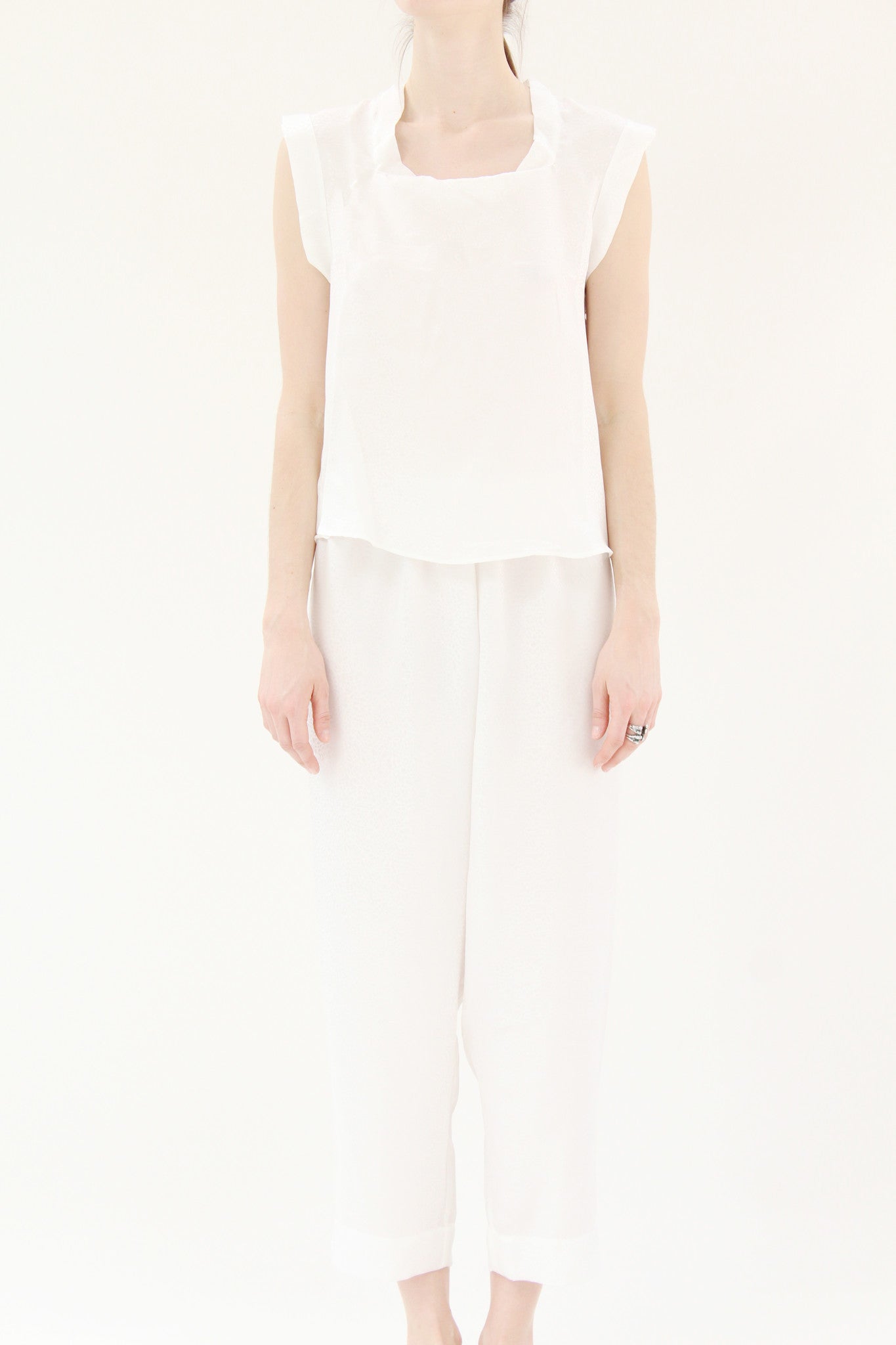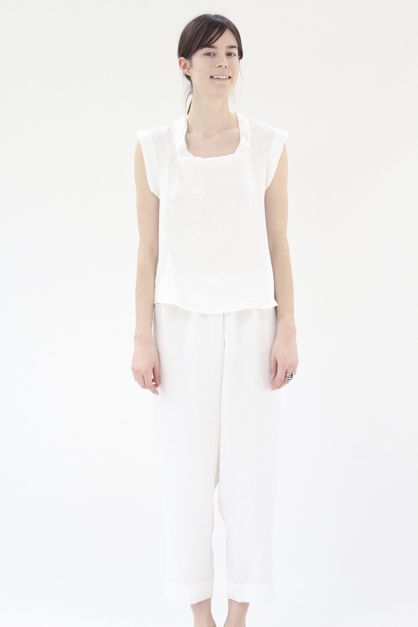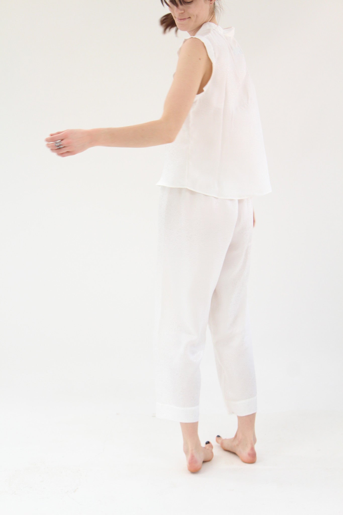 100% silk with white on white texture abstract woven print. Gentle and comfy elastic waist, loose fit, running true to size. Mock collar avant-garde neckline, sleeveless. Detailed hand made construction. I live in mine!