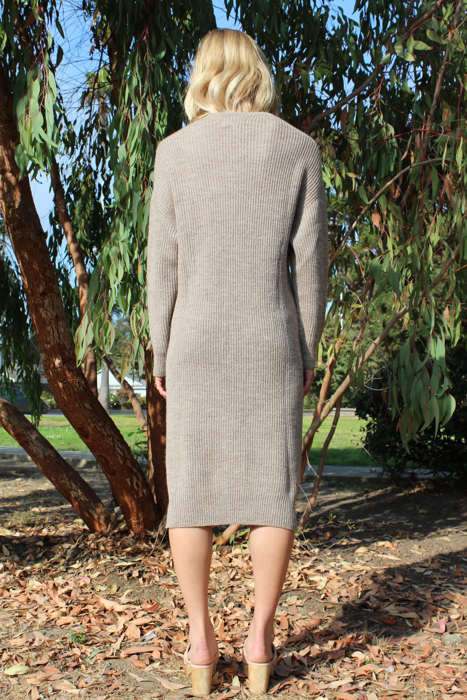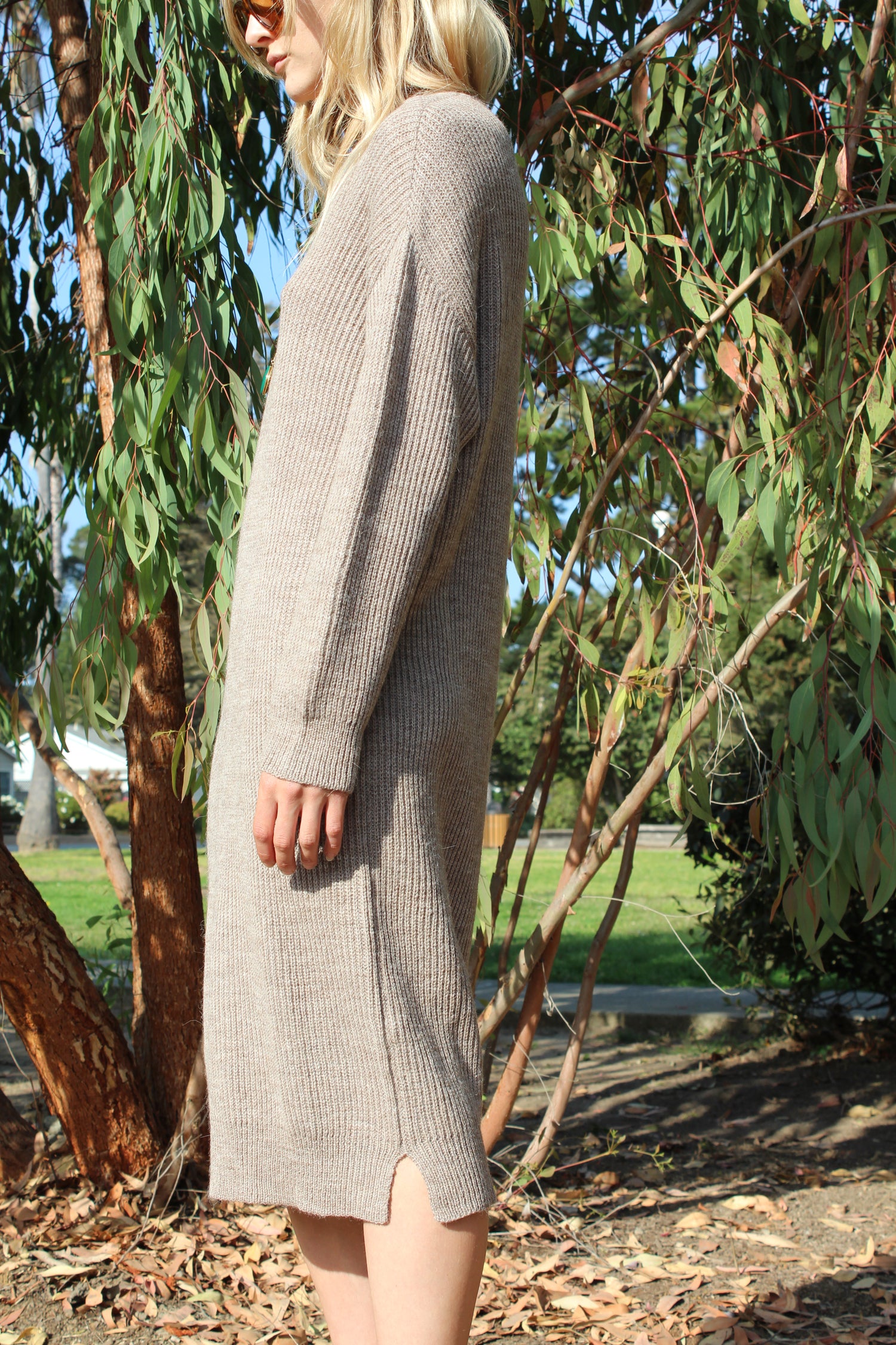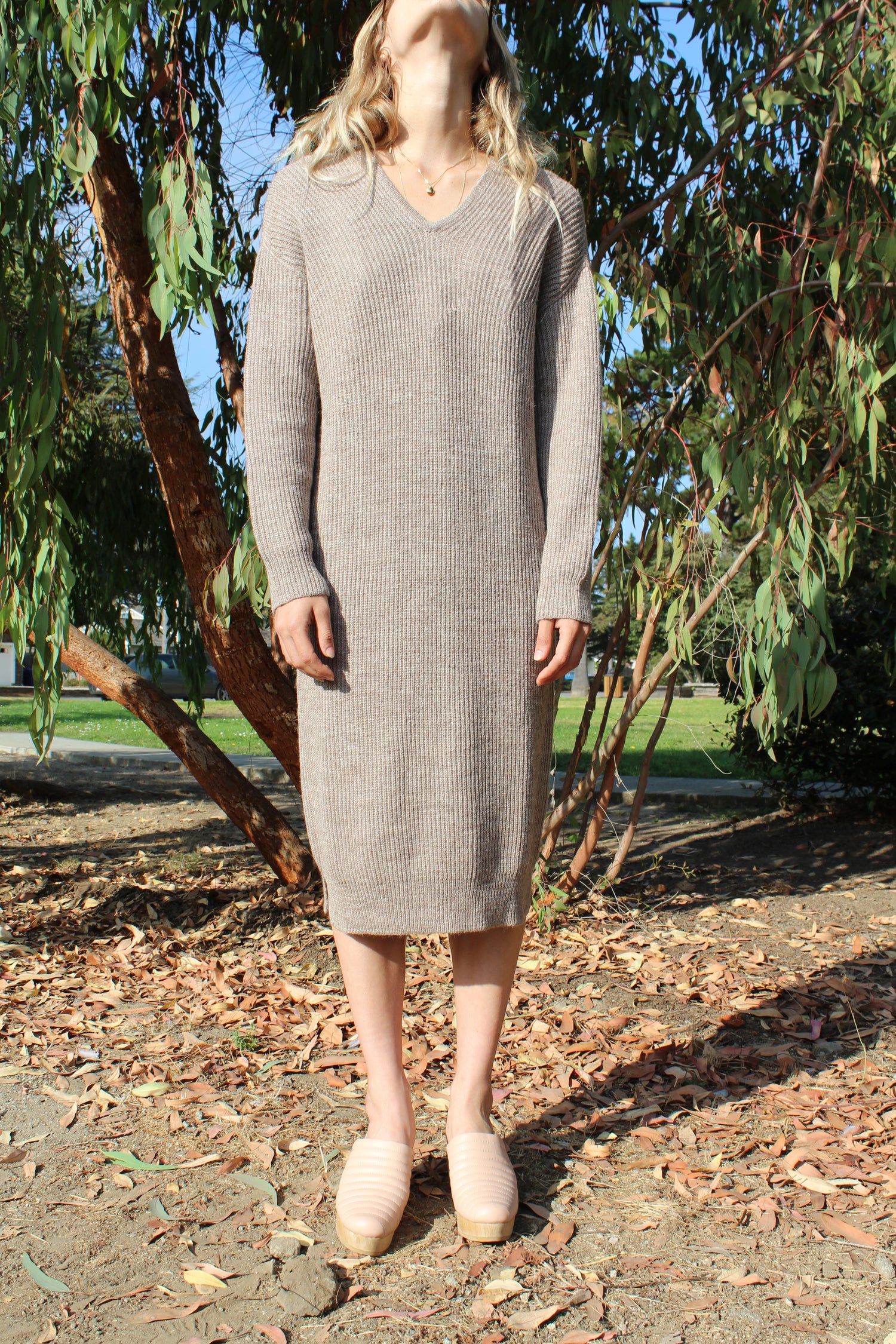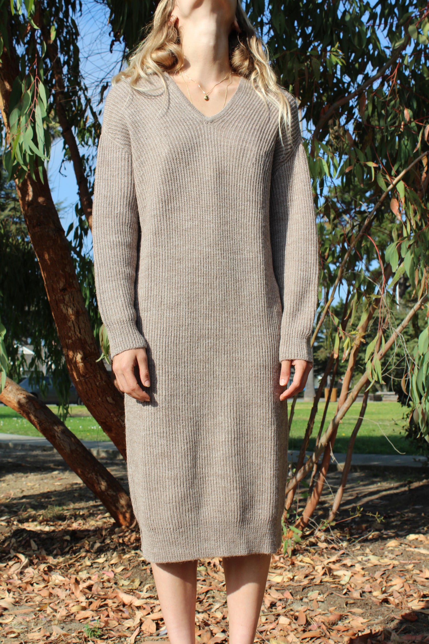 Relaxed fit ribbed sweater dress in camel-brown alpaca wool with slight v-neck and slits at bottom of side seam. Runs true to size. Ultra soft 100% Alpaca
