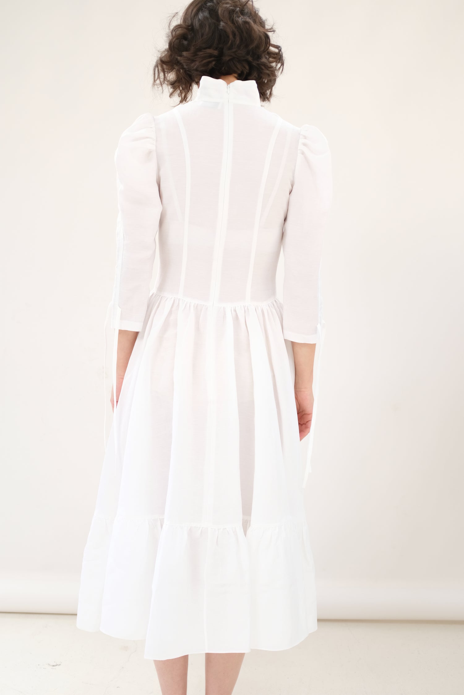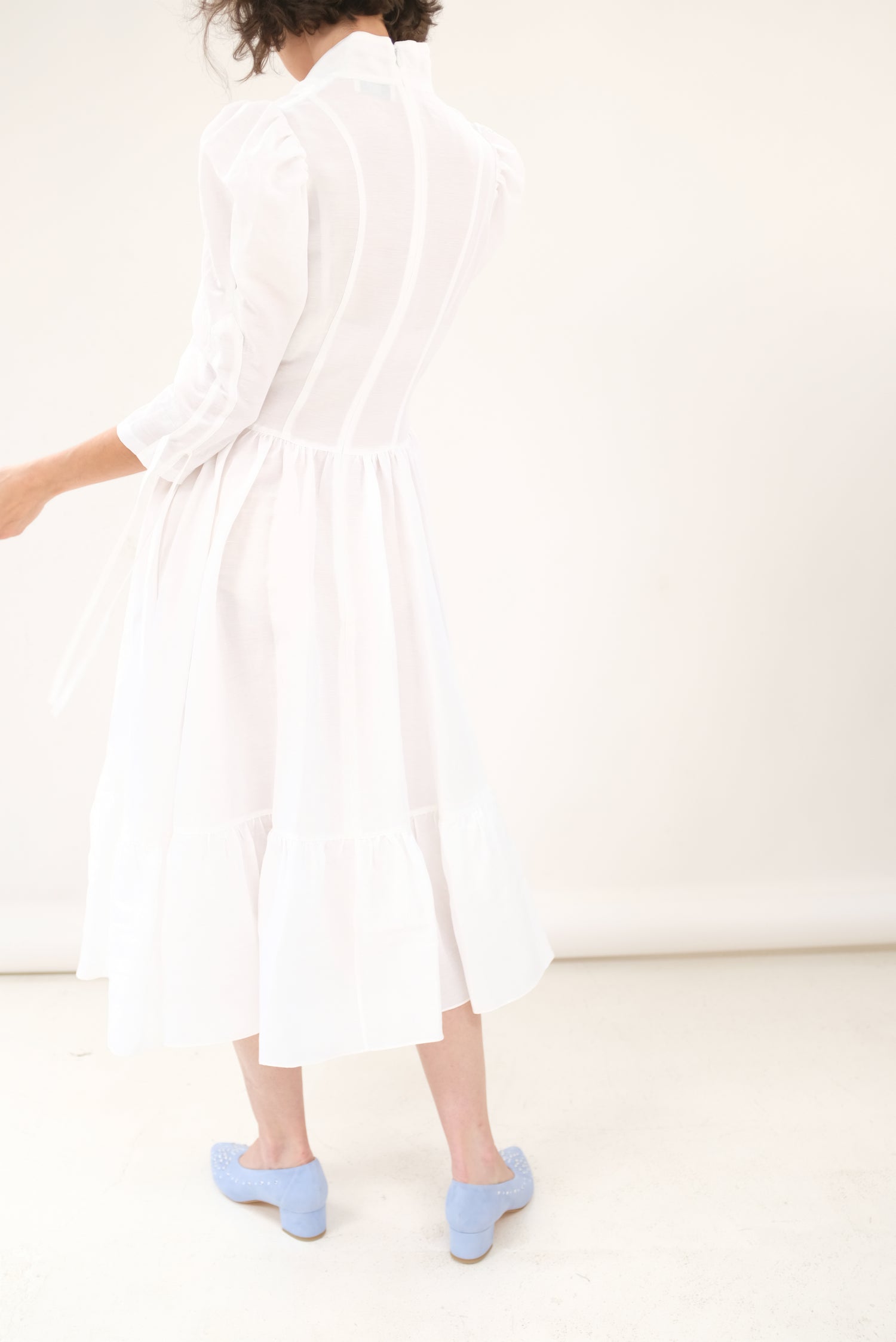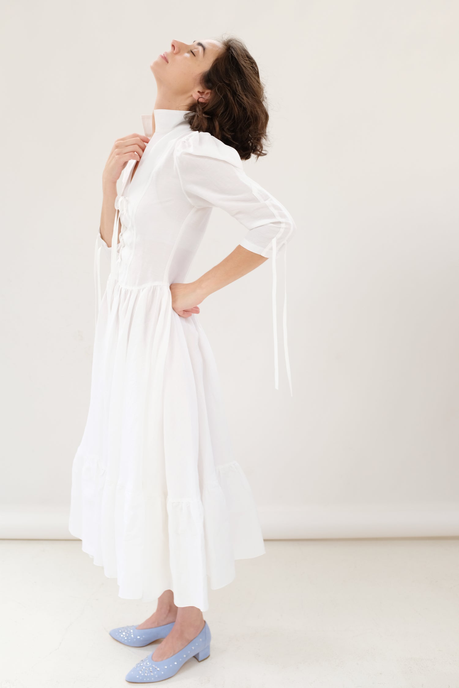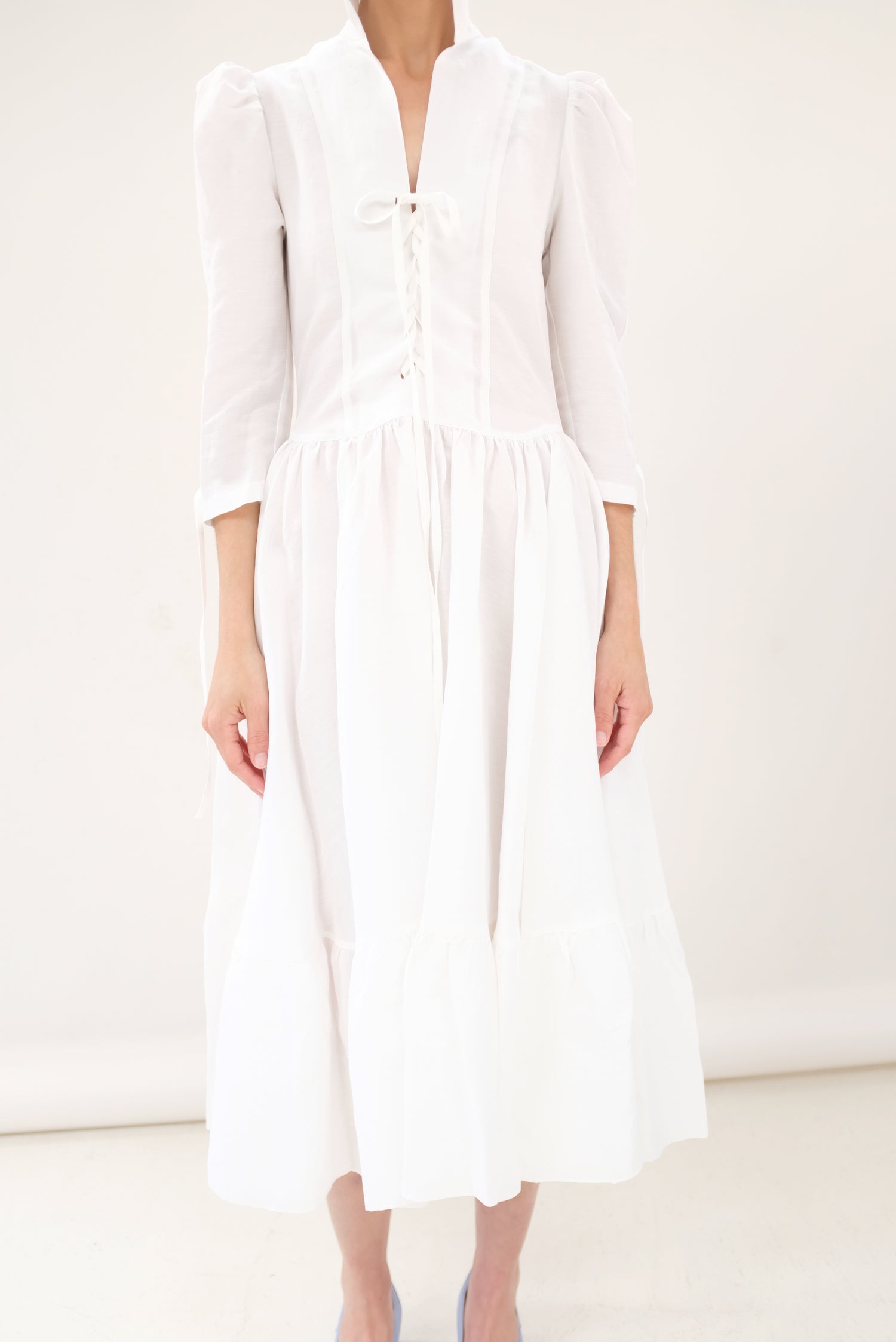 Gorgeous timeless Victorian-style linen dress with a lace up front. Drop waist skirt, large ruffle at hem. 3/4 length sleeves, ties at cuff. Concealed zipper at back. Total length from shoulder to hem is 47" Runs true to size.