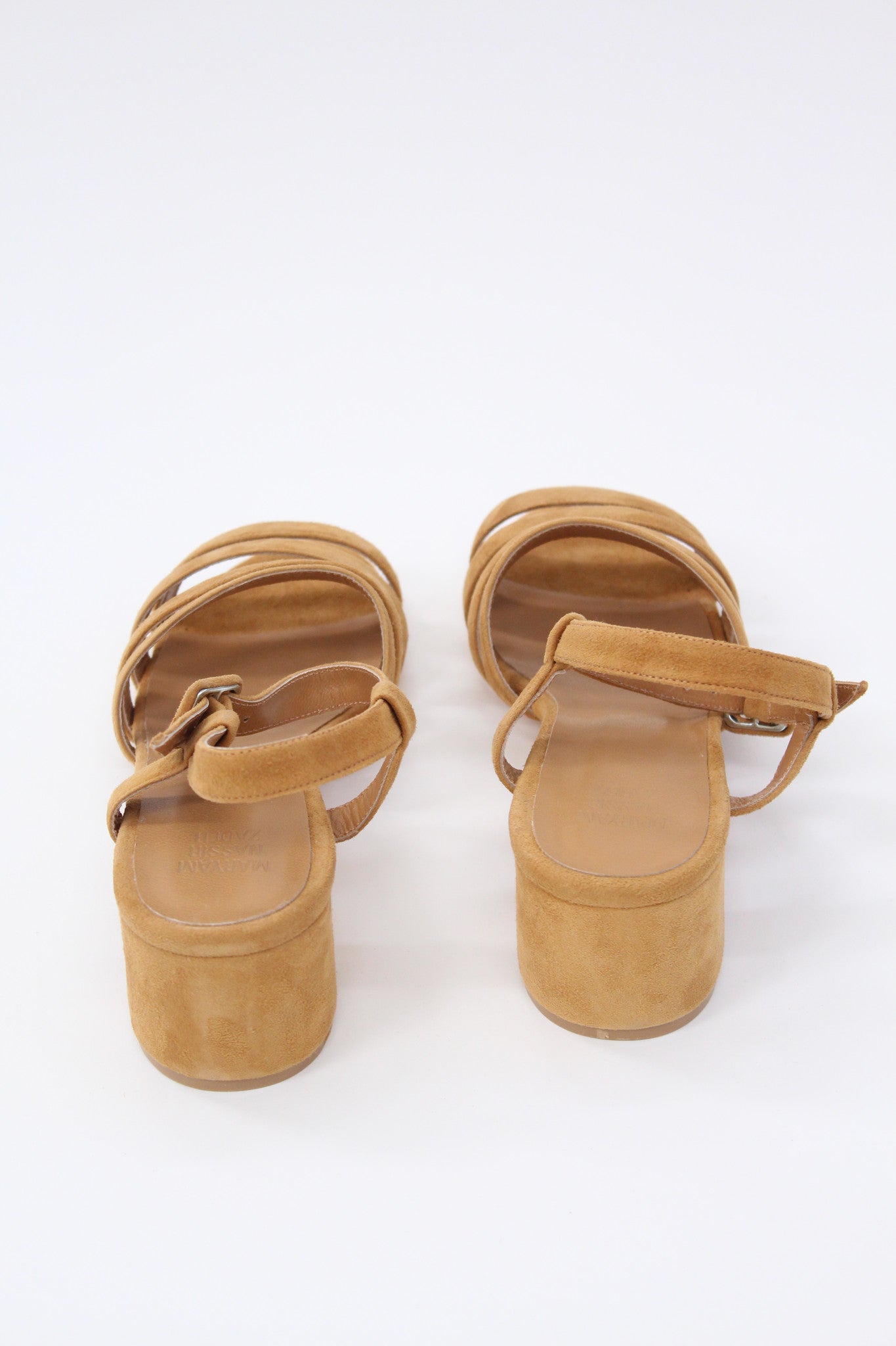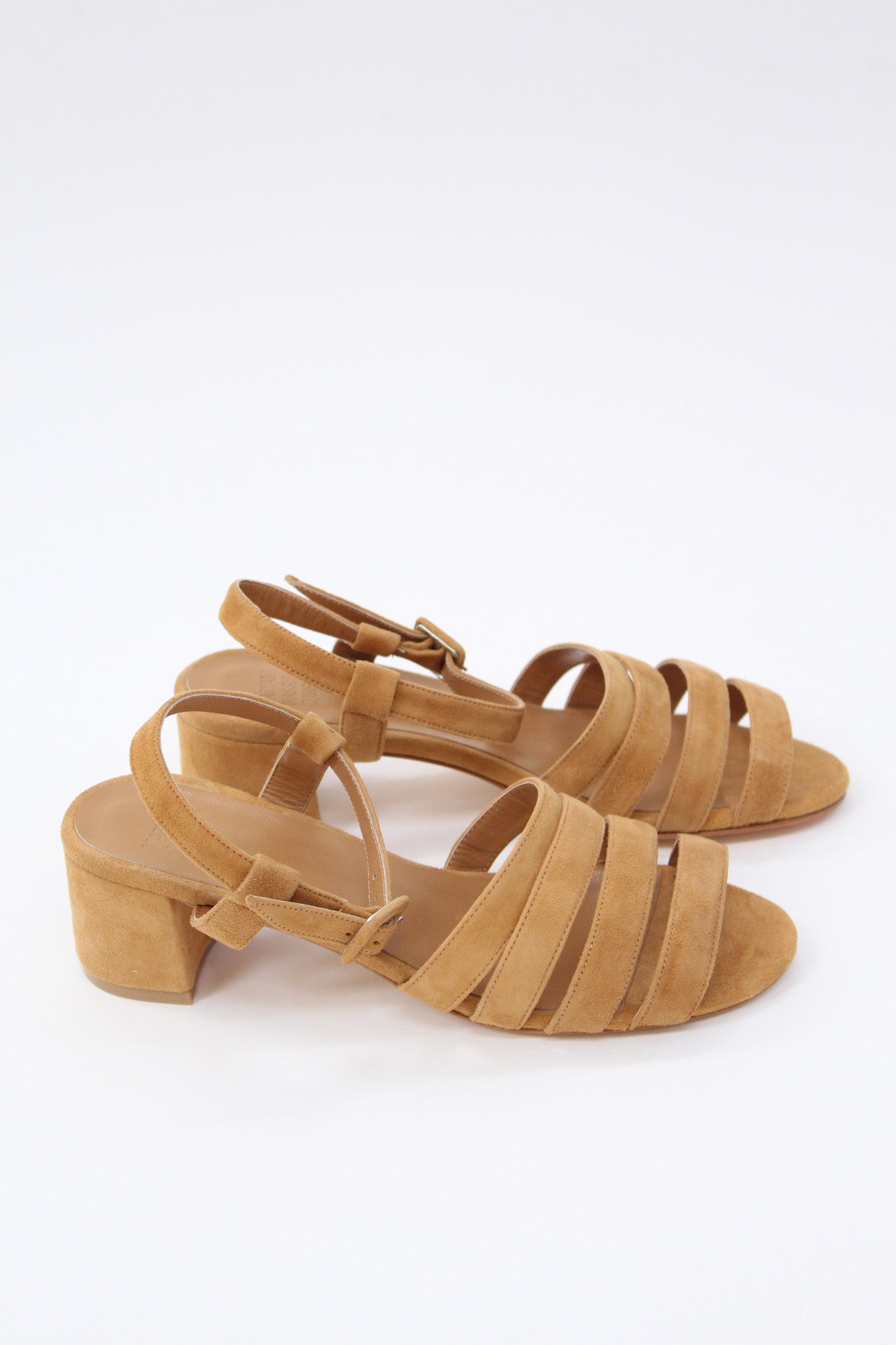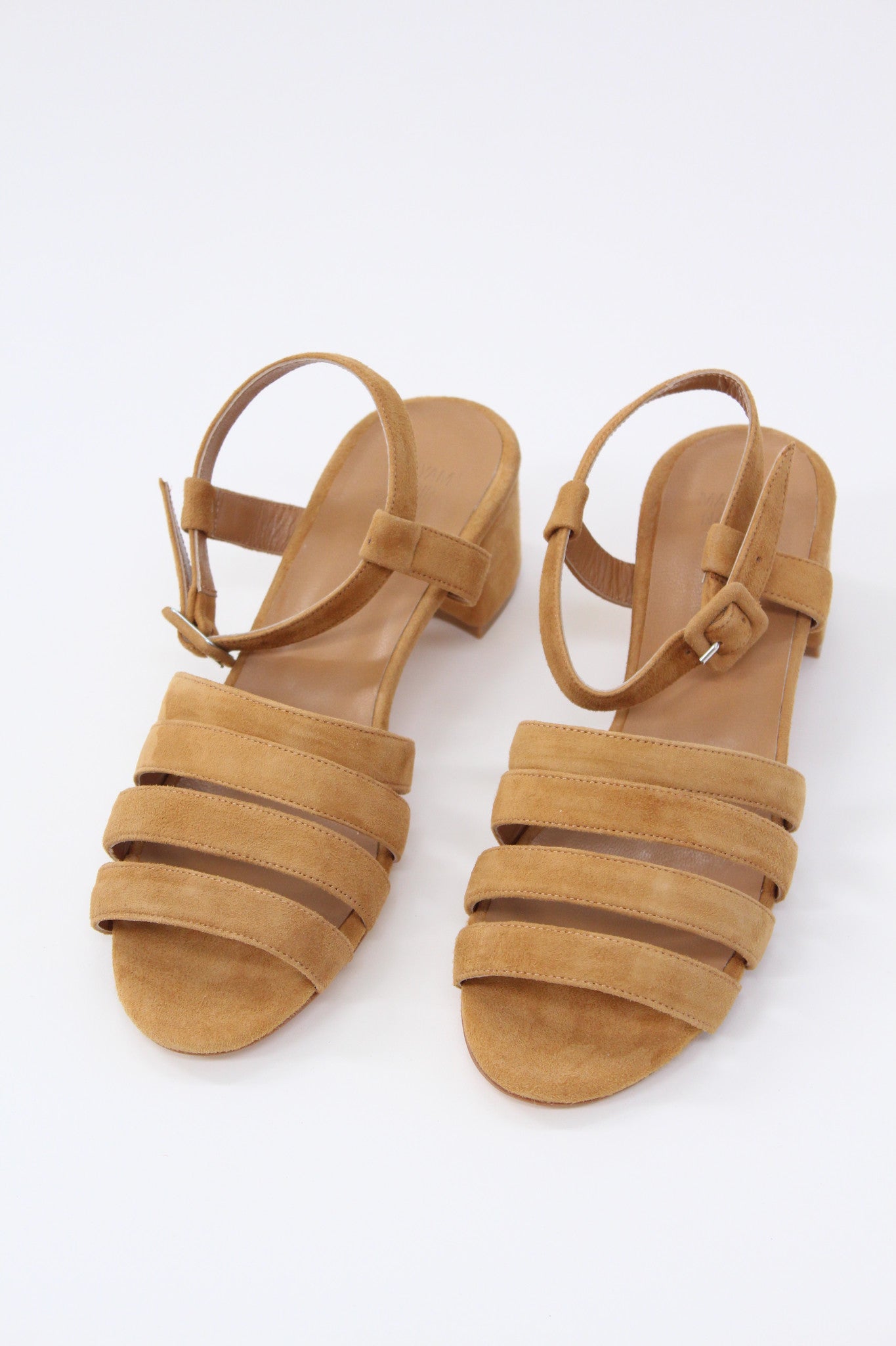 Low heeled suede leather sandal with leather insole and interior, 2" heel. Four thin straps across the toes and adjustable ankle strap. Fits true to size.