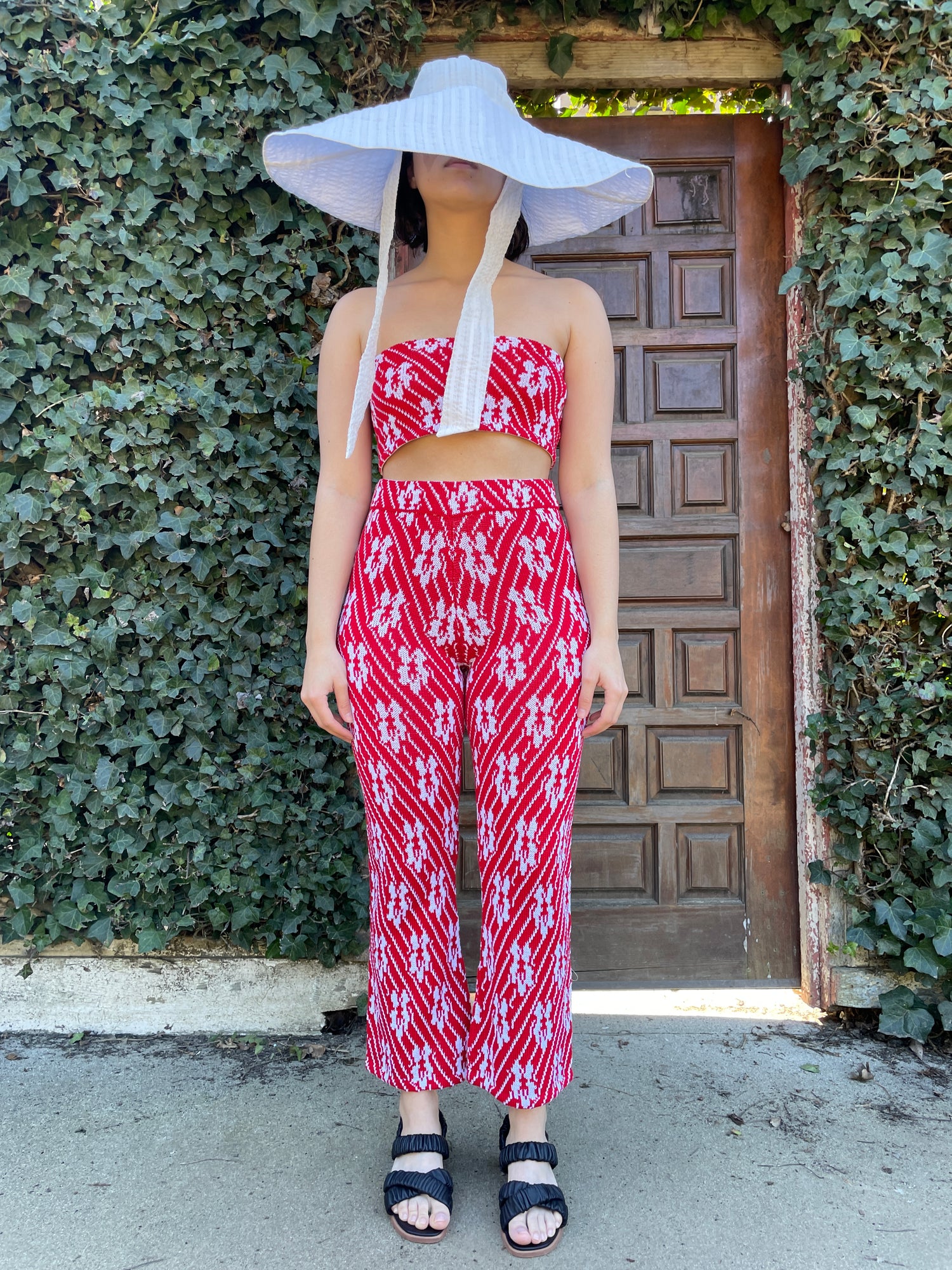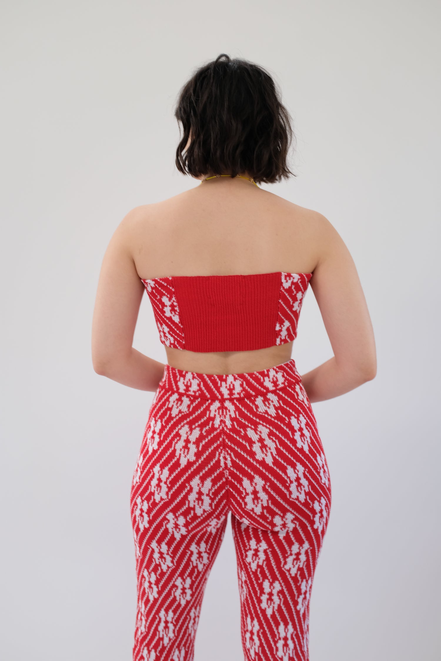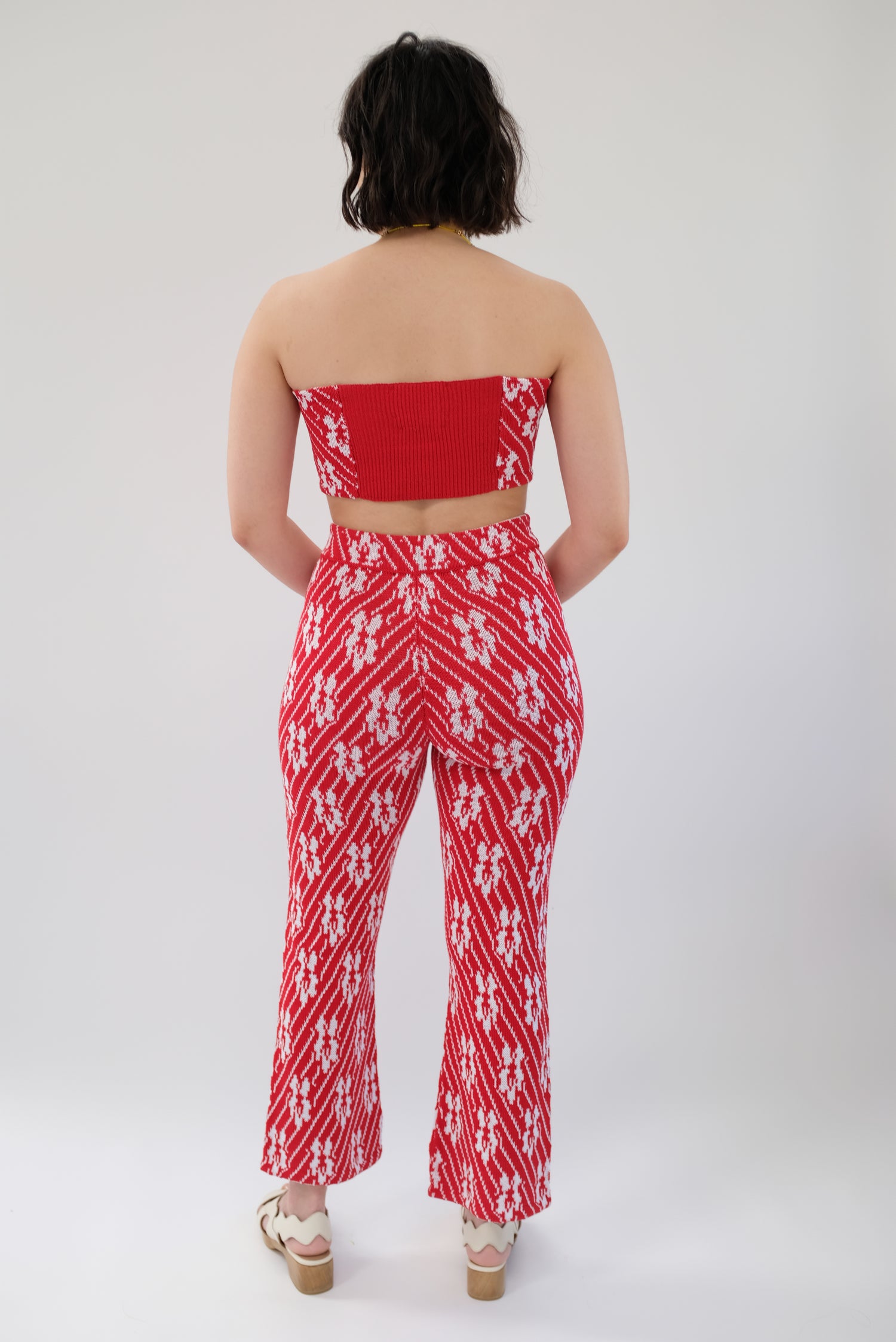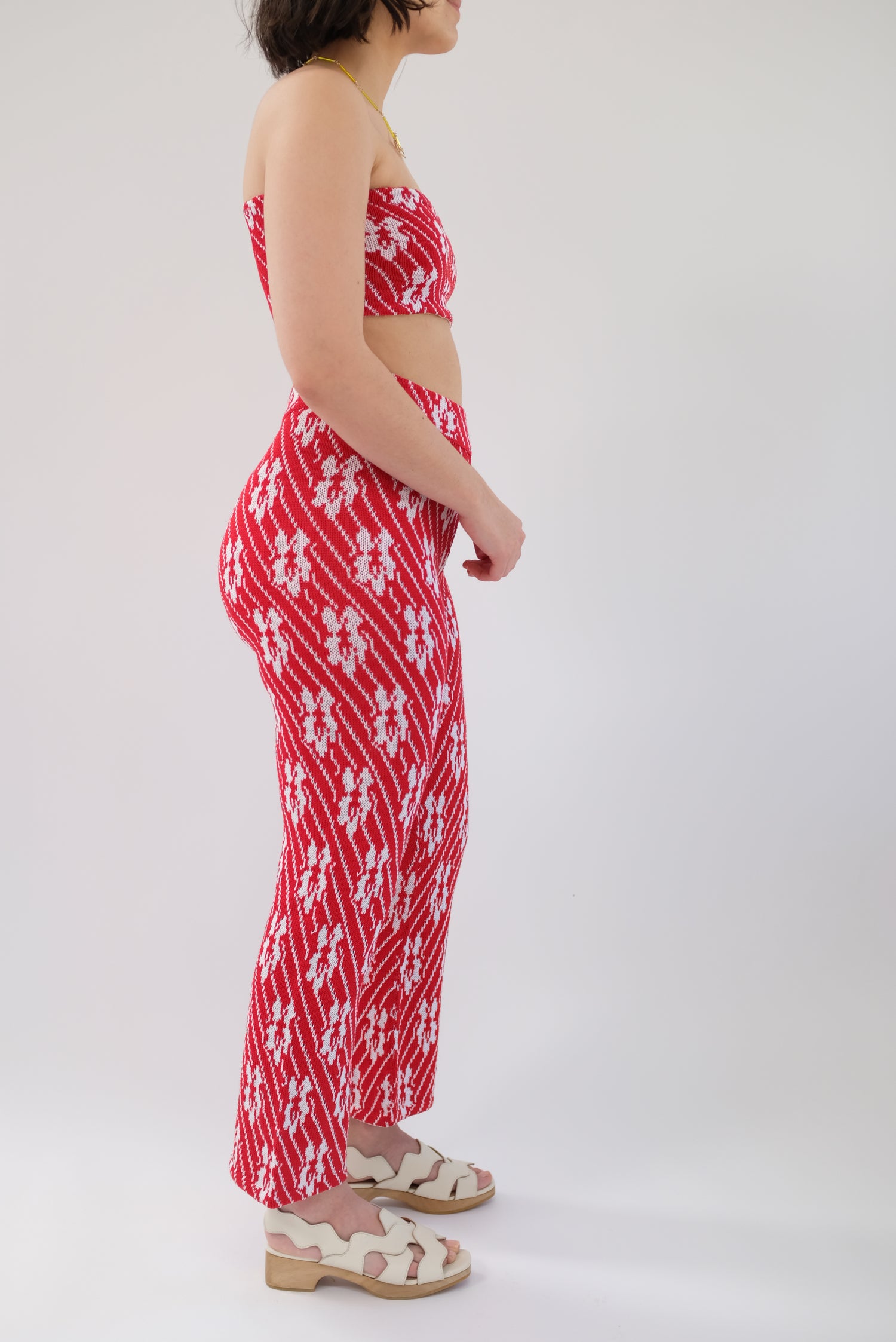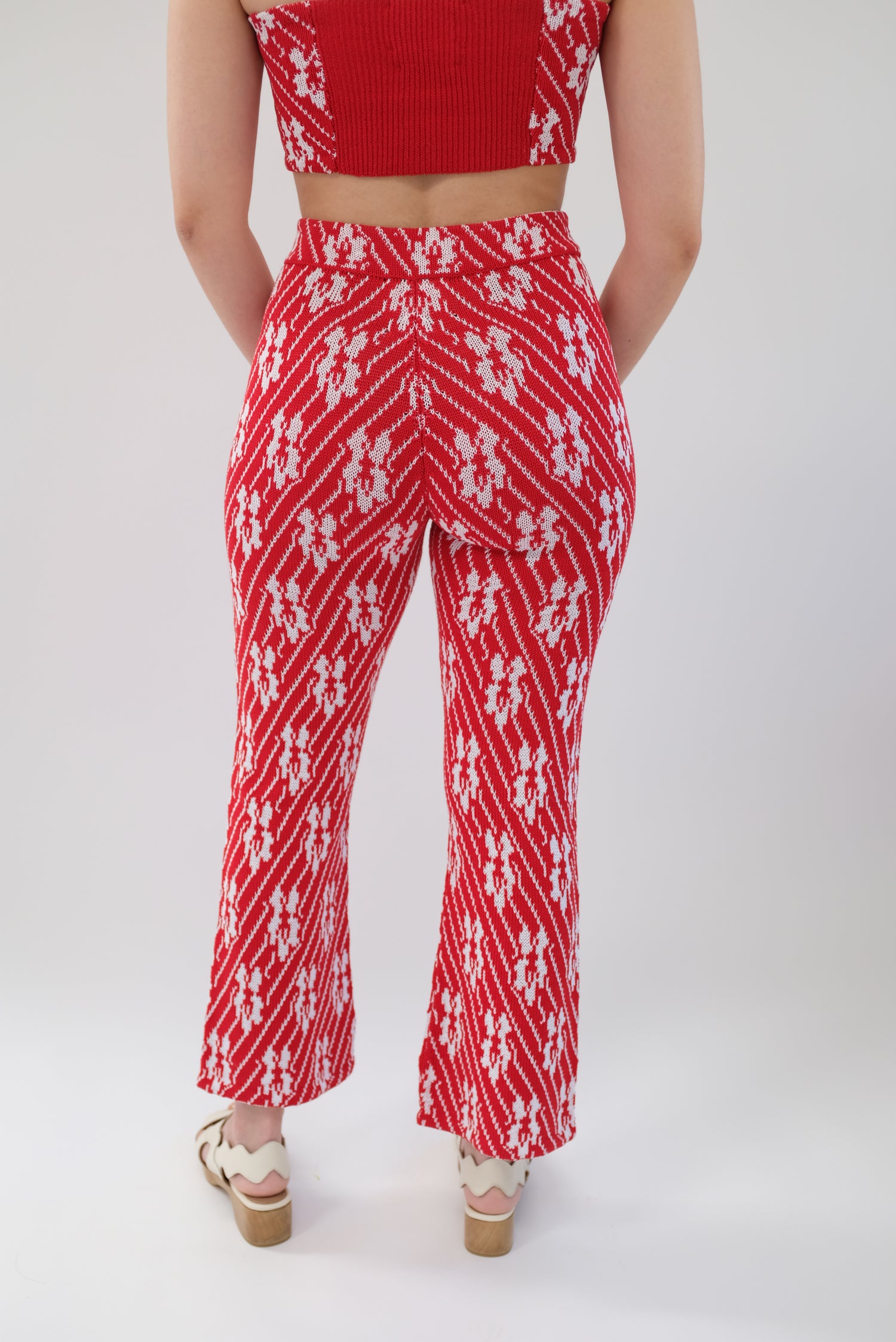 Hand knit flower patterned pants. 2" soft elastic waist, sits at natural waist, straight leg with slight flare. 100% Pima Cotton.