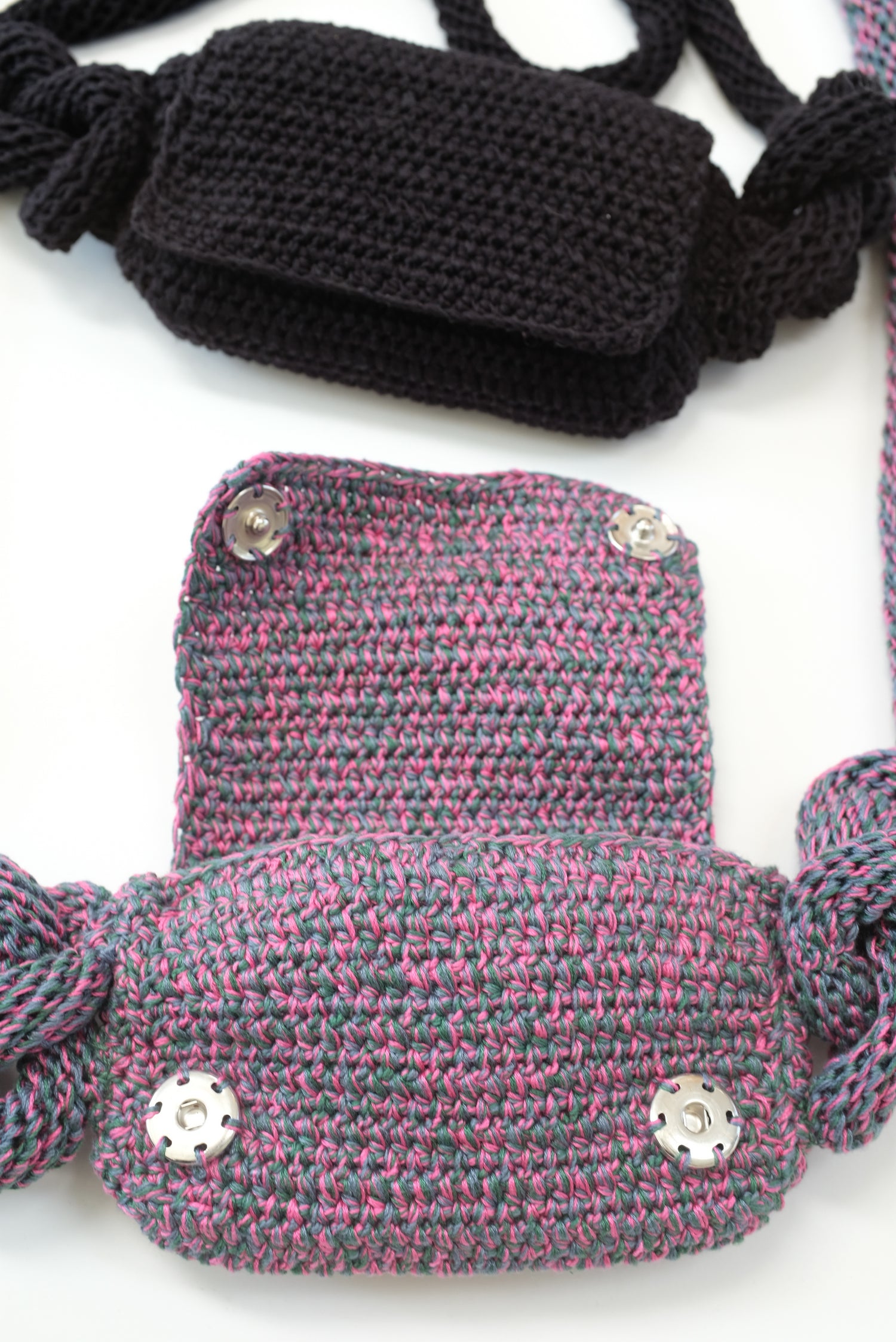 Hand crocheted belt bag. To be worn around waist, hips, cross body, or over shoudler. Fits standard phone, snap closure. Versatile bag fits all waist sizes up to XXL. 100% Cotton.