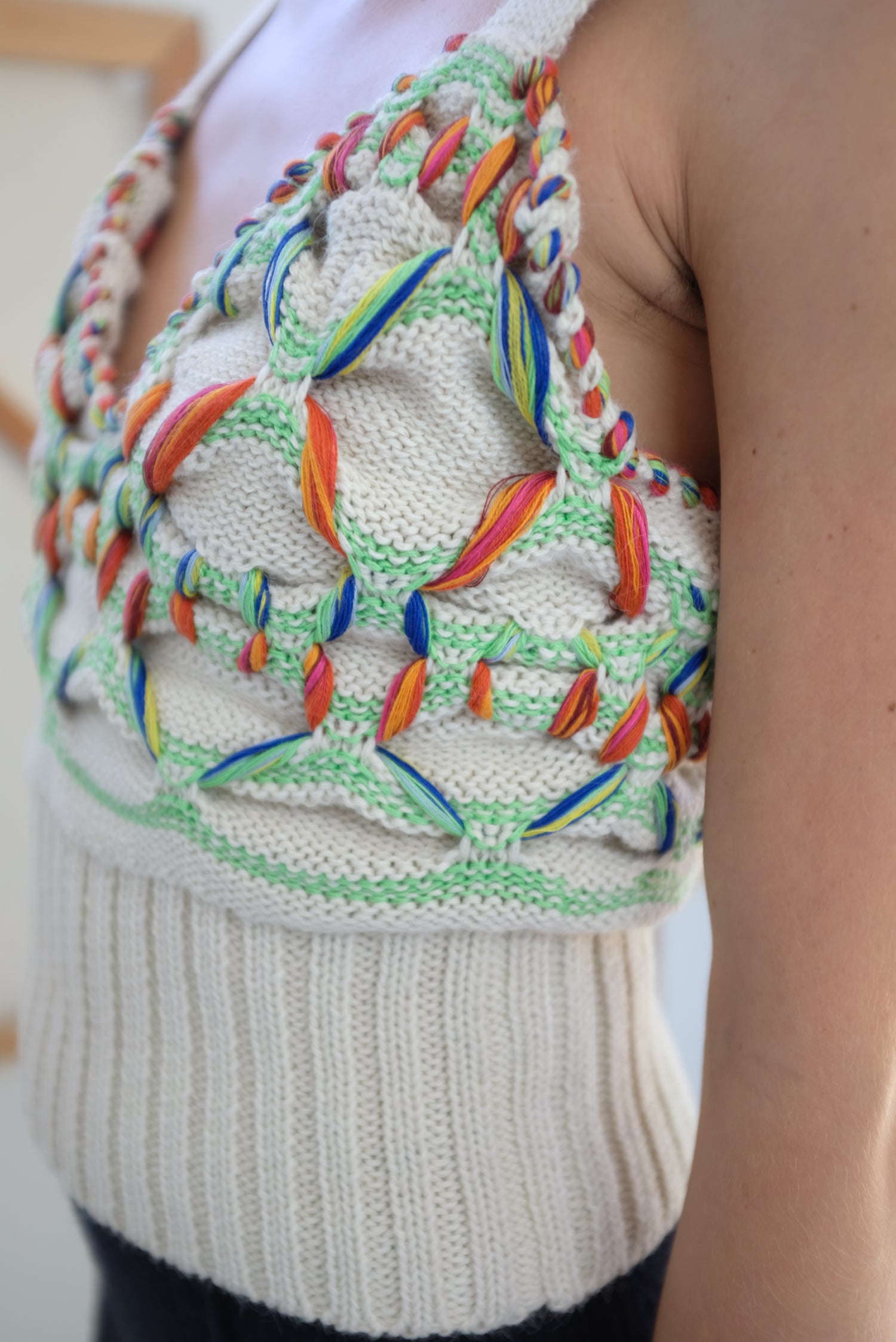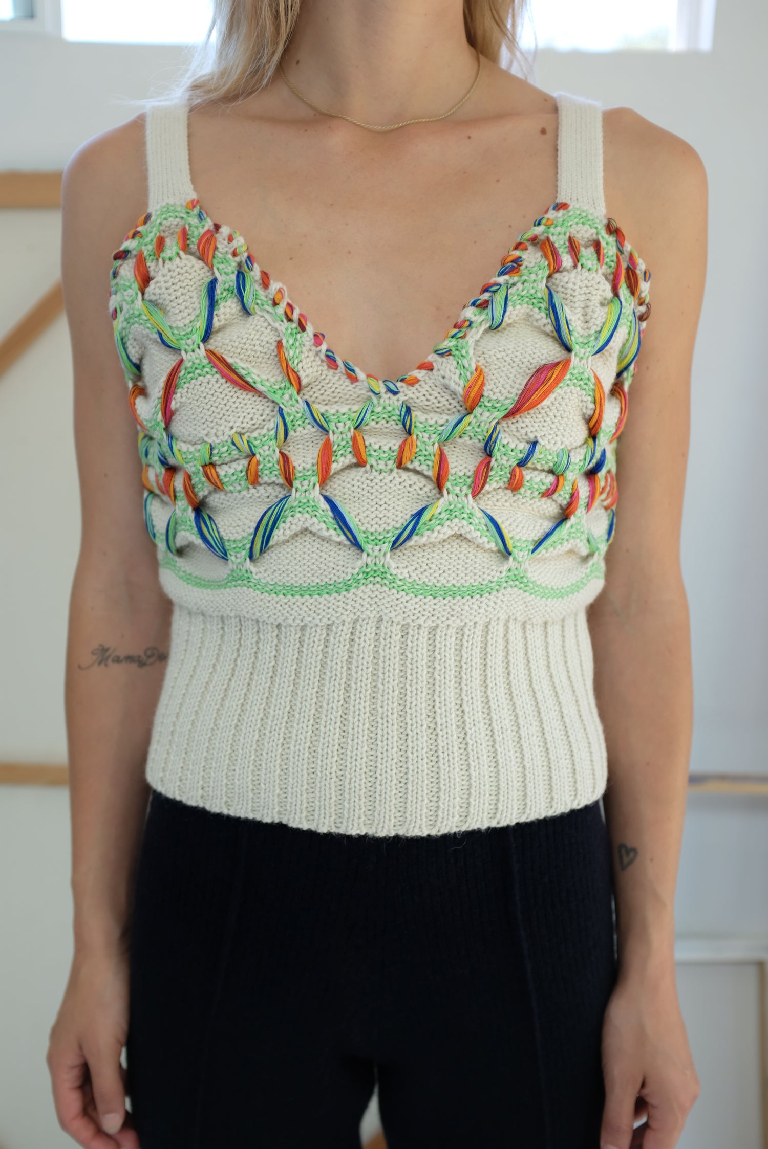 Hand knit v-neck, sleeveless top. Lovingly made from 60% Baby Alpaca, 40% Cotton. Total length from shoulder to hem of size small is 21"