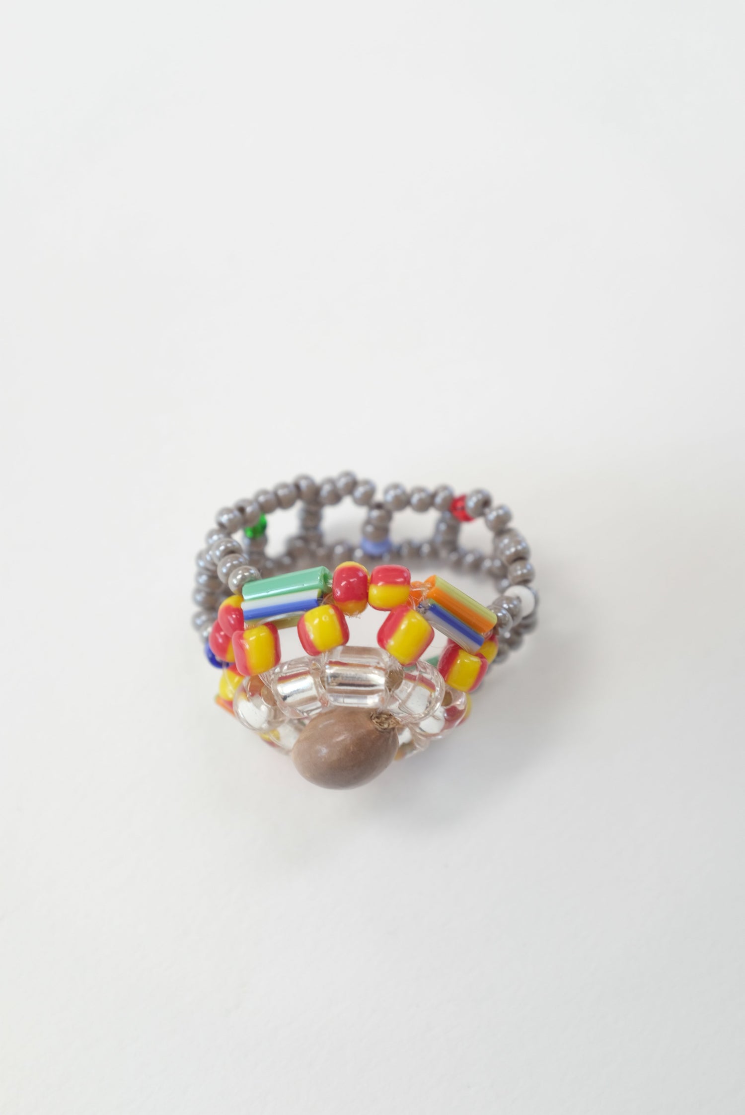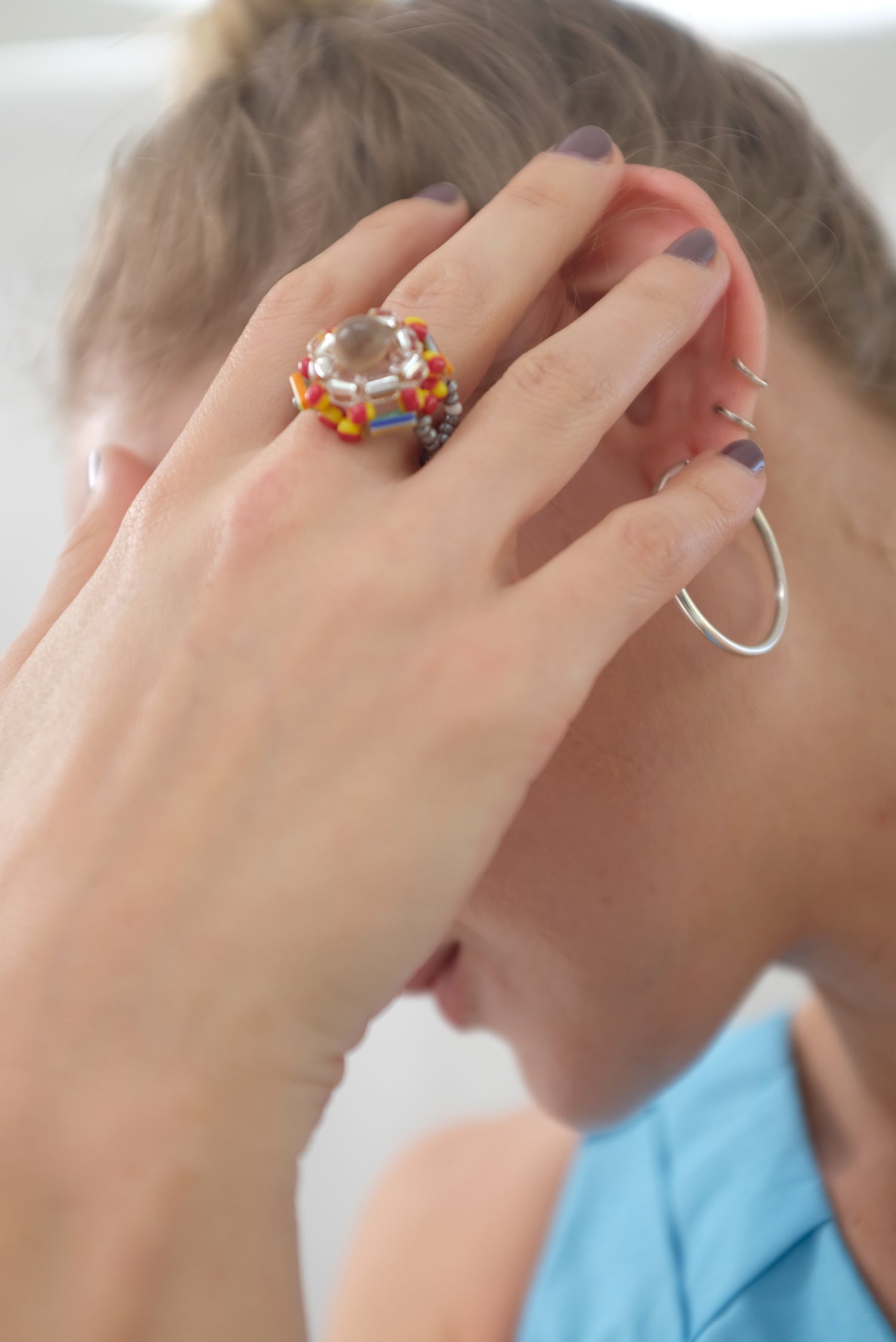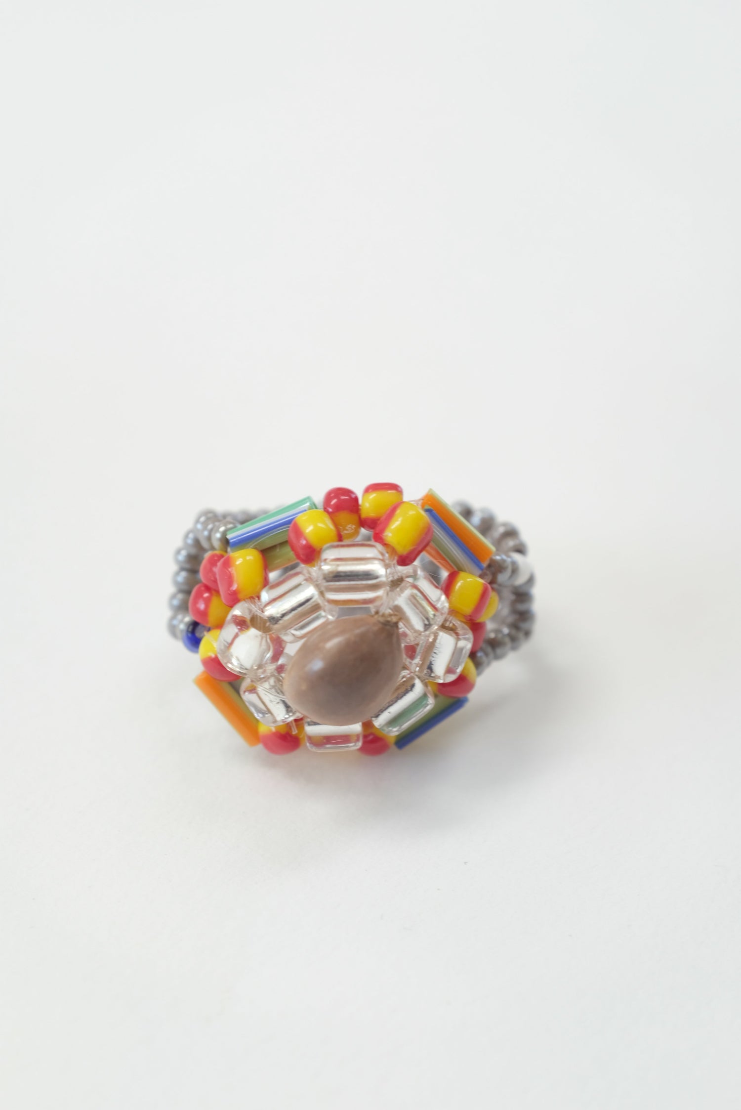 Handcrafted ring, made from multicolored beads and a single seed. Each ring is unique. Elastic easy fit.