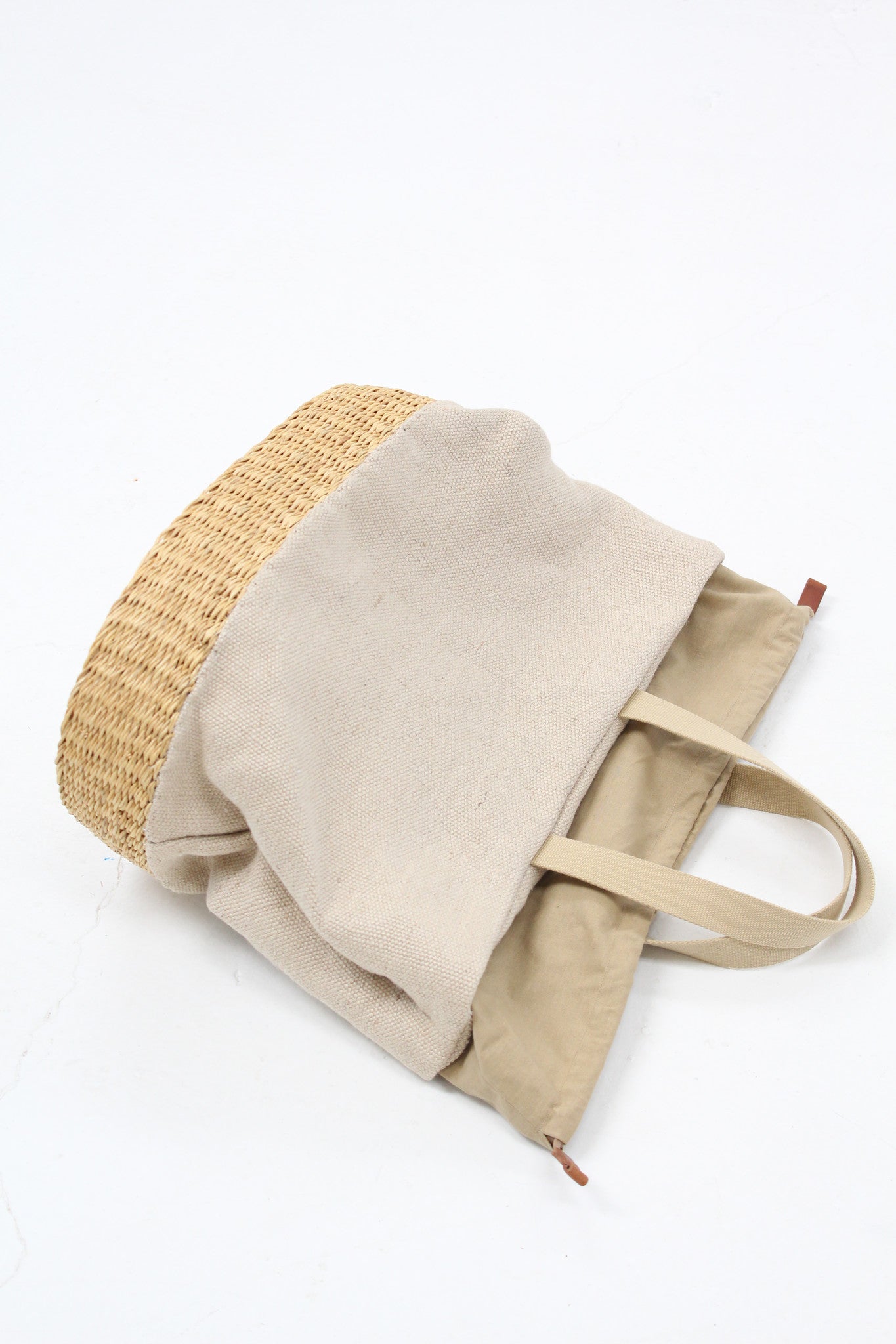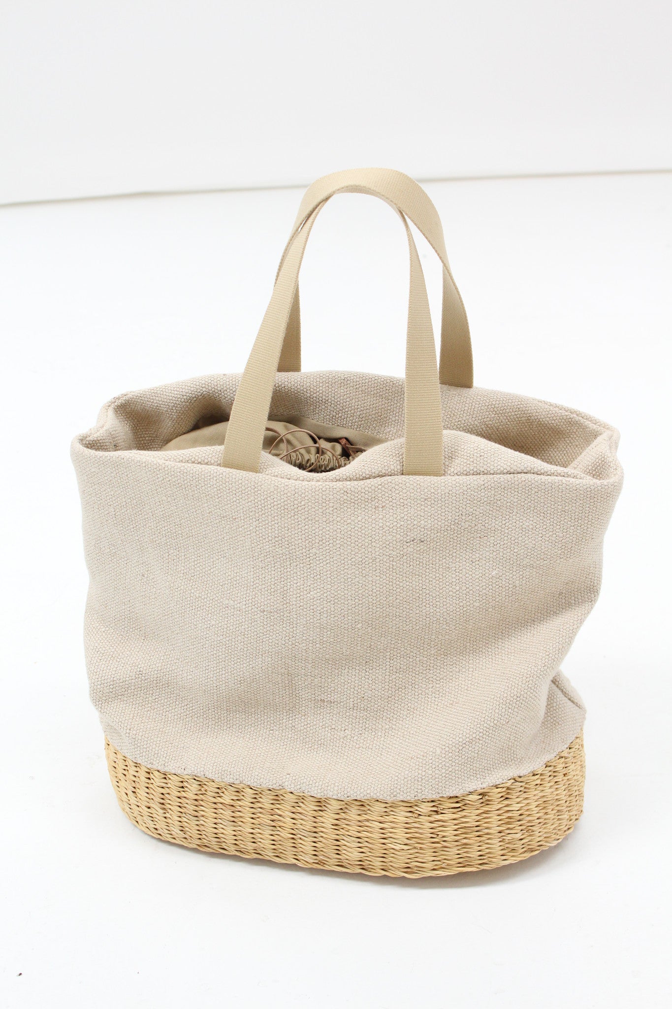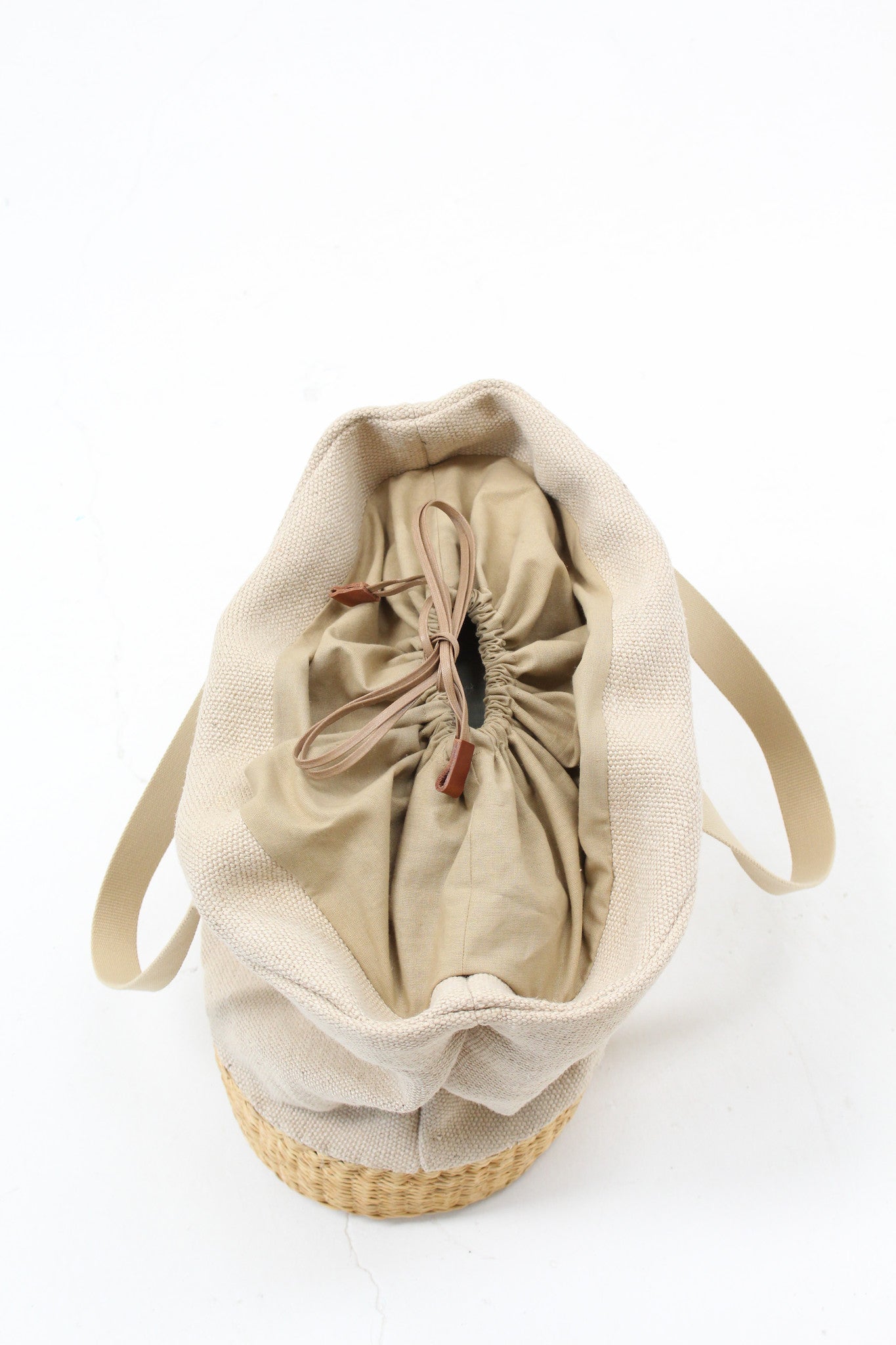 Natural straw bag with contrasting natural jute upper and drawstring top with leather inside pulls. Lined with inside pocket.