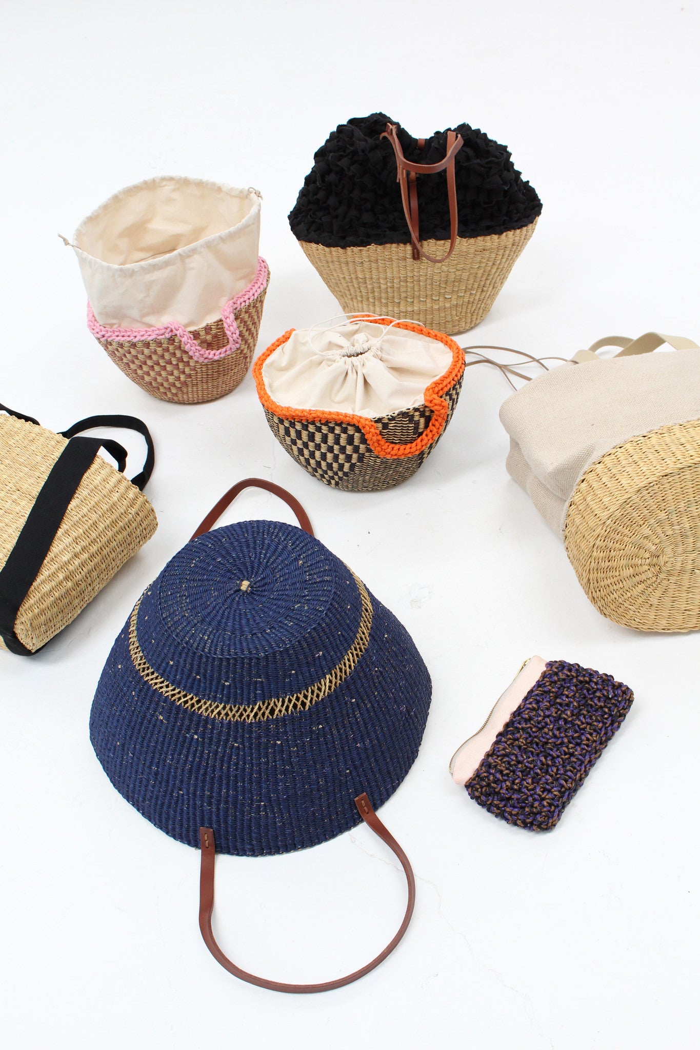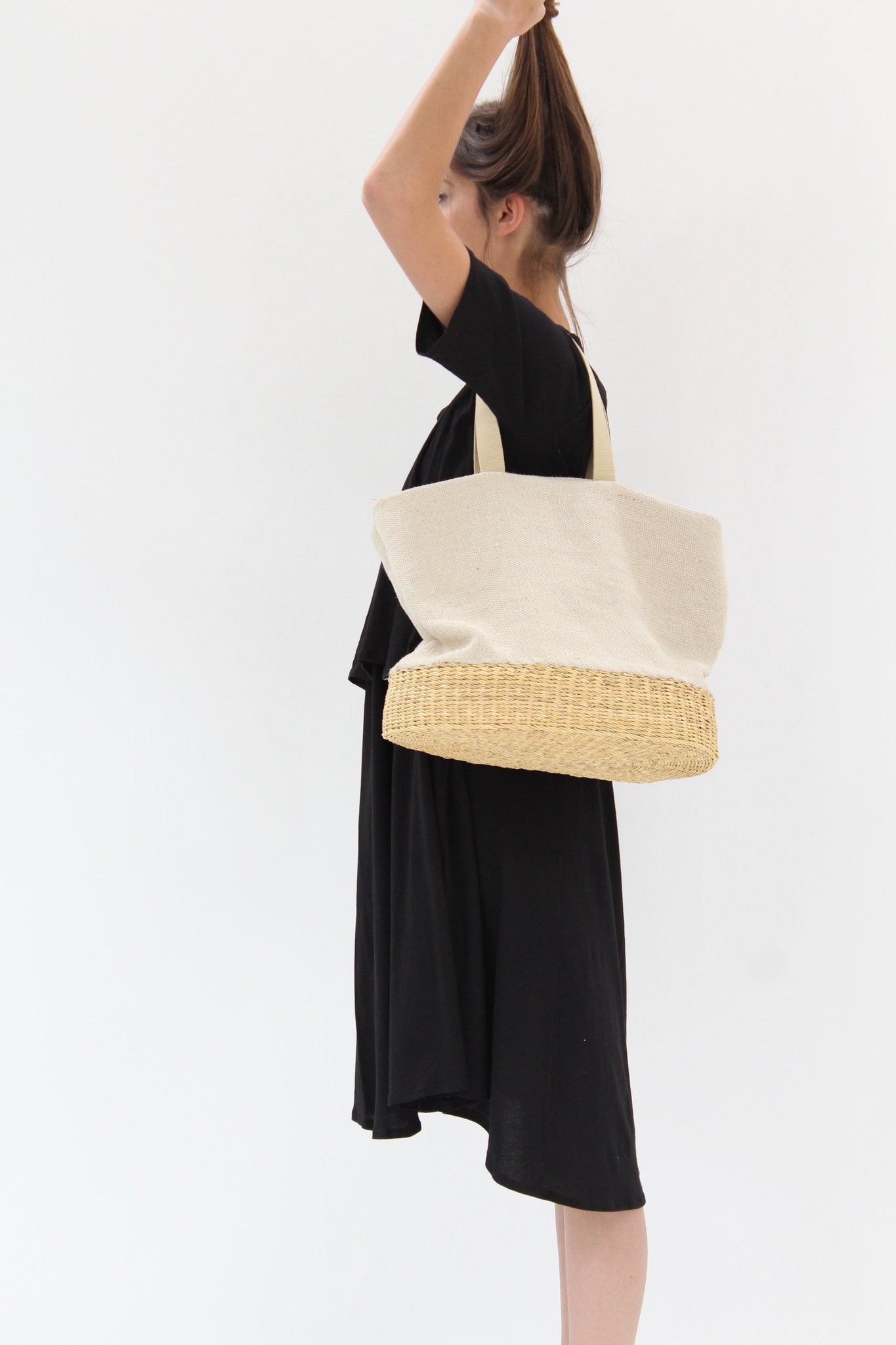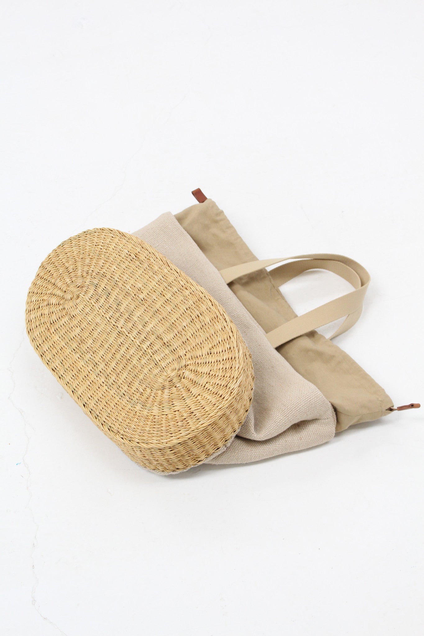 Natural straw bag with contrasting natural jute upper and drawstring top with leather inside pulls. Lined with inside pocket.