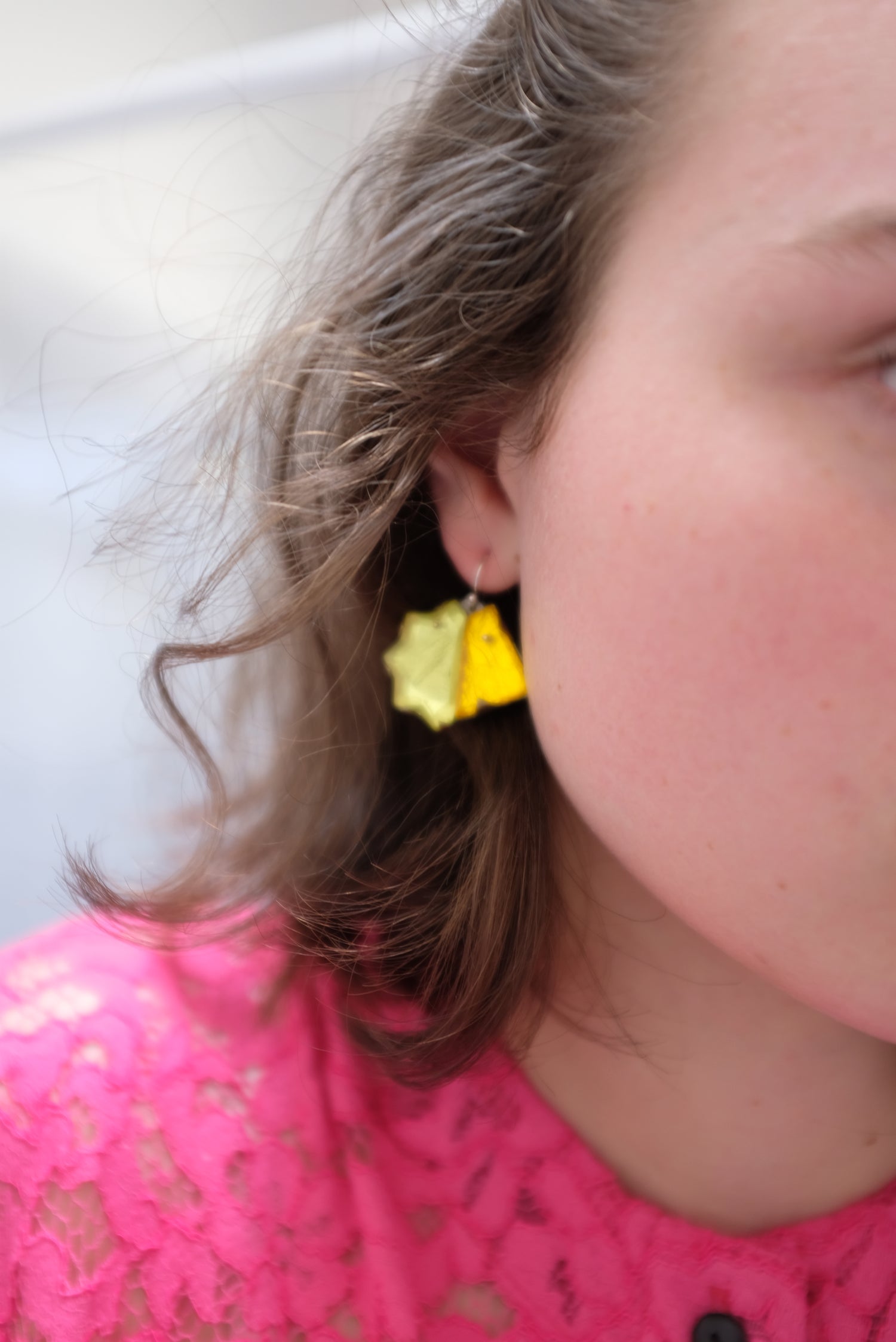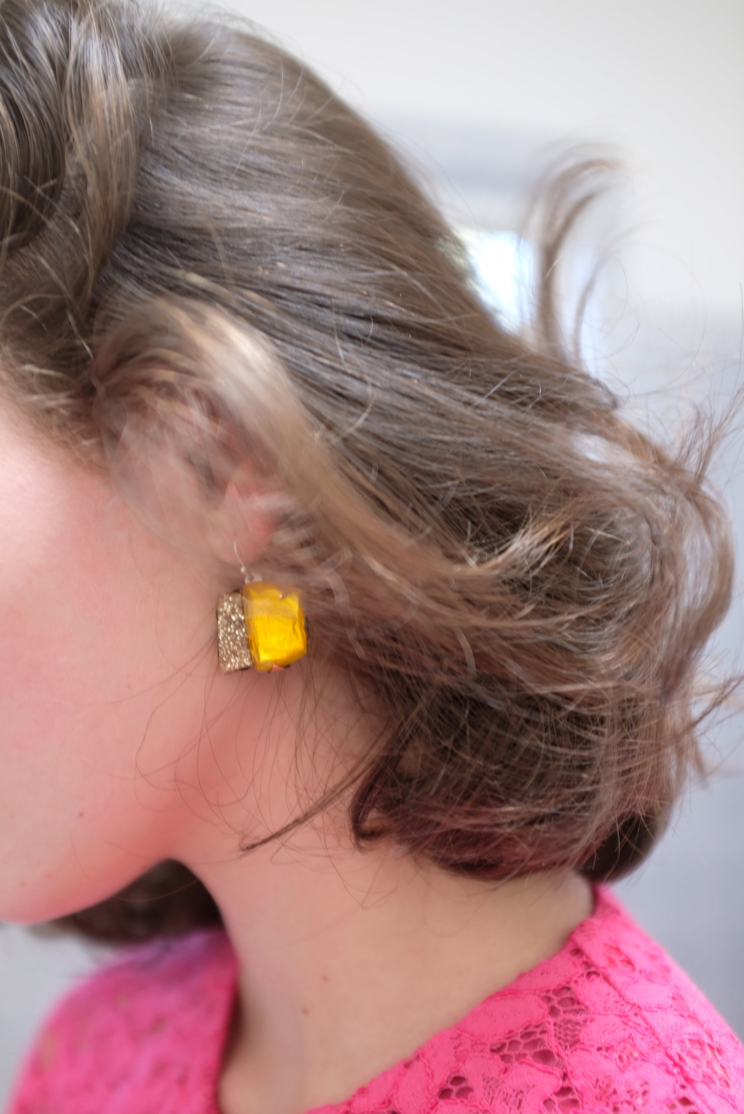 Each is one of a kind, works of art and collectable. Materials include hand sanded plexiglass, brass, sterling silver, fine silver, and found objects. Gems are set in brass frames, with a sterling silver ear hook.