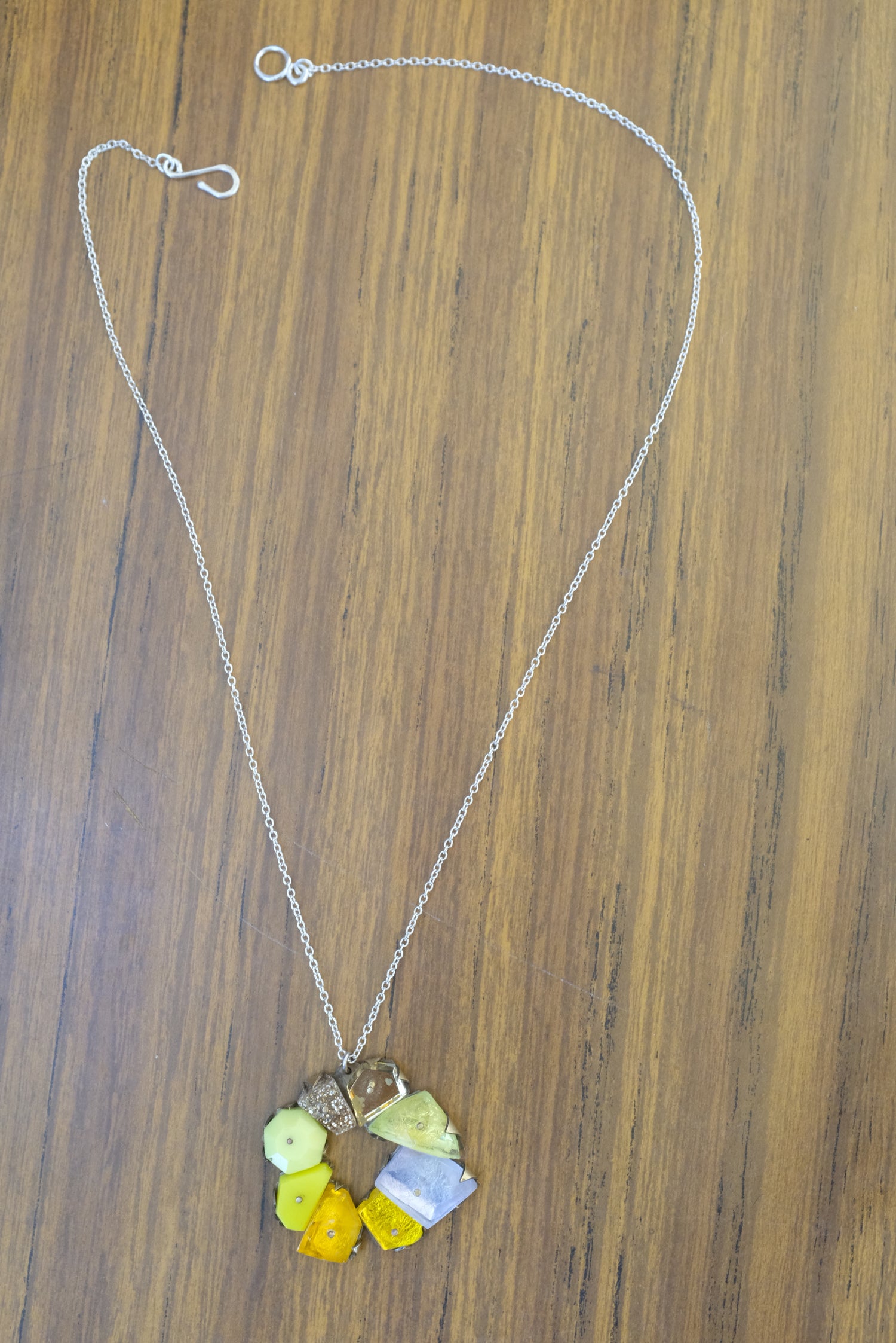 Each is one of a kind, works of art and collectable. Materials include hand sanded plexiglass, brass, sterling silver. Gems are set in brass frames.