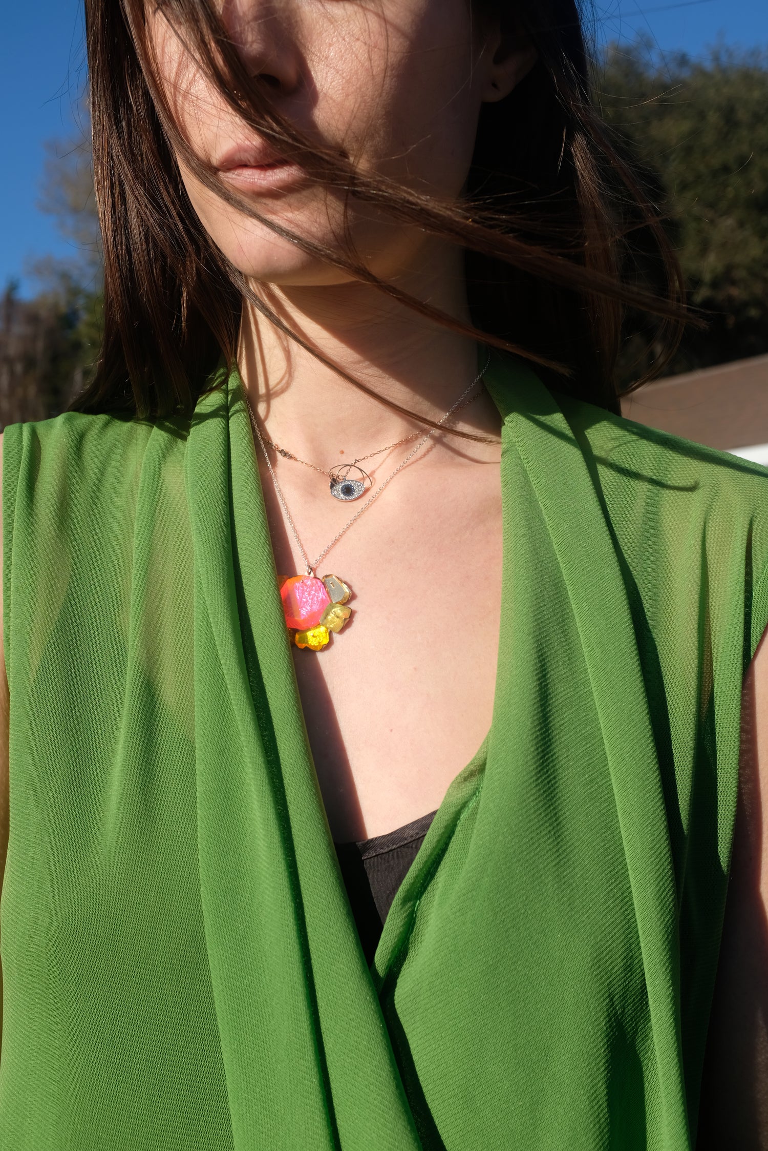 Each is one of a kind, works of art and collectable. Materials include hand sanded plexiglass, brass, sterling silver. Gems are set in brass frames.