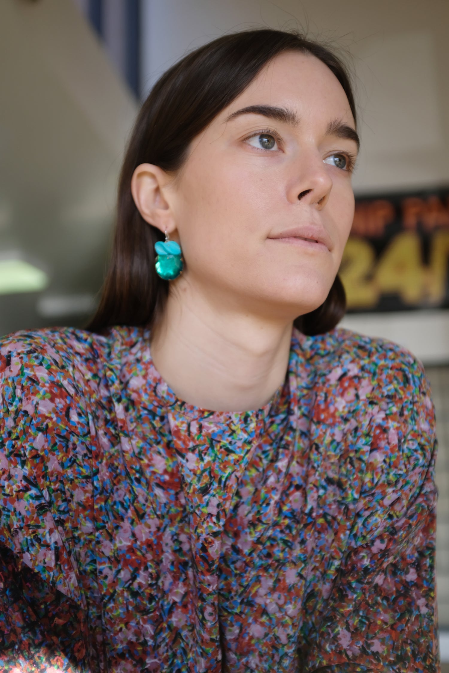 Each is one of a kind, works of art and collectable. Materials include hand sanded plexiglass, brass, sterling silver, fine silver, and found objects. Gems are set in brass frames, with a sterling silver ear hook.