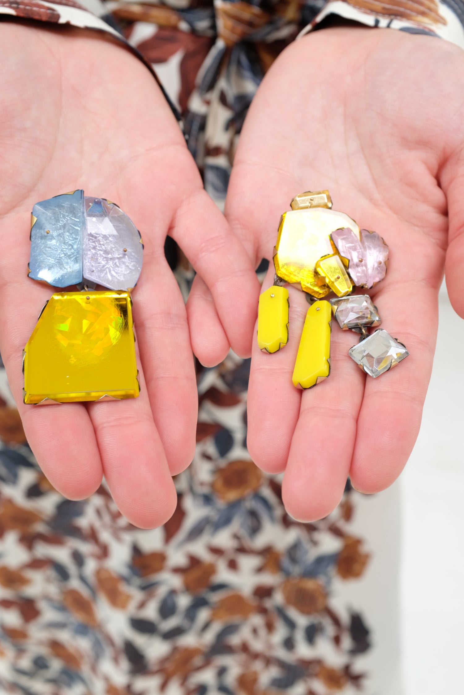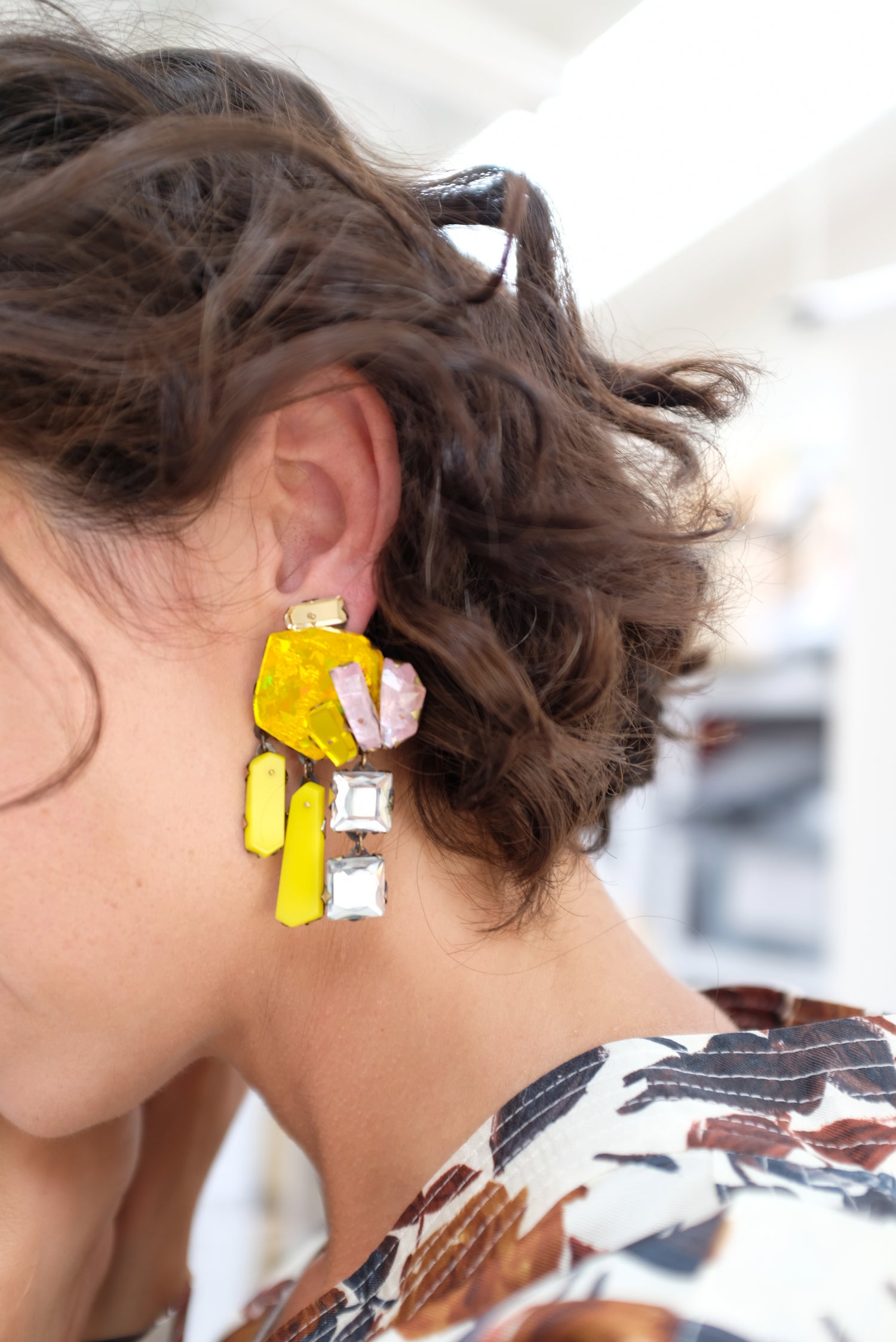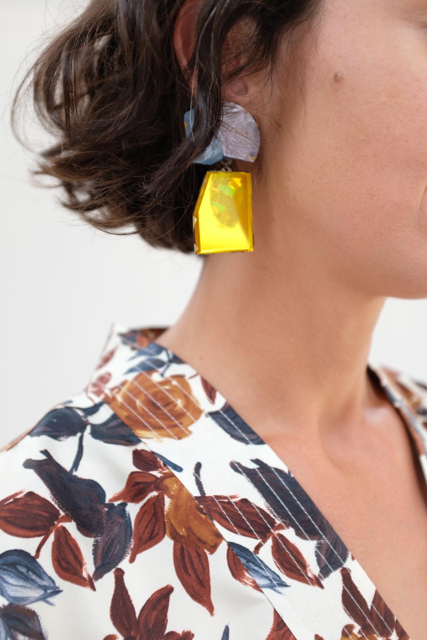 Each is one of a kind, works of art, collectable, and signed by the artist. Materials include hand sanded plexiglass, brass, sterling silver, fine silver, faux gold foil, vinyl. Gems are set in brass frames, backed in fine silver with a sterling silver ear post.