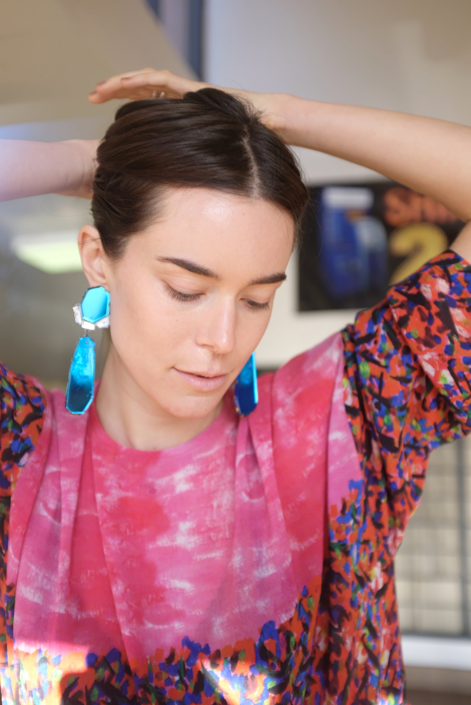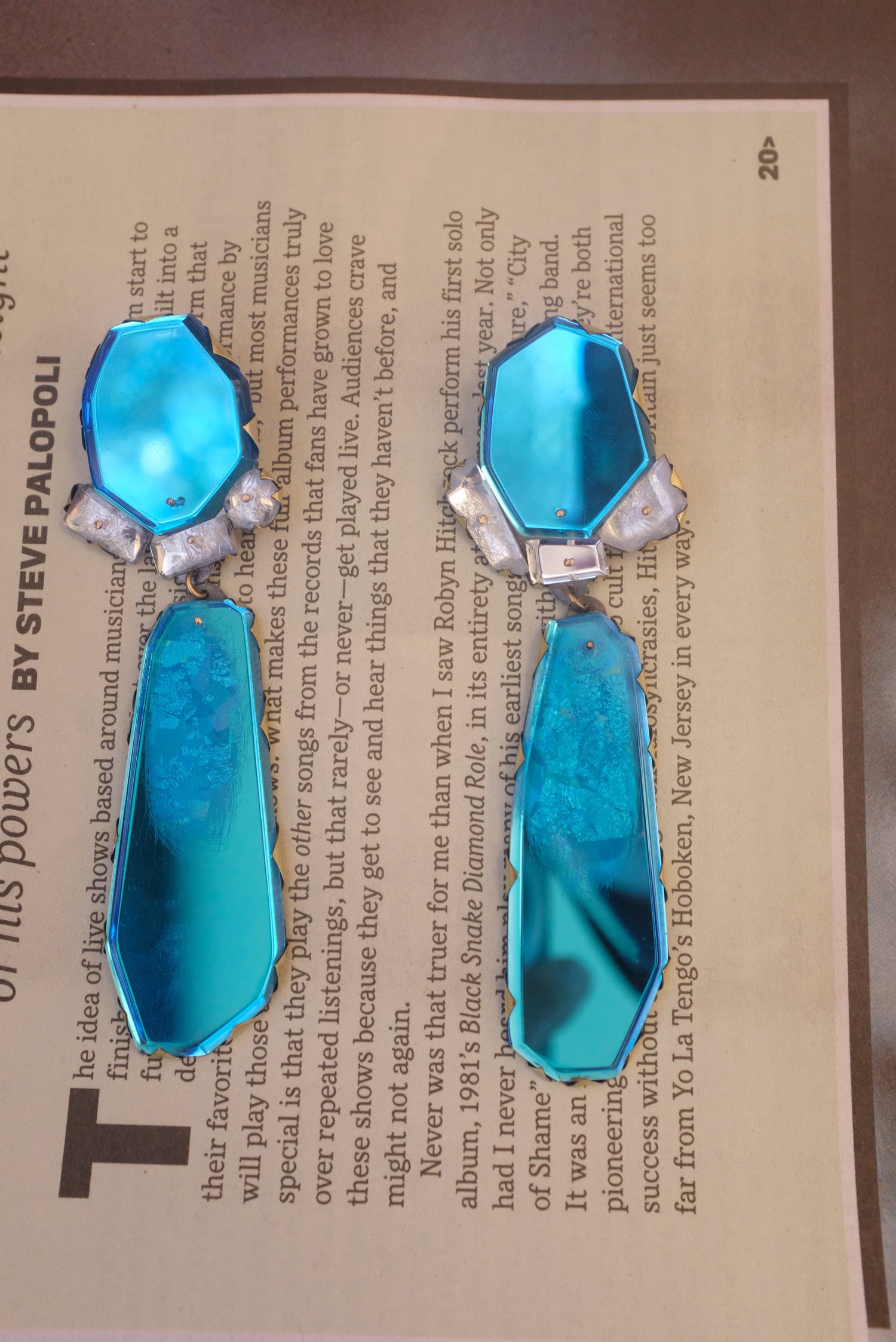 Each is one of a kind, works of art, collectable, and signed by the artist. Materials include hand sanded plexiglass, brass, sterling silver, fine silver, faux gold foil, vinyl. Gems are set in brass frames, backed in fine silver with a sterling silver ear post.