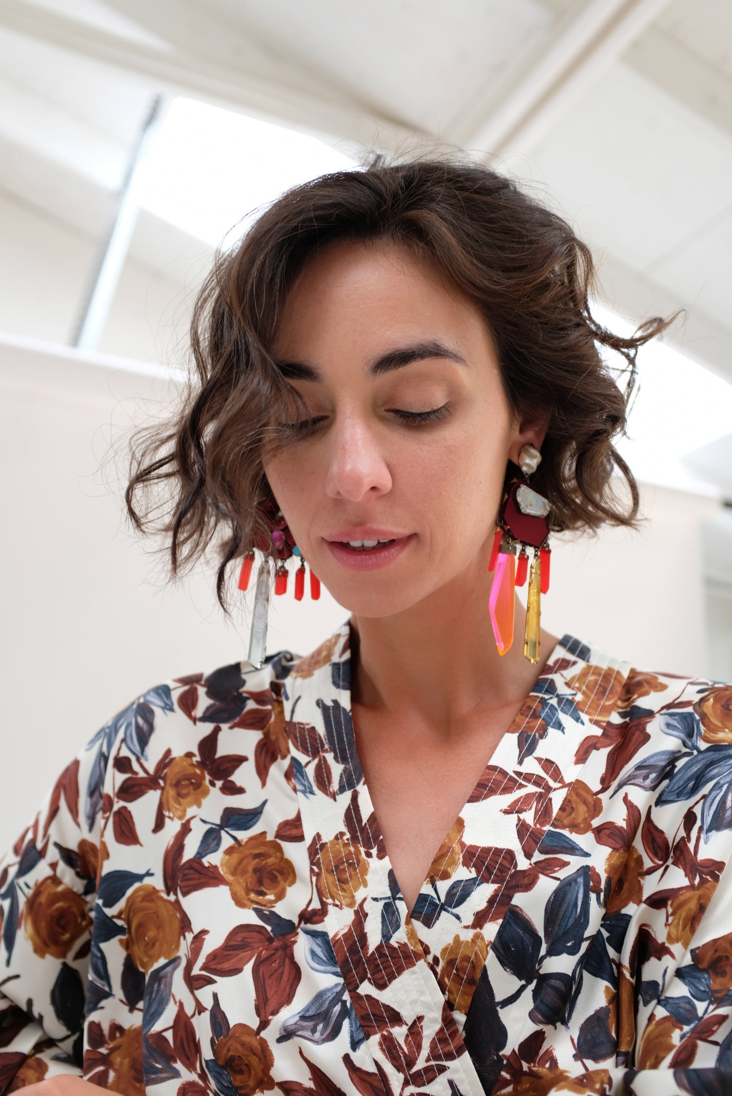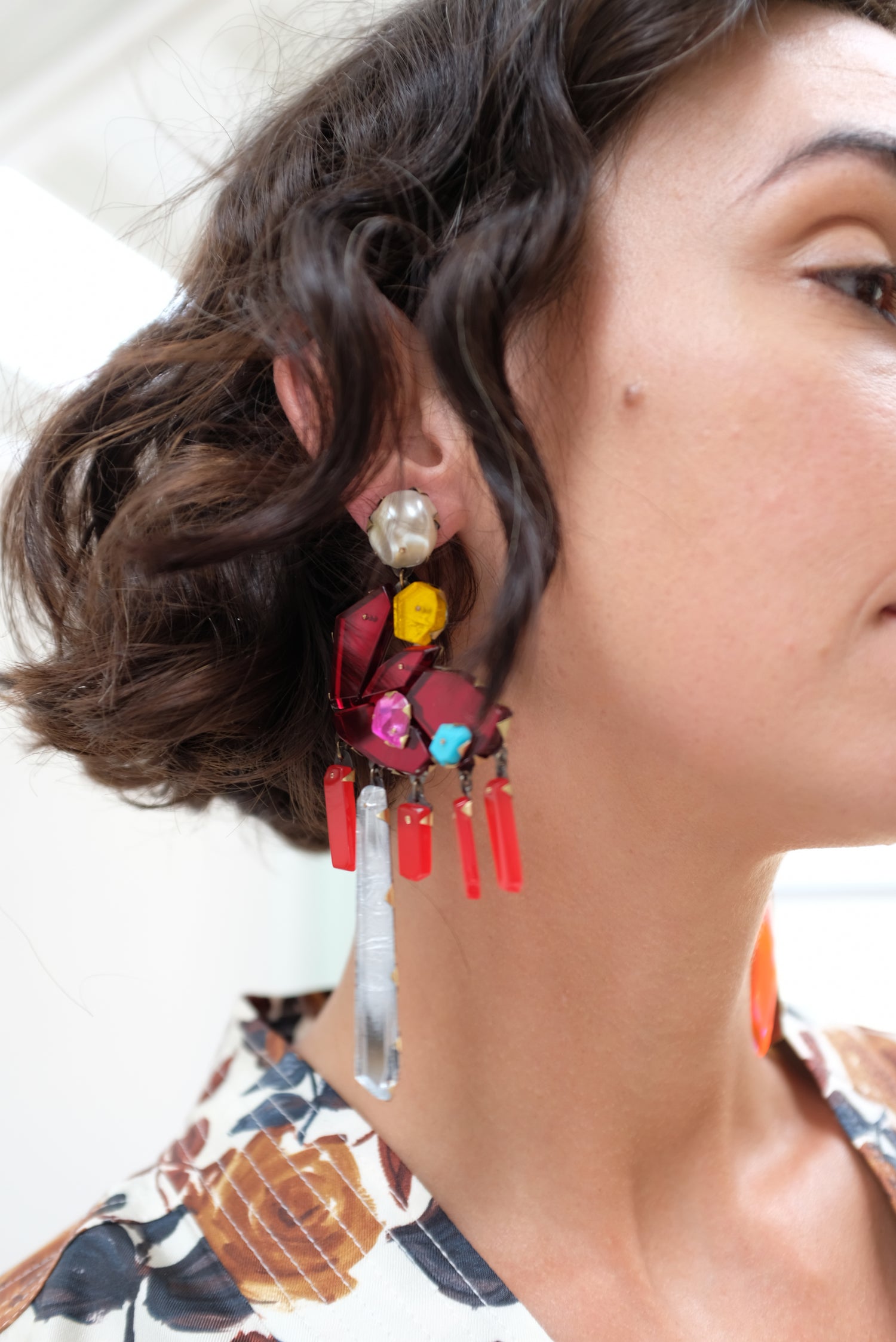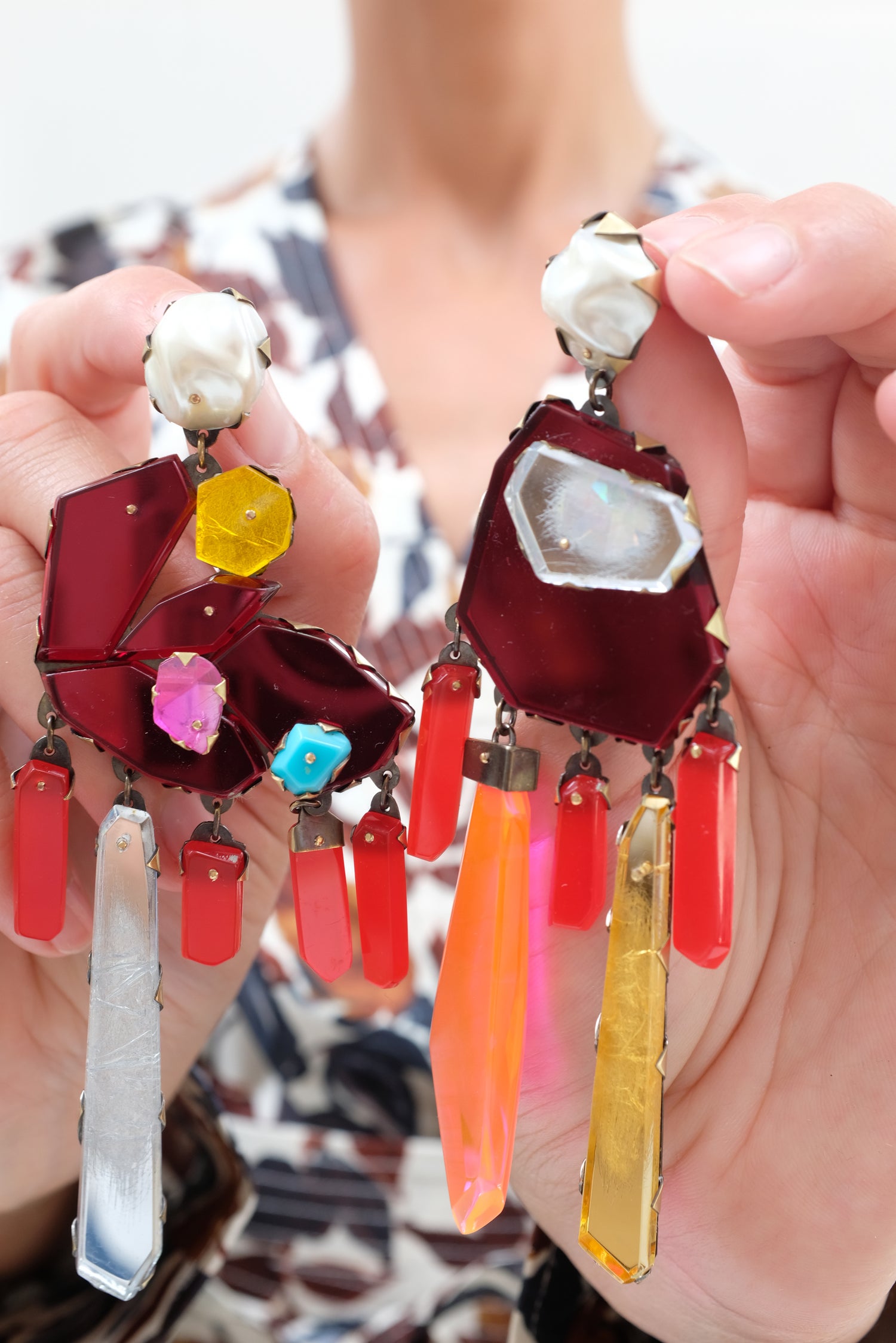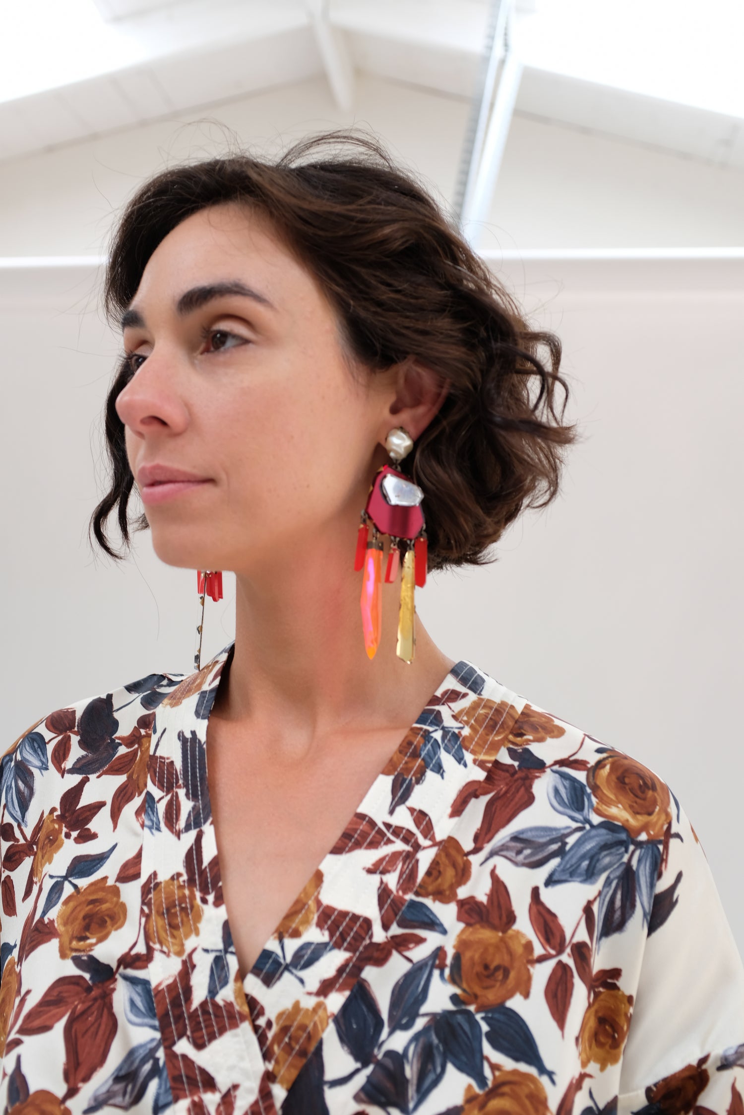 Each is one of a kind, works of art, collectable, and signed by the artist. Materials include hand sanded plexiglass, brass, sterling silver, fine silver, faux pearl, and found objects. Gems are set in brass frames, backed in fine silver with a sterling silver ear post.