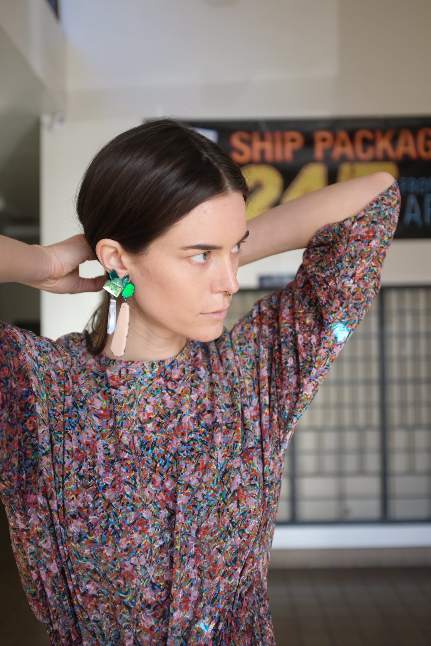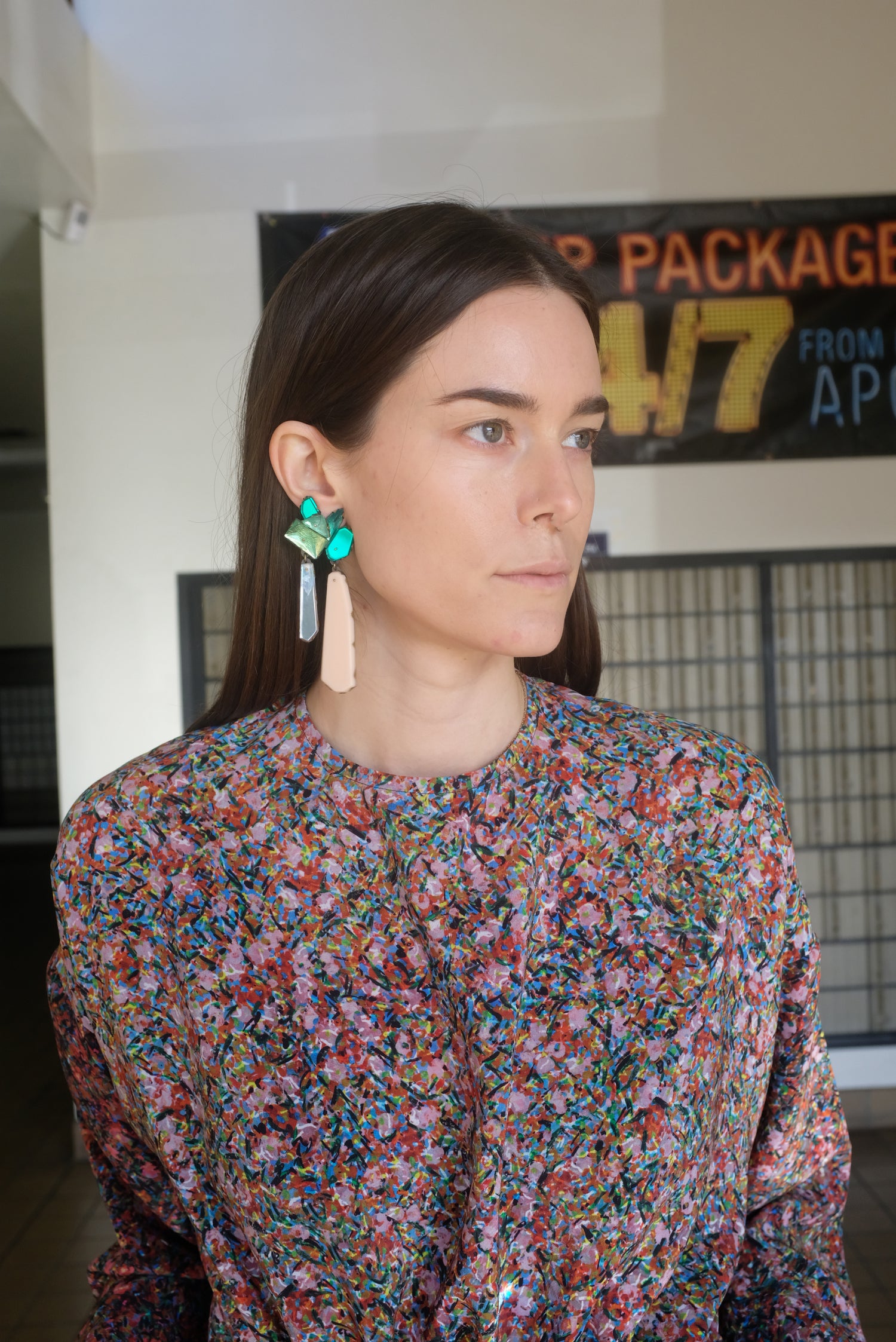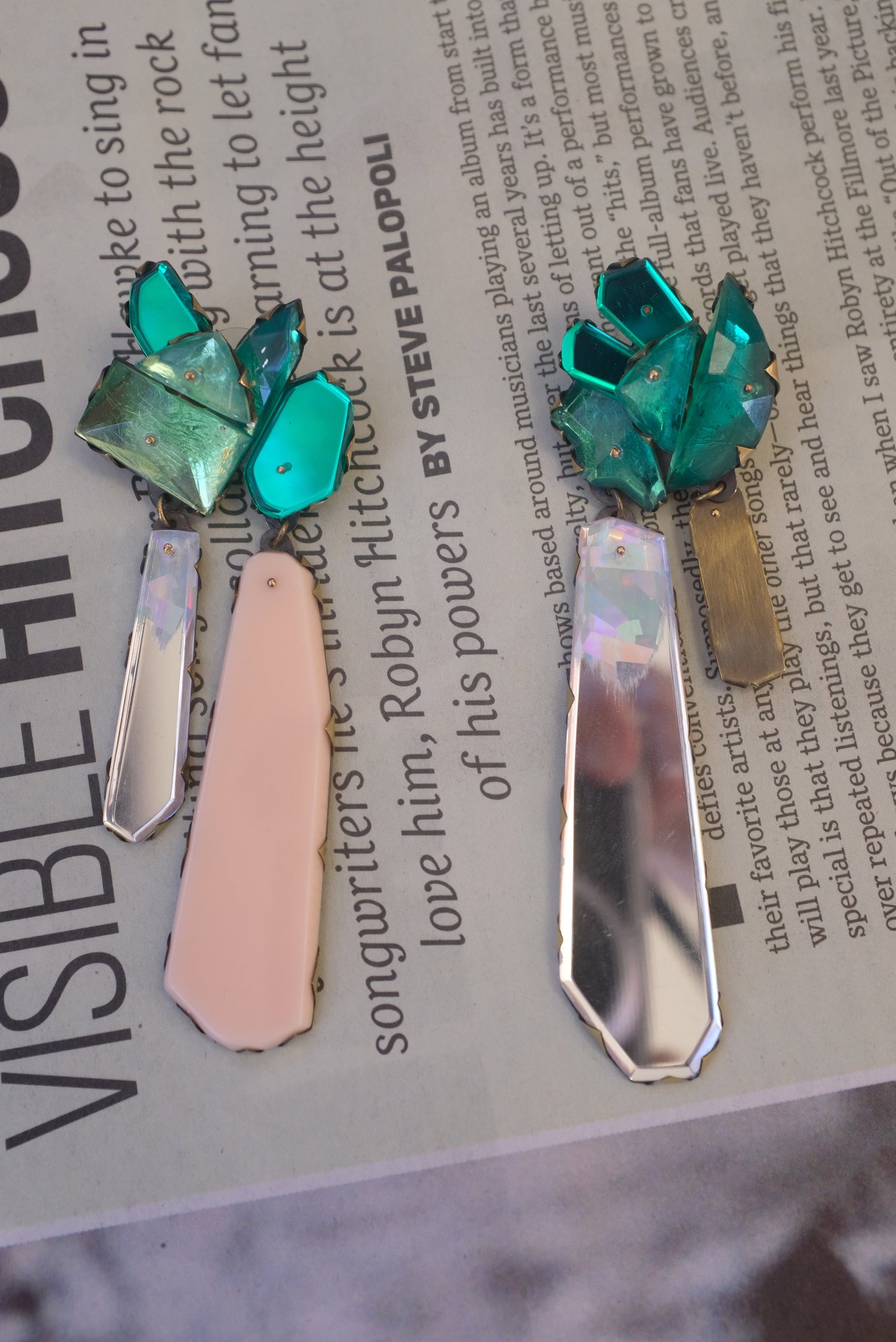Each is one of a kind, works of art, collectable, and signed by the artist. Materials include hand sanded plexiglass, brass, sterling silver, fine silver, fish bone, and found objects. Gems are set in brass frames, backed in fine silver with a sterling silver ear post.