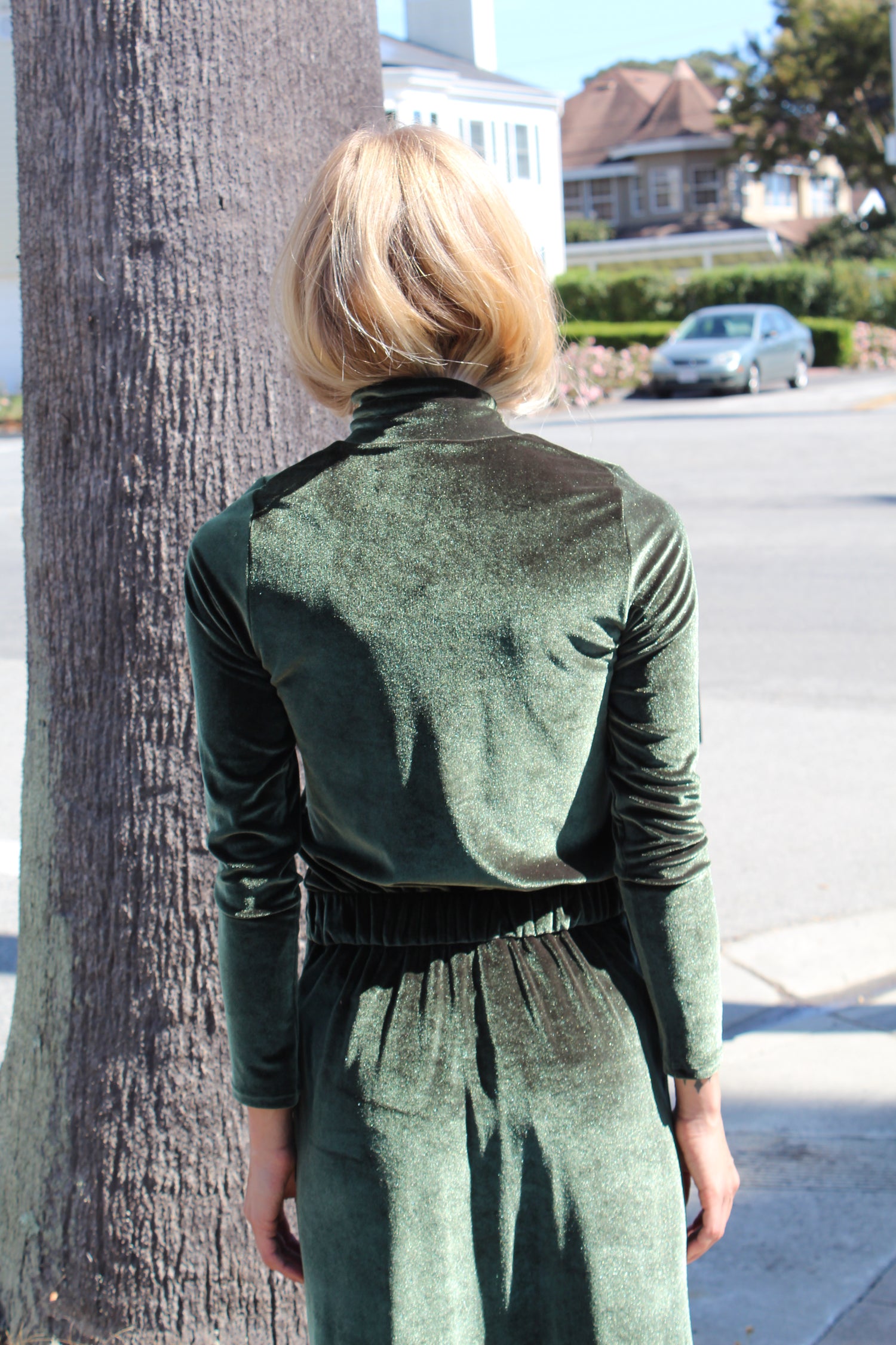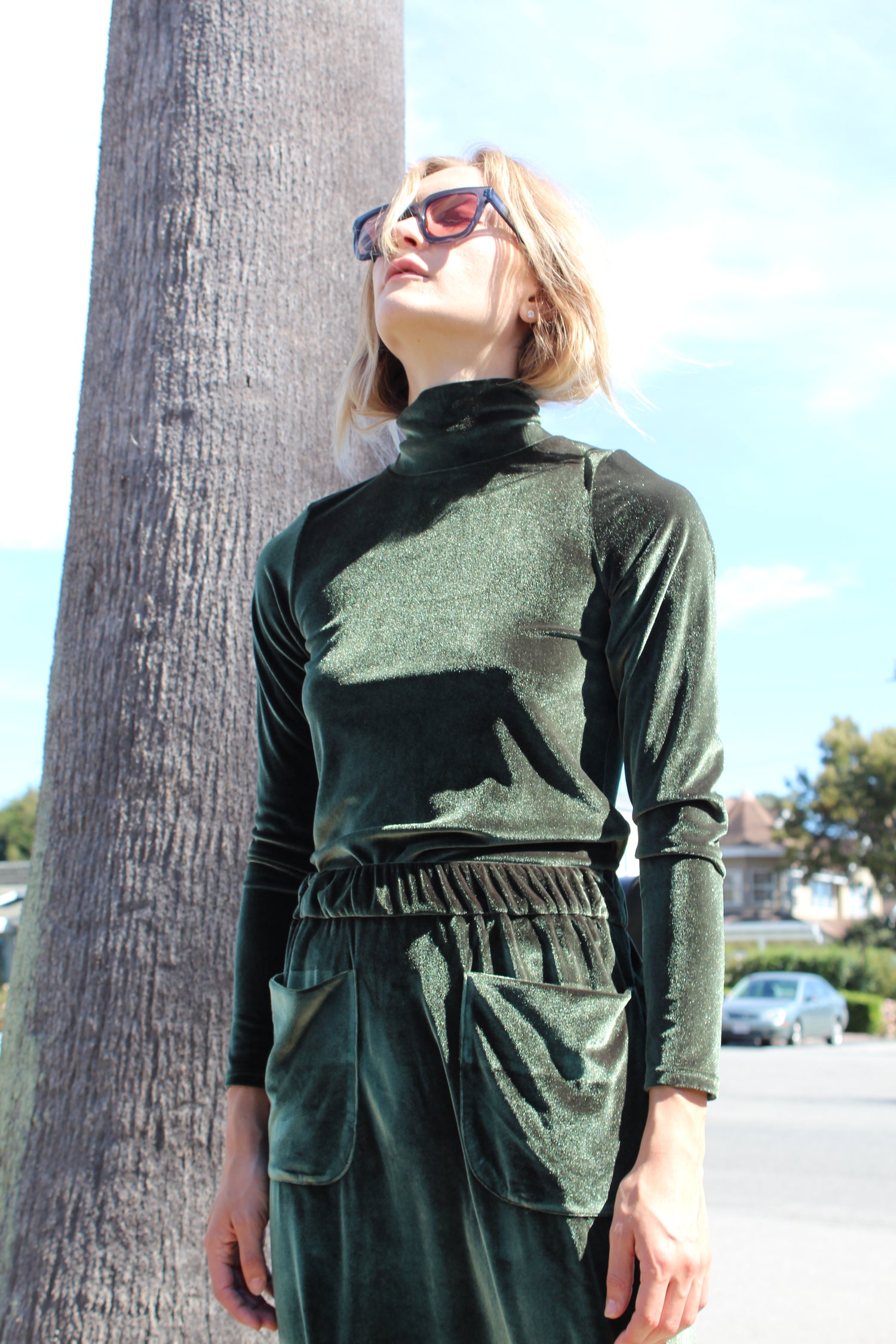 Sleek, stretch velvet turtleneck. Great for layering. So comfy! Alexis is wearing size 1. Length is 23” 90% Polyester, 10% Elastane.