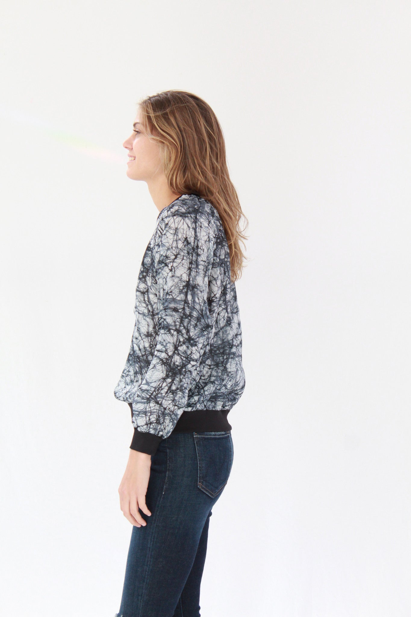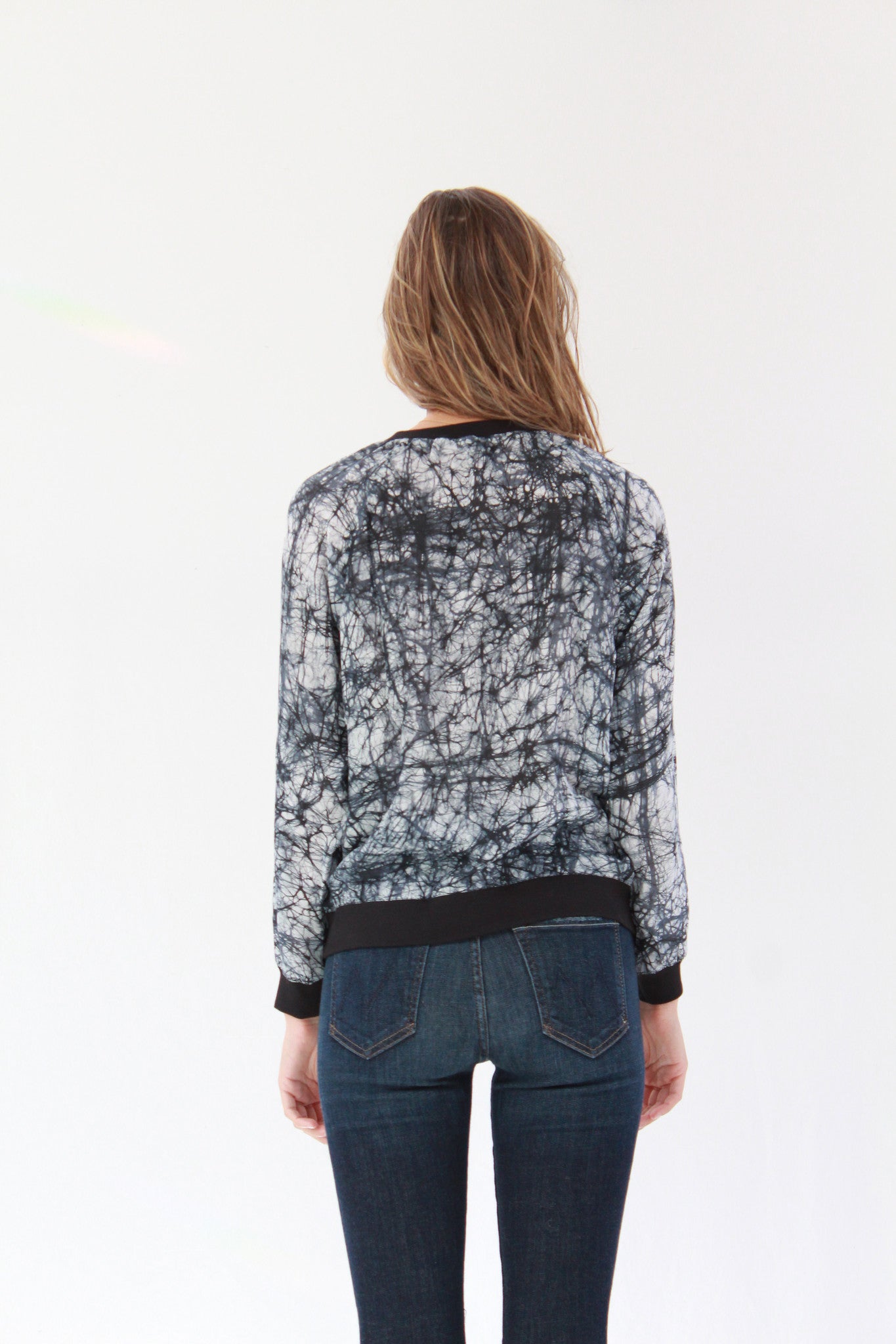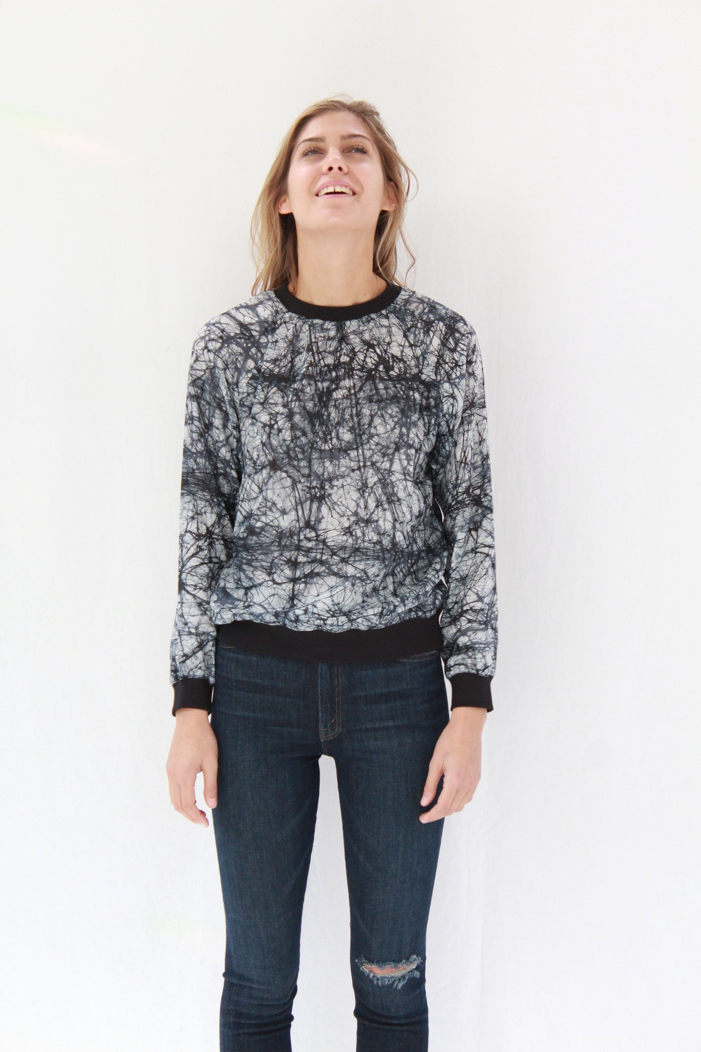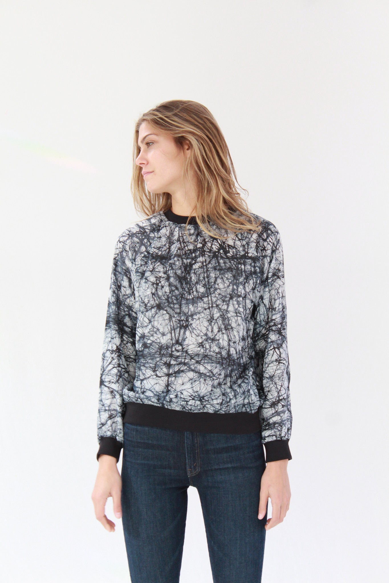 Loose 100% silk sweatshirt, hand dyed black and white Crackle print. Ribbing at neckline, cuffs and hem. Addy is wearing size small, runs true to size.