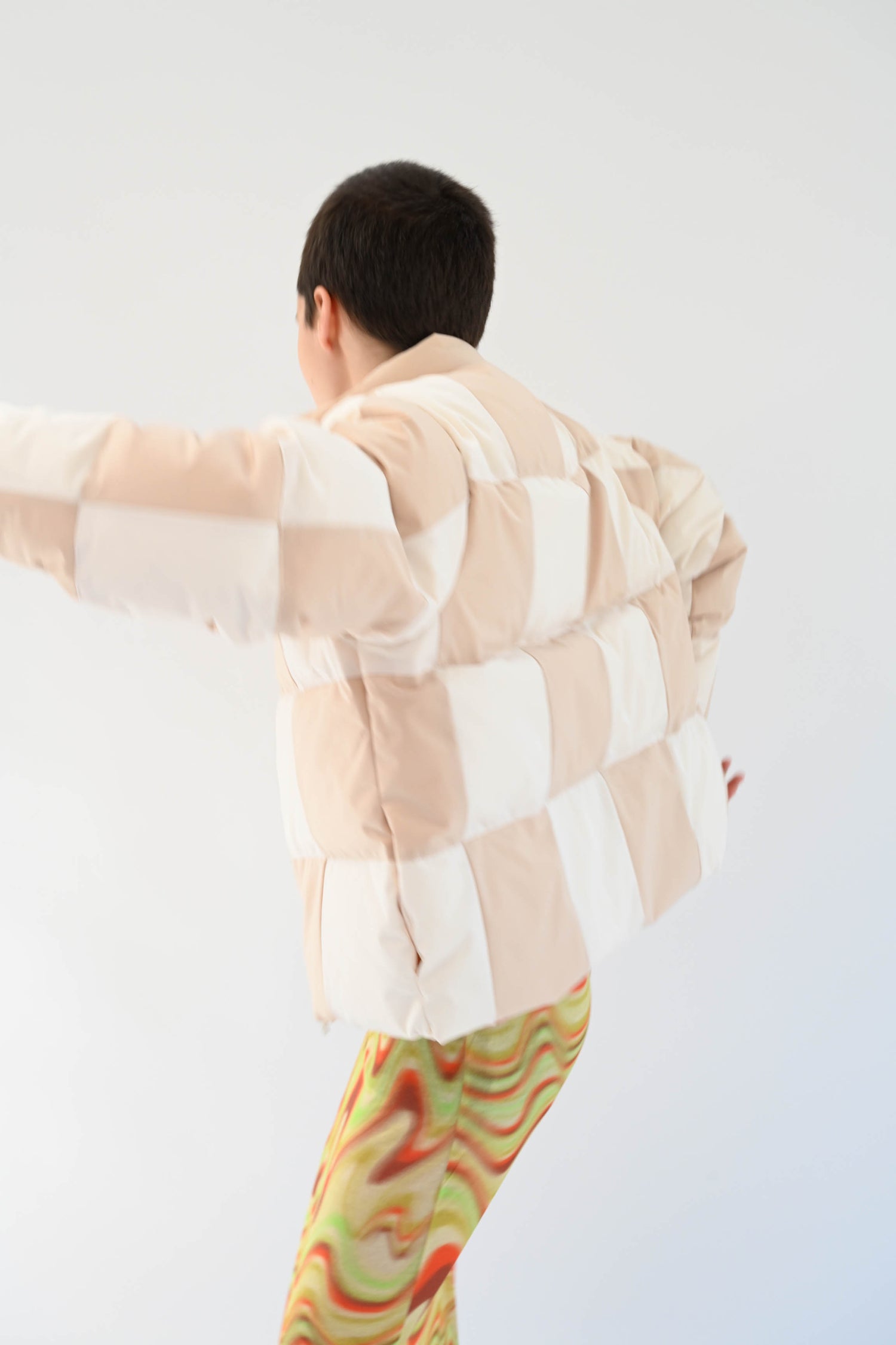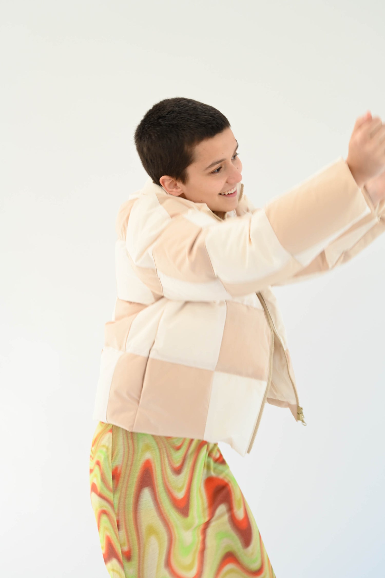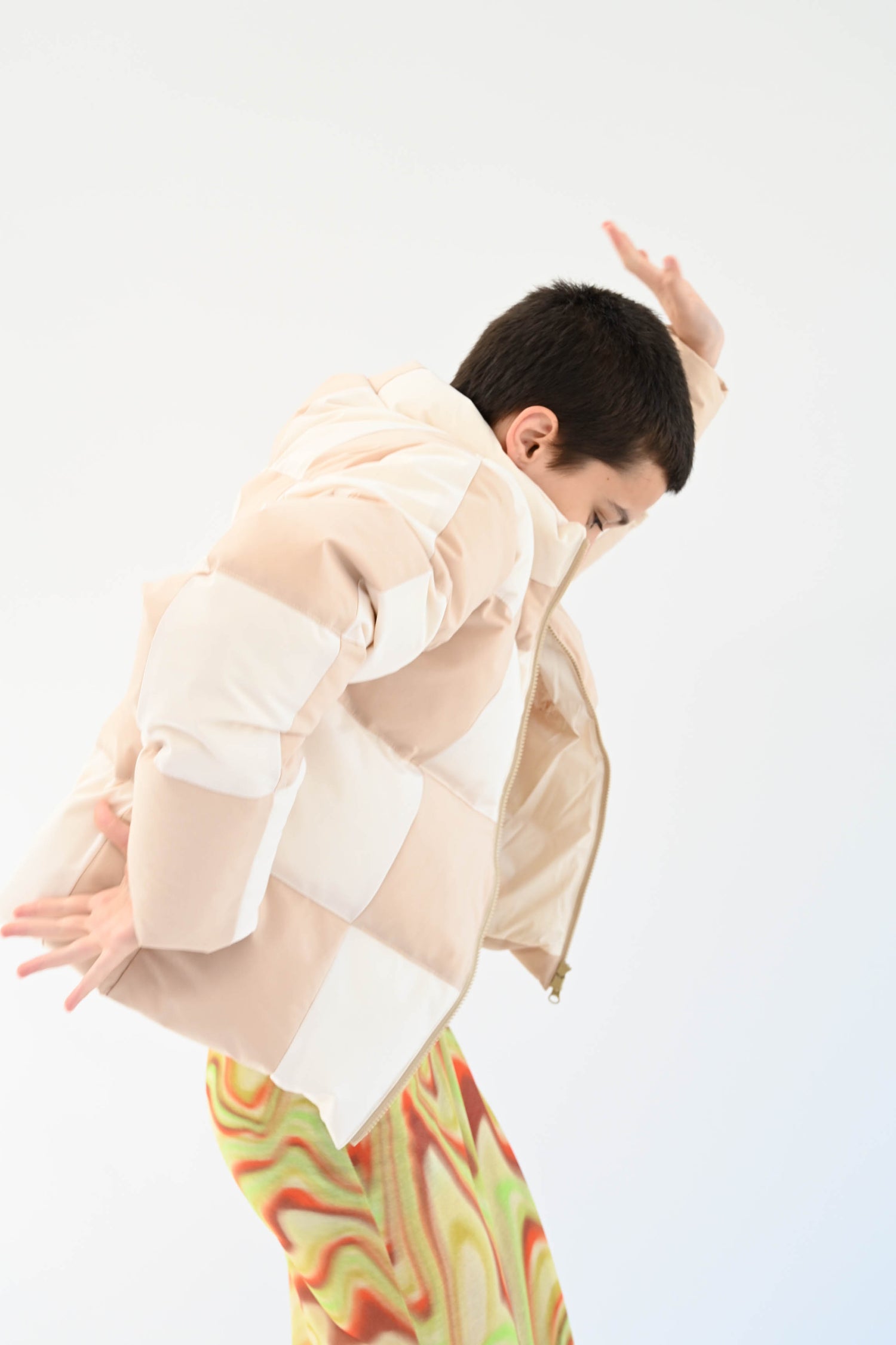 Checkered patch puffer jacket. Front two-way zip closure. Water-repellent. Two side pockets, one inside pocket. RDS* certified feather filling. 100% Sorona®, exterior. 100% recycled bottles polyester, lining.