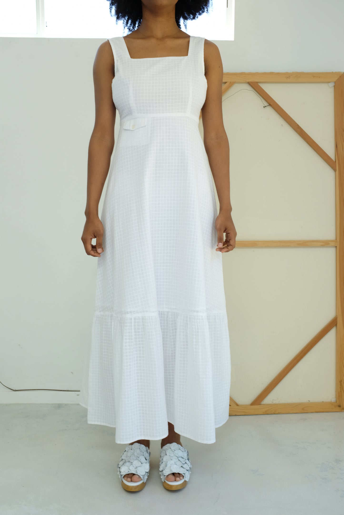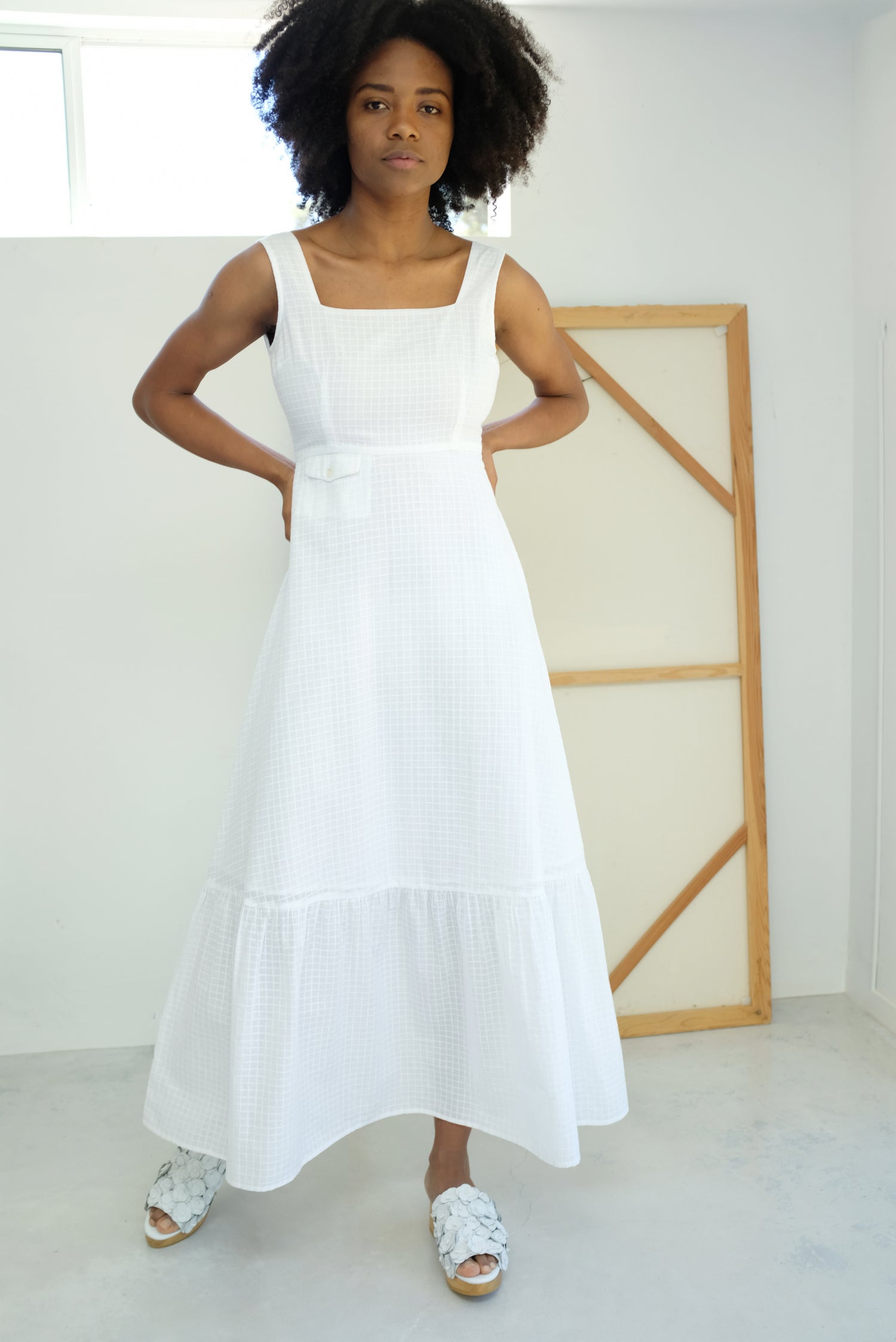 Long cotton dress with open back. Wide short sleeves and small lateral pocket. Fully lined. 100% cotton.