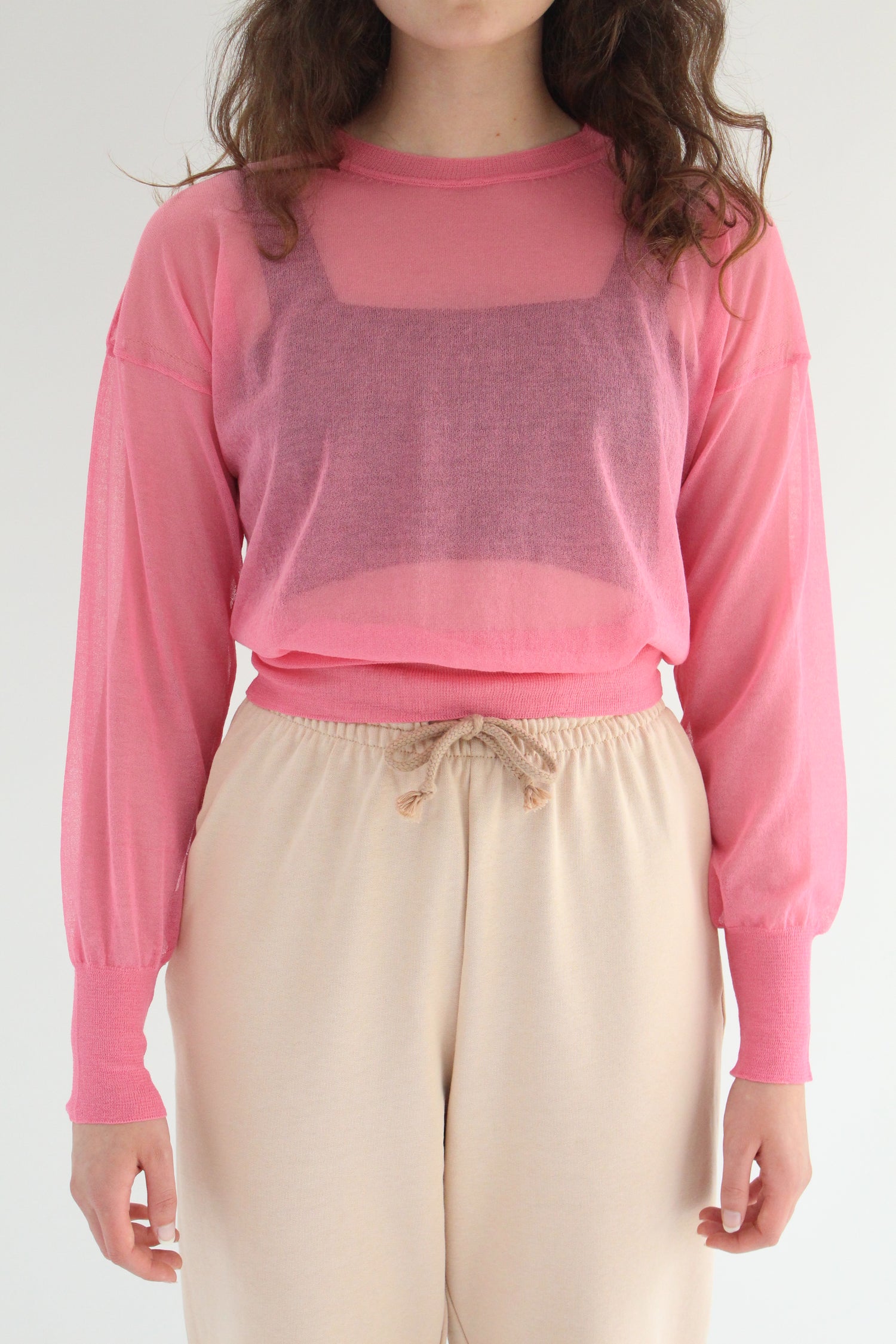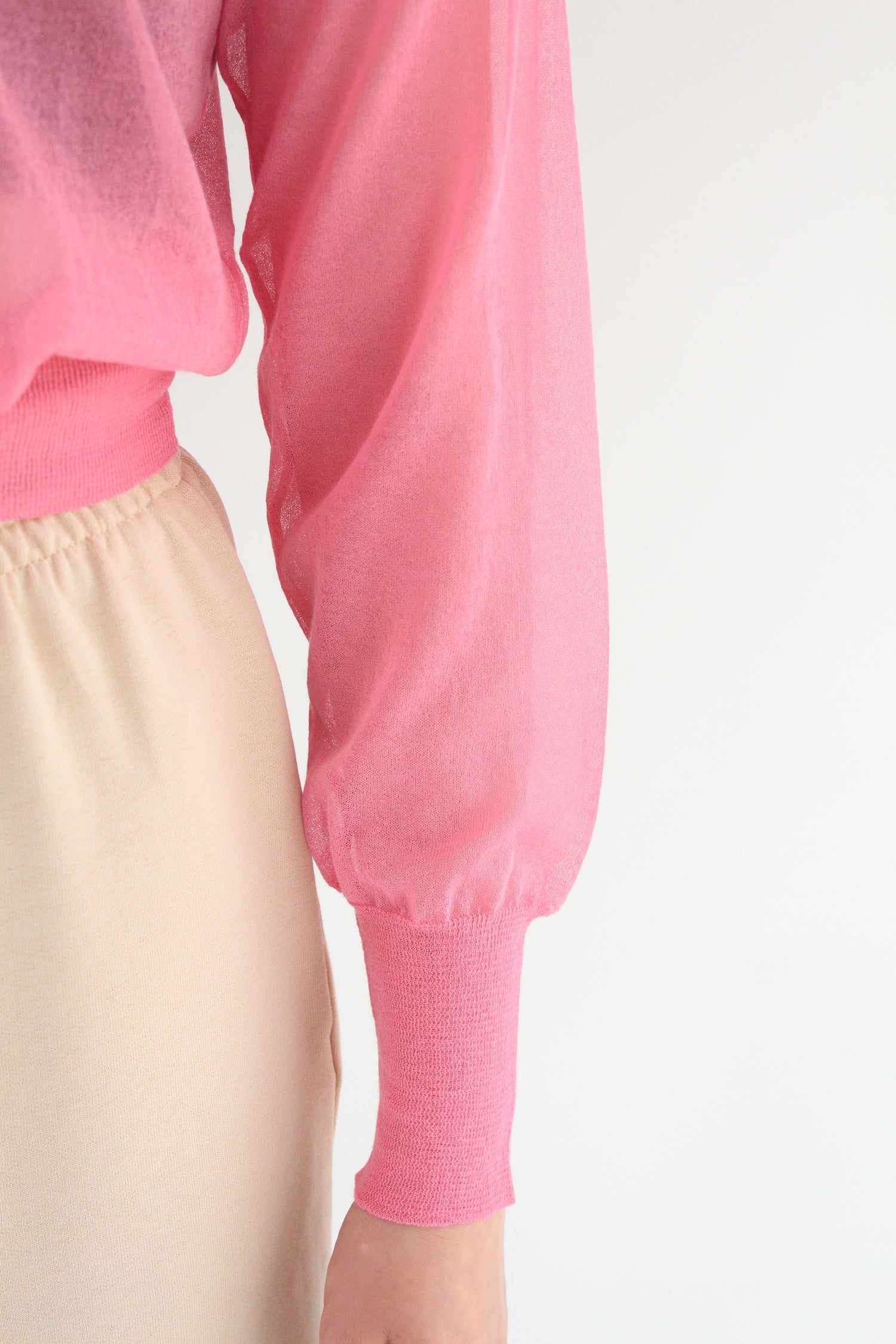 Super comfortable sheer knitted sweater with puff sleeve. Size down for a tighter fit. Model is wearing size small. 82% Cotton, 18% Polyamide