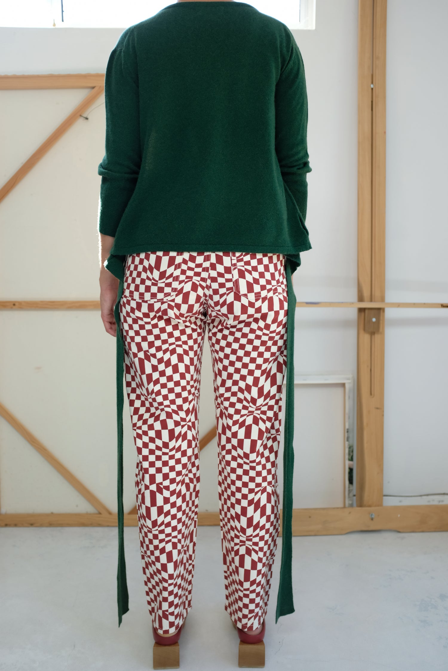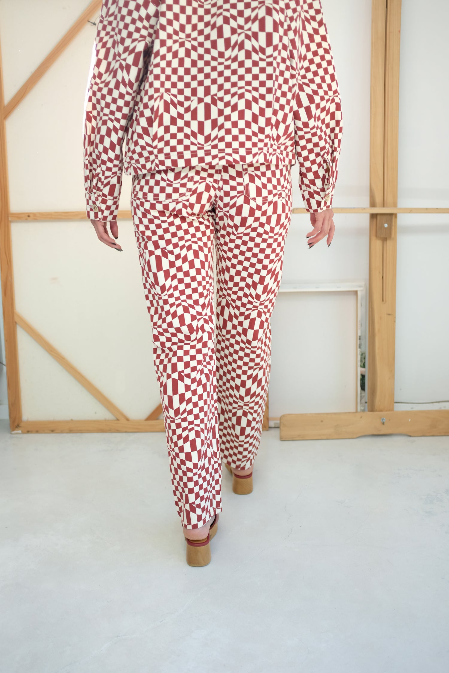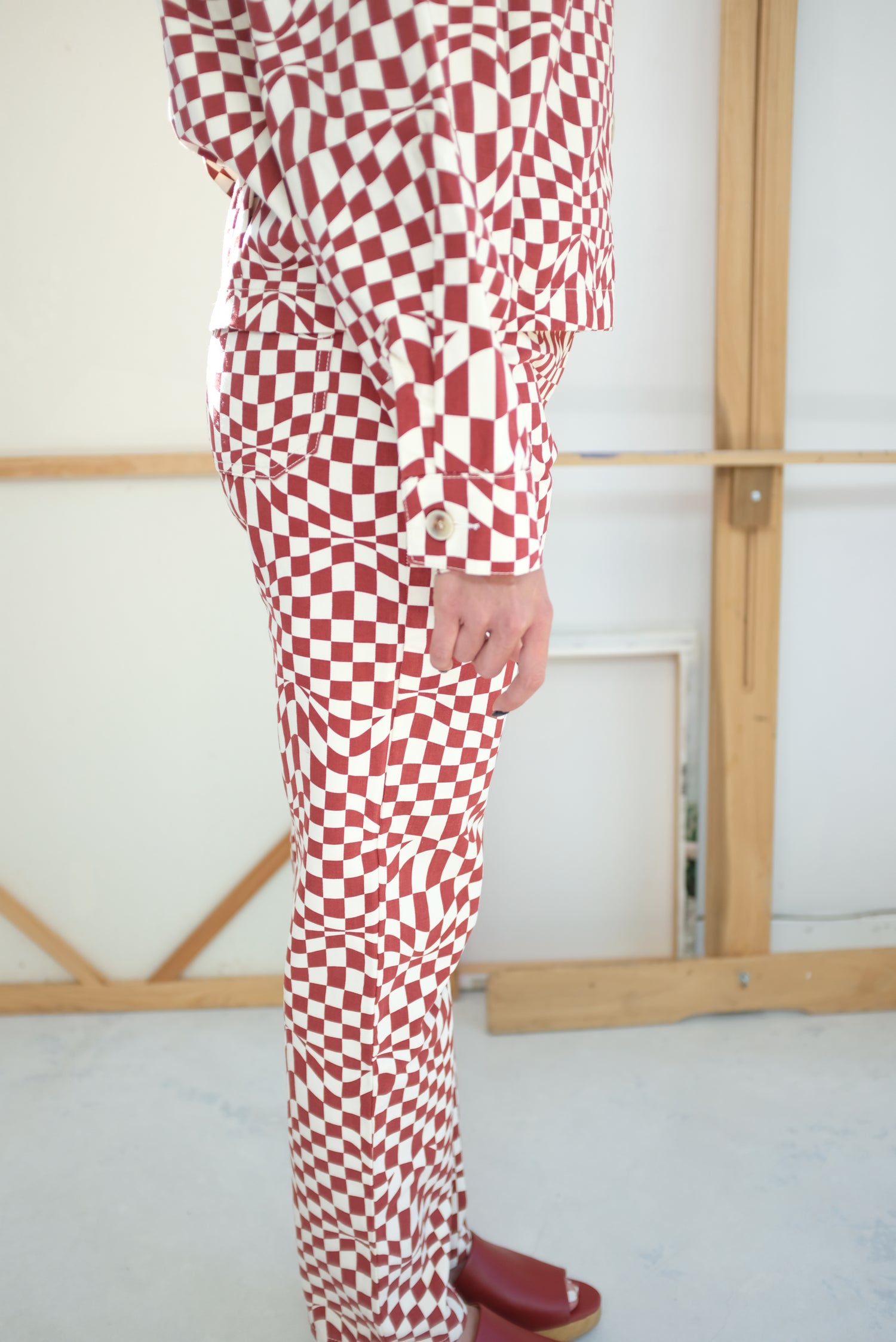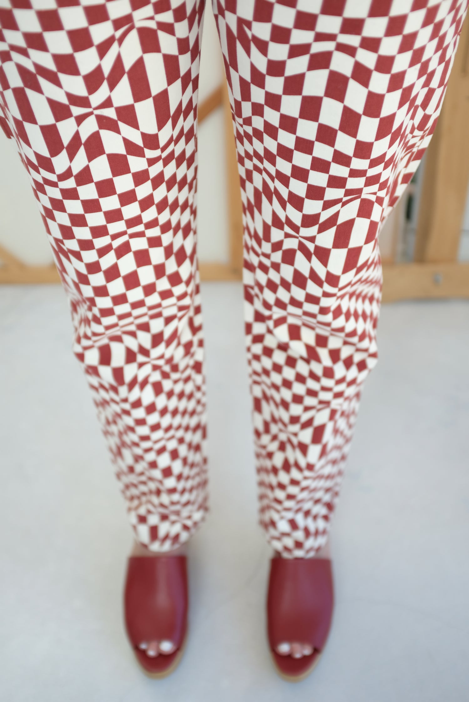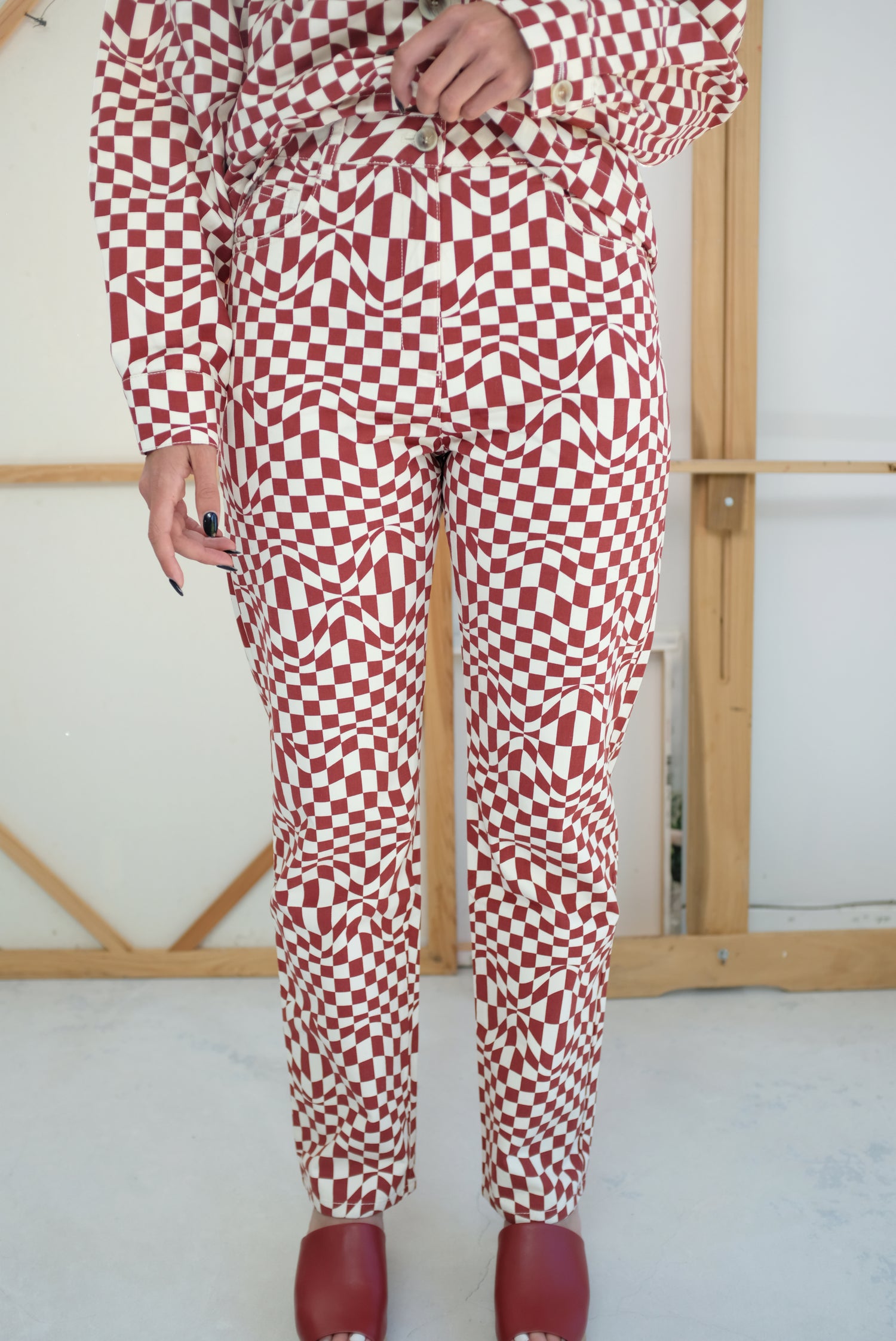 High waisted, five pocket, straight leg pants. Psychedelic check print. 98% Cotton, 2% Elastane.