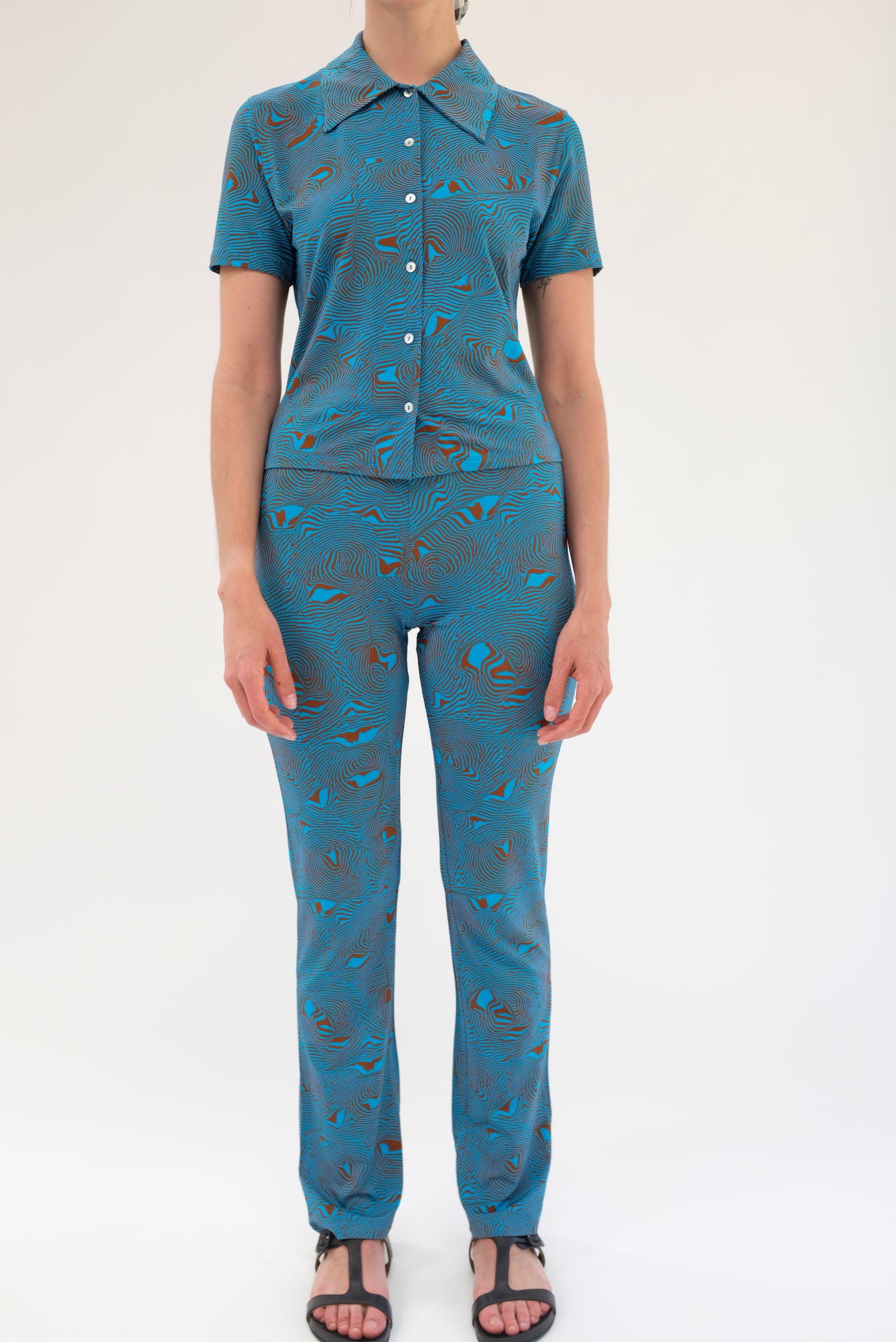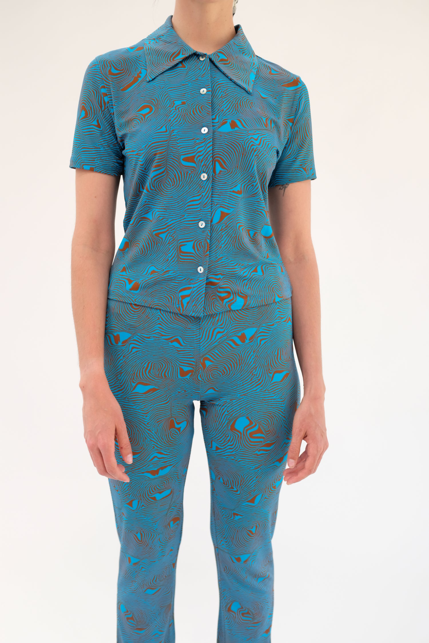 Stretchy medium weight top in psychedelic mosaic print. Slightly cropped, short sleeve, pearlized button down, standard collar. 95% Viscose, 5% Elastane.