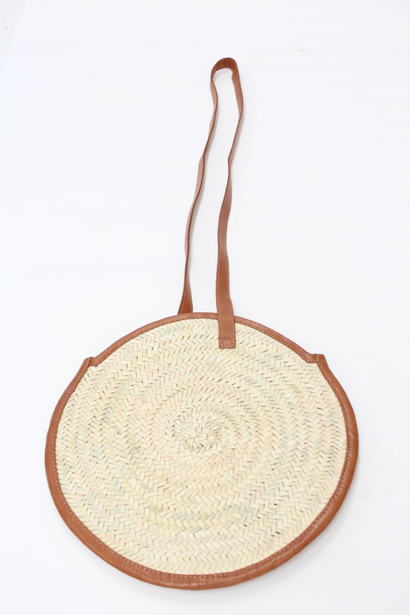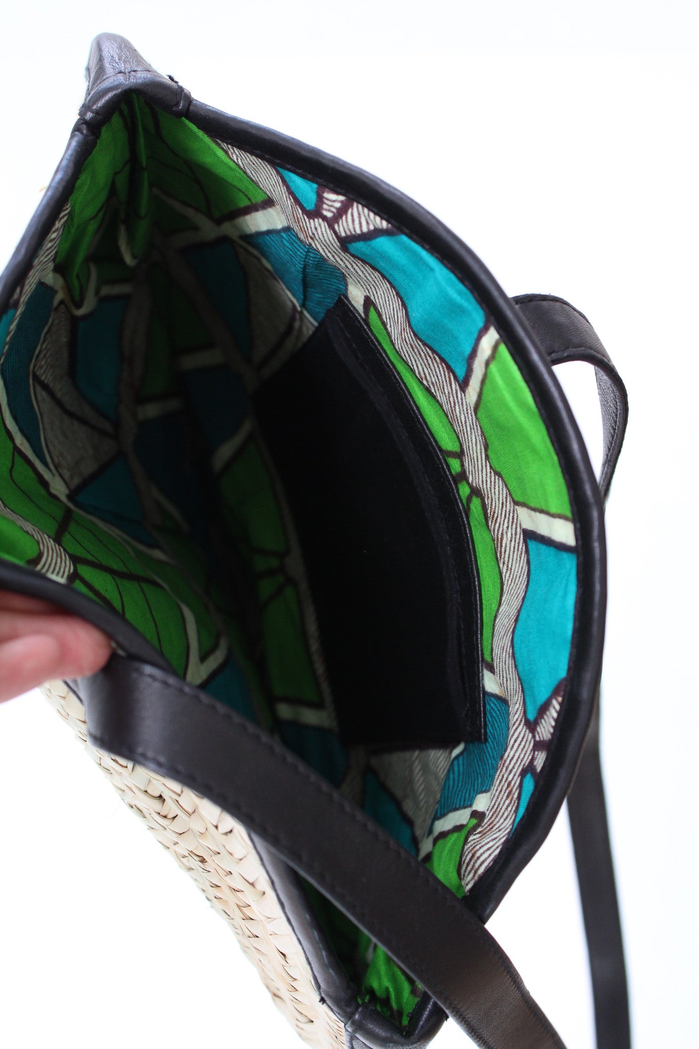 Hand woven in Morocco, circular, palm leaf and leather trimmed purse, lined inside with inside pocket. Available in either black or brown leather trim. Knot top leather for a more adjustable fit.