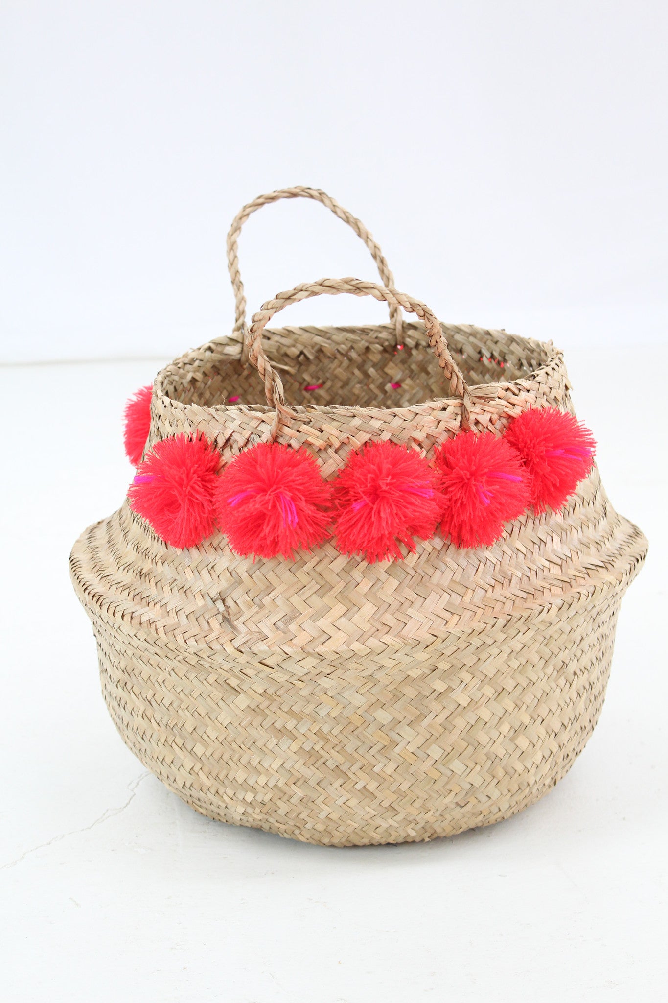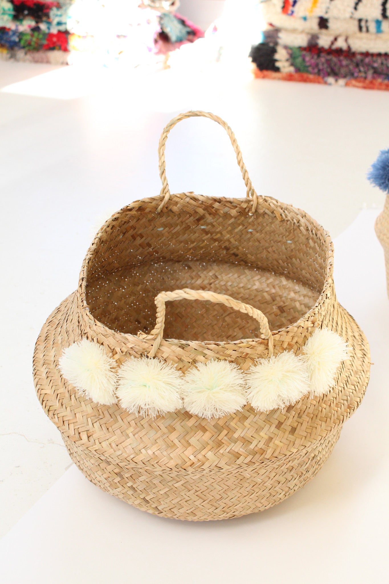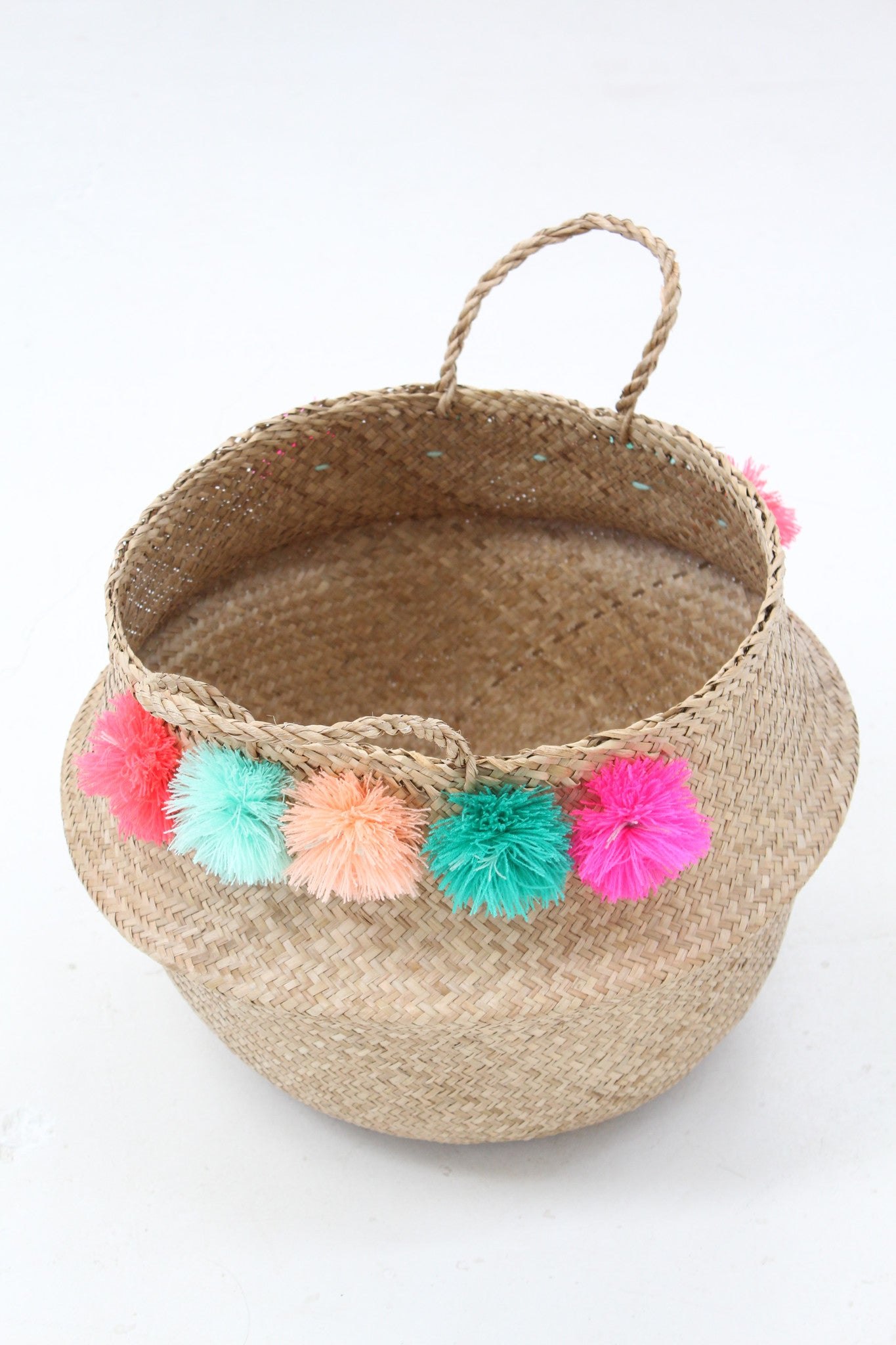 This is the tall and large version of the best baskets ever. -colorful pom poms, 2 handles & aprox. 15" X 15" round. Baskets are handmade and one of a kind. Perfect for so many things from magazines, to laundry, towels, plants, to the moon and back! Pack down and great for travel. They are sure to bring great pleasure.