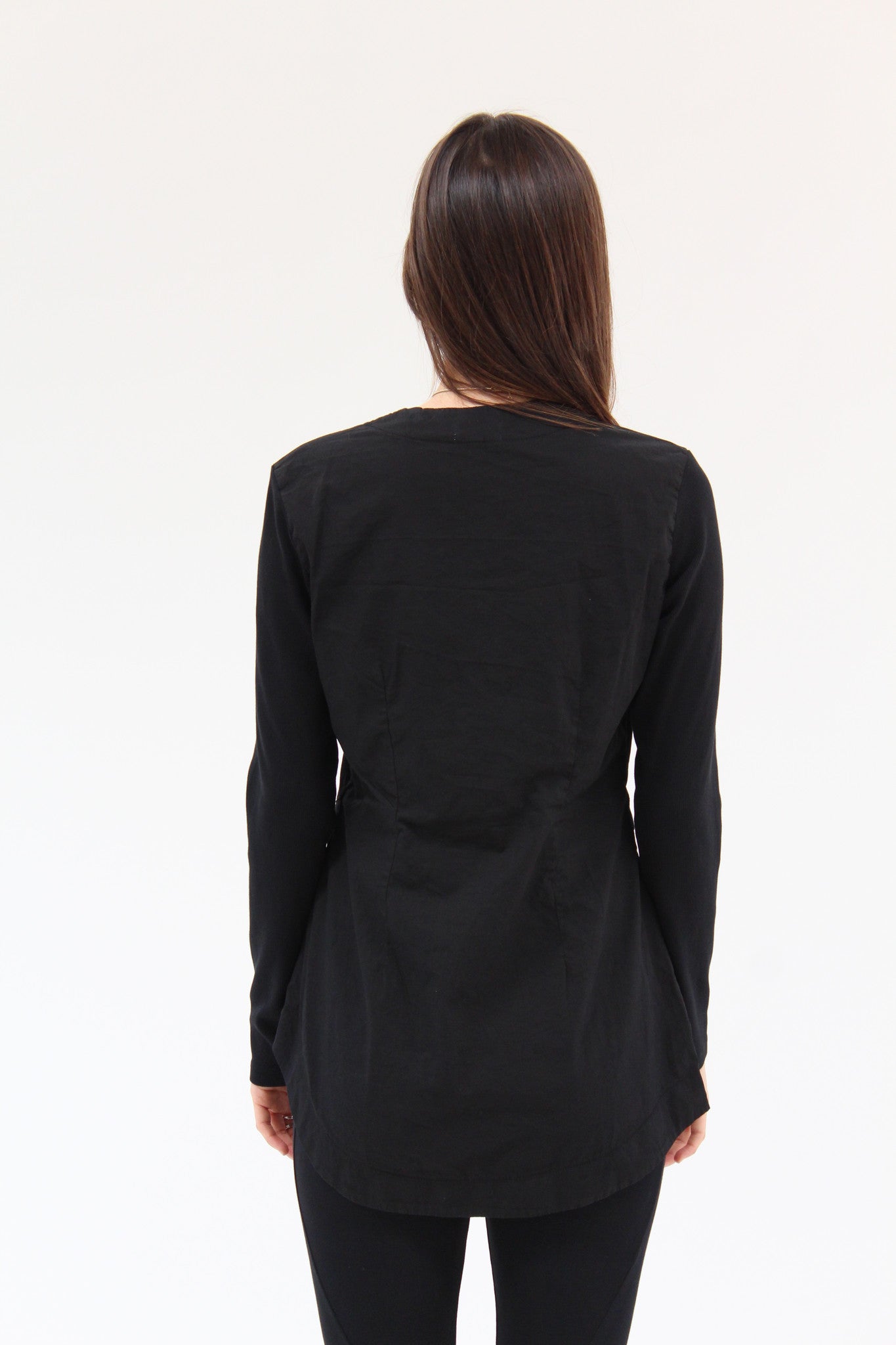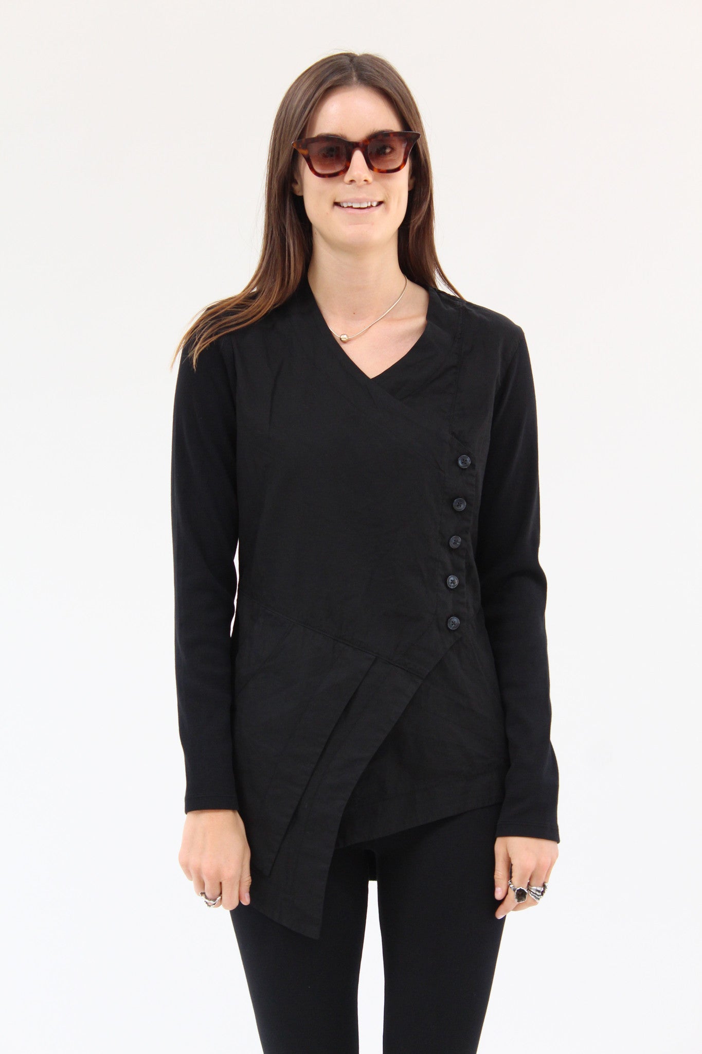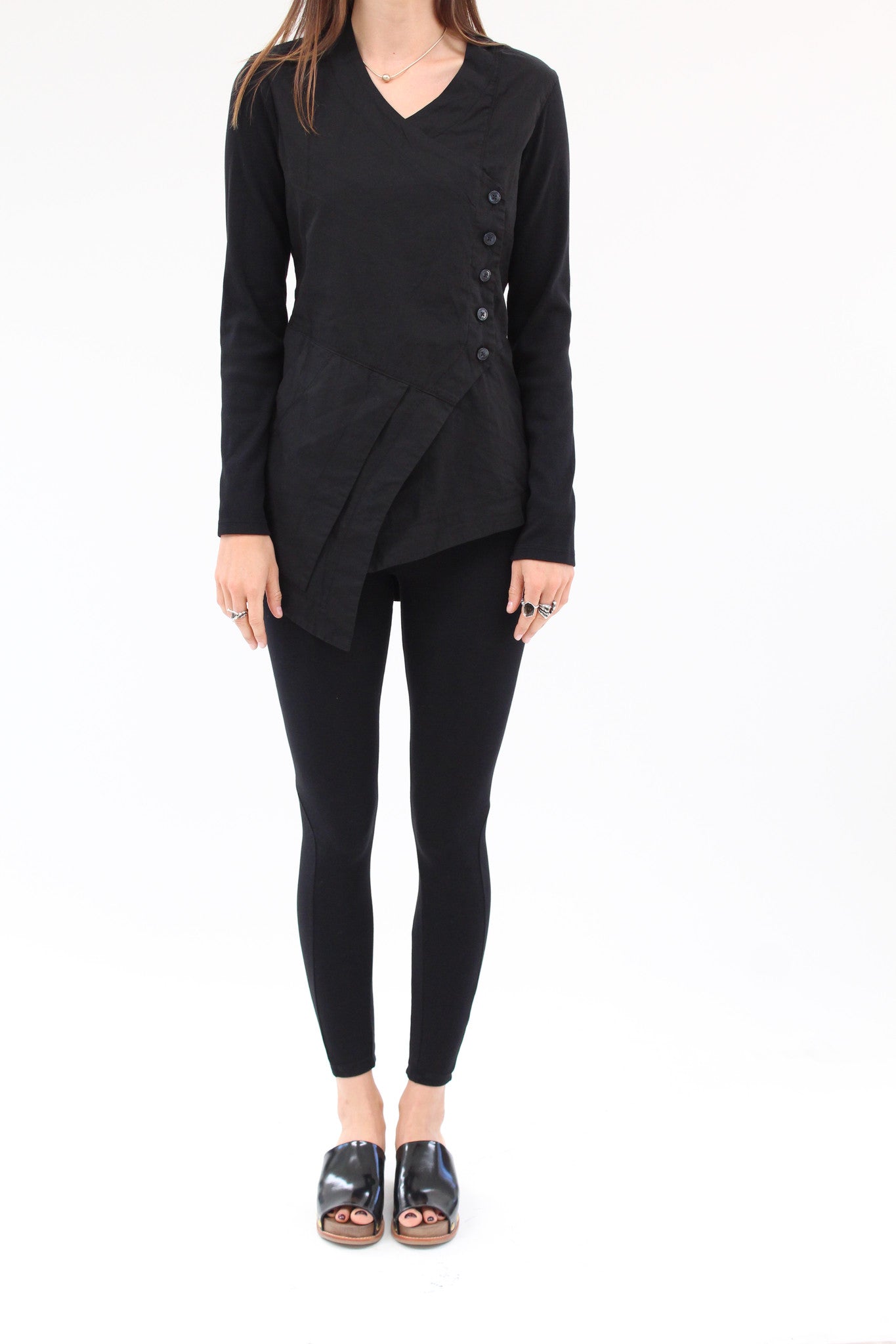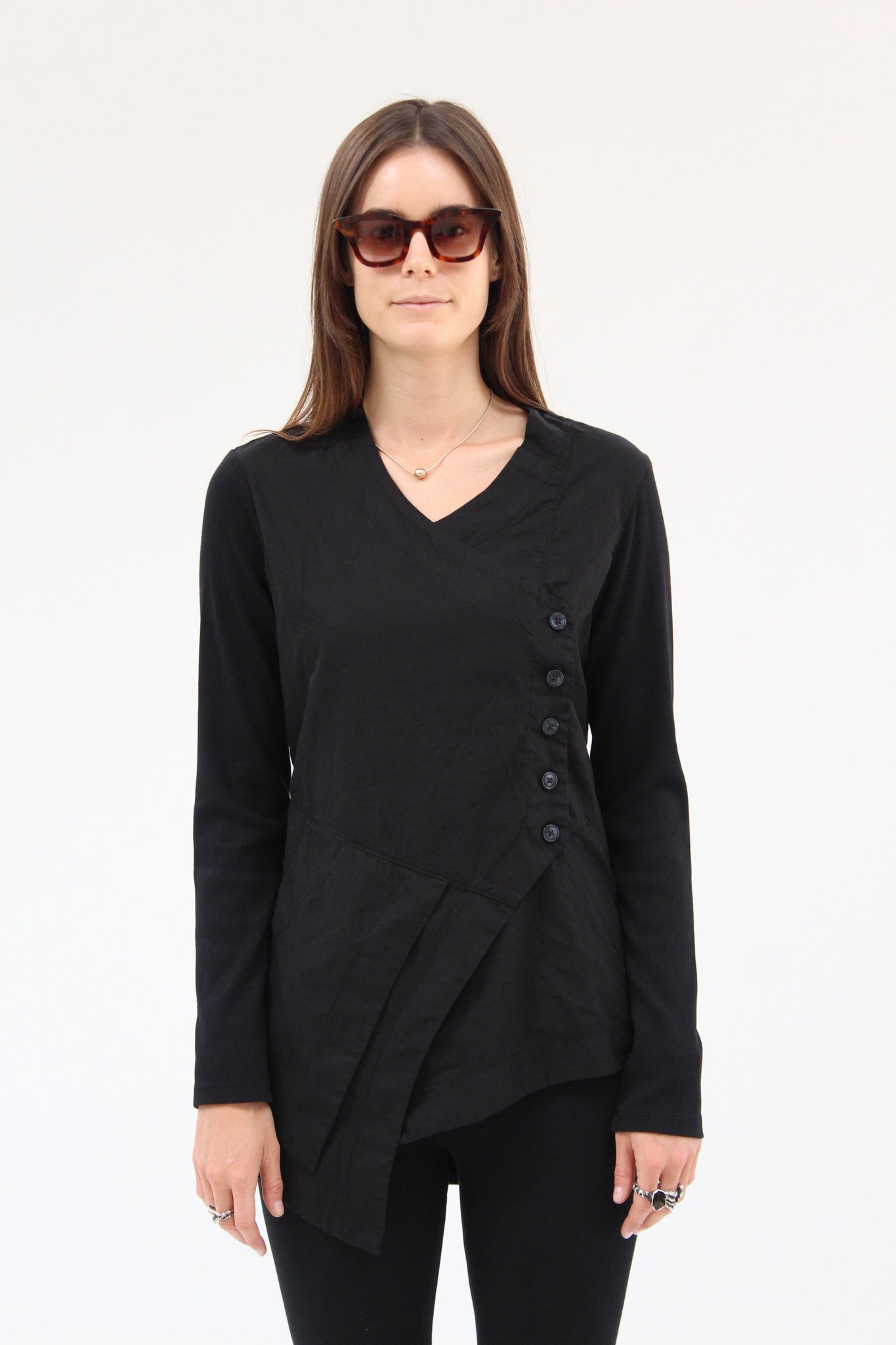 V-neck, five side buttons, asymmetrical hem and ribbed jersey sleeves. Machine washable. Organic cotton blend. Runs true to size. Abigail is wearing size small.