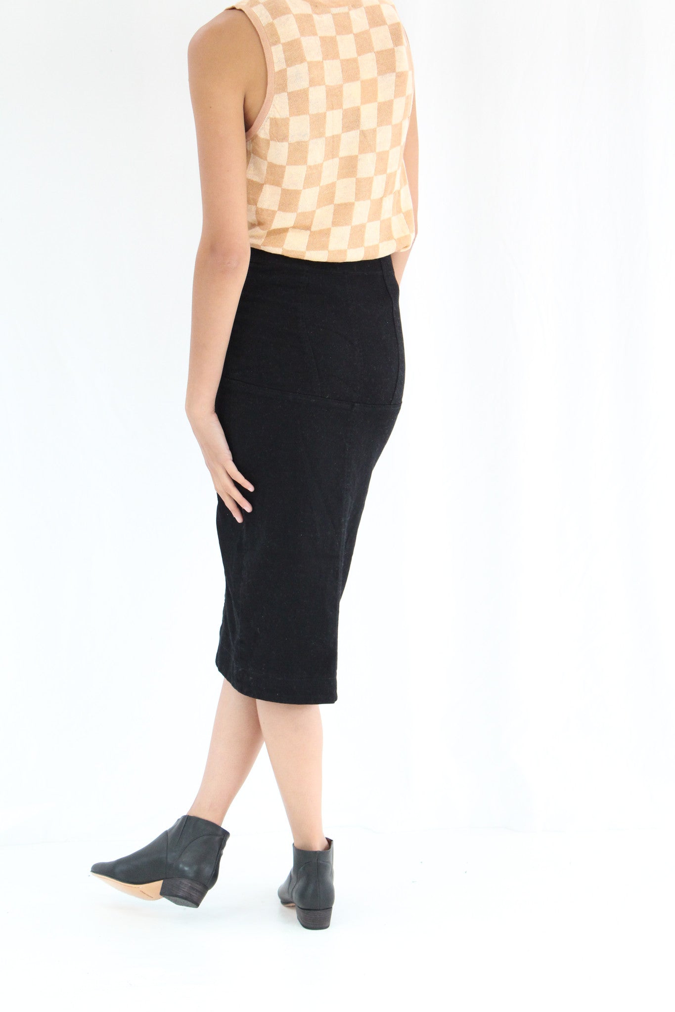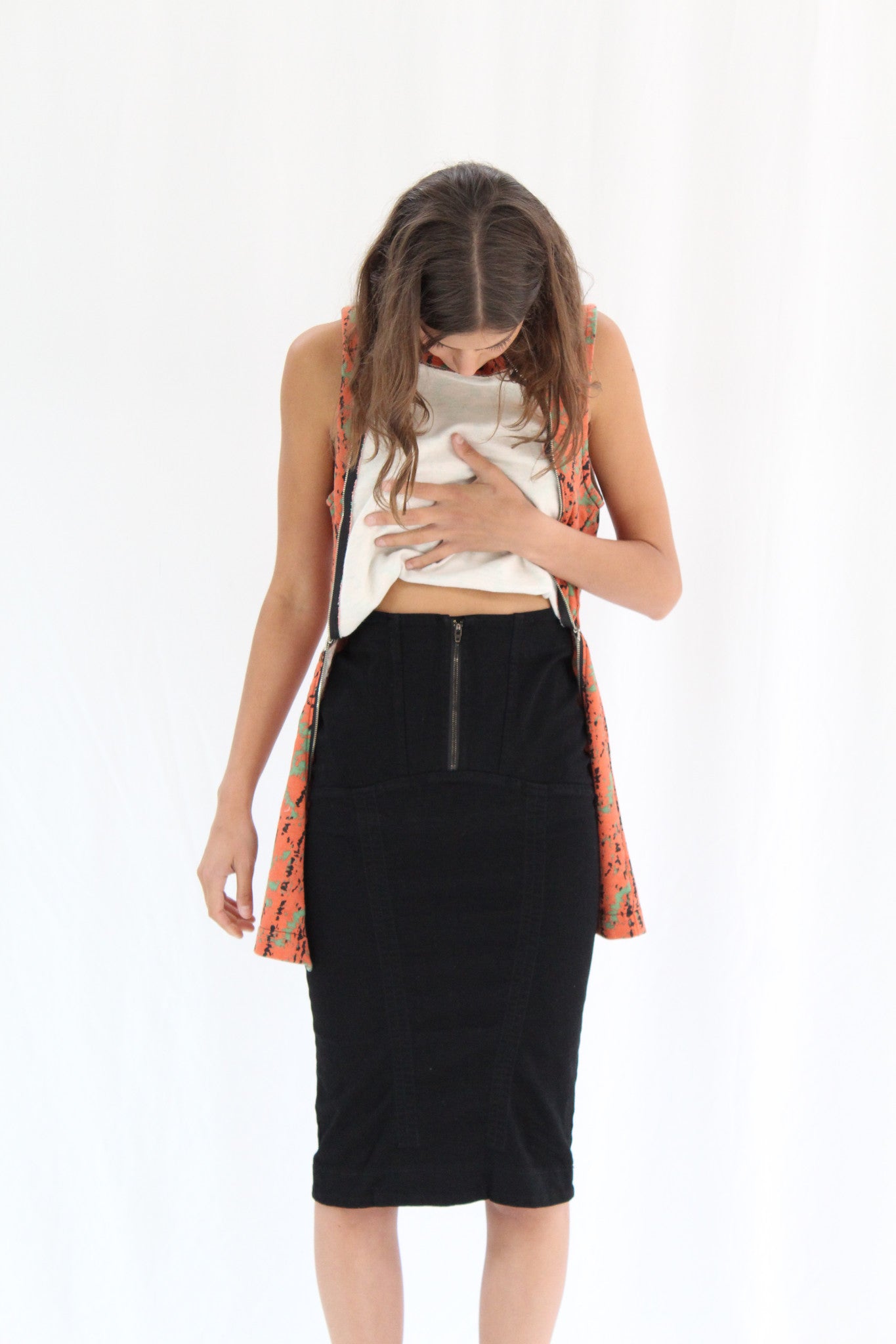 Denim pencil skirt with interior twill tape channels to adjust draping and length, exposed front zipper at true waist, girdle seaming, adjustable twill tape channels run the length of legs, scalloped effect. 98% Organic cotton 2% elastane denim twill.
