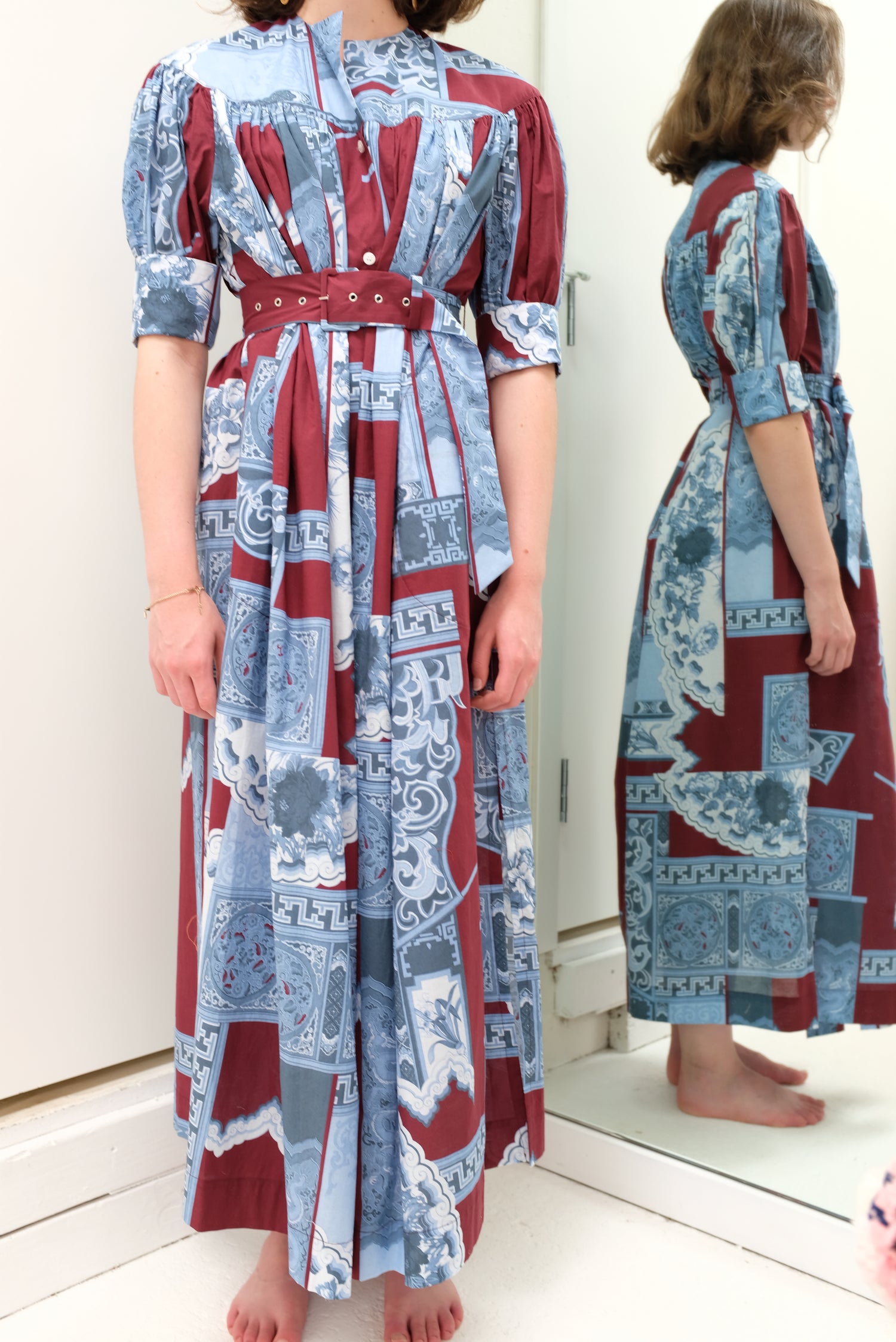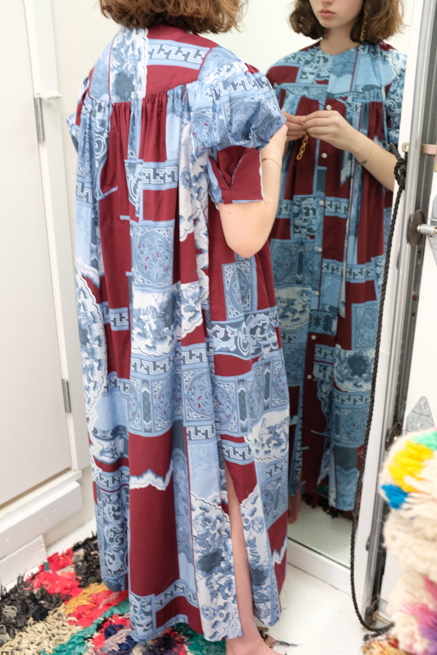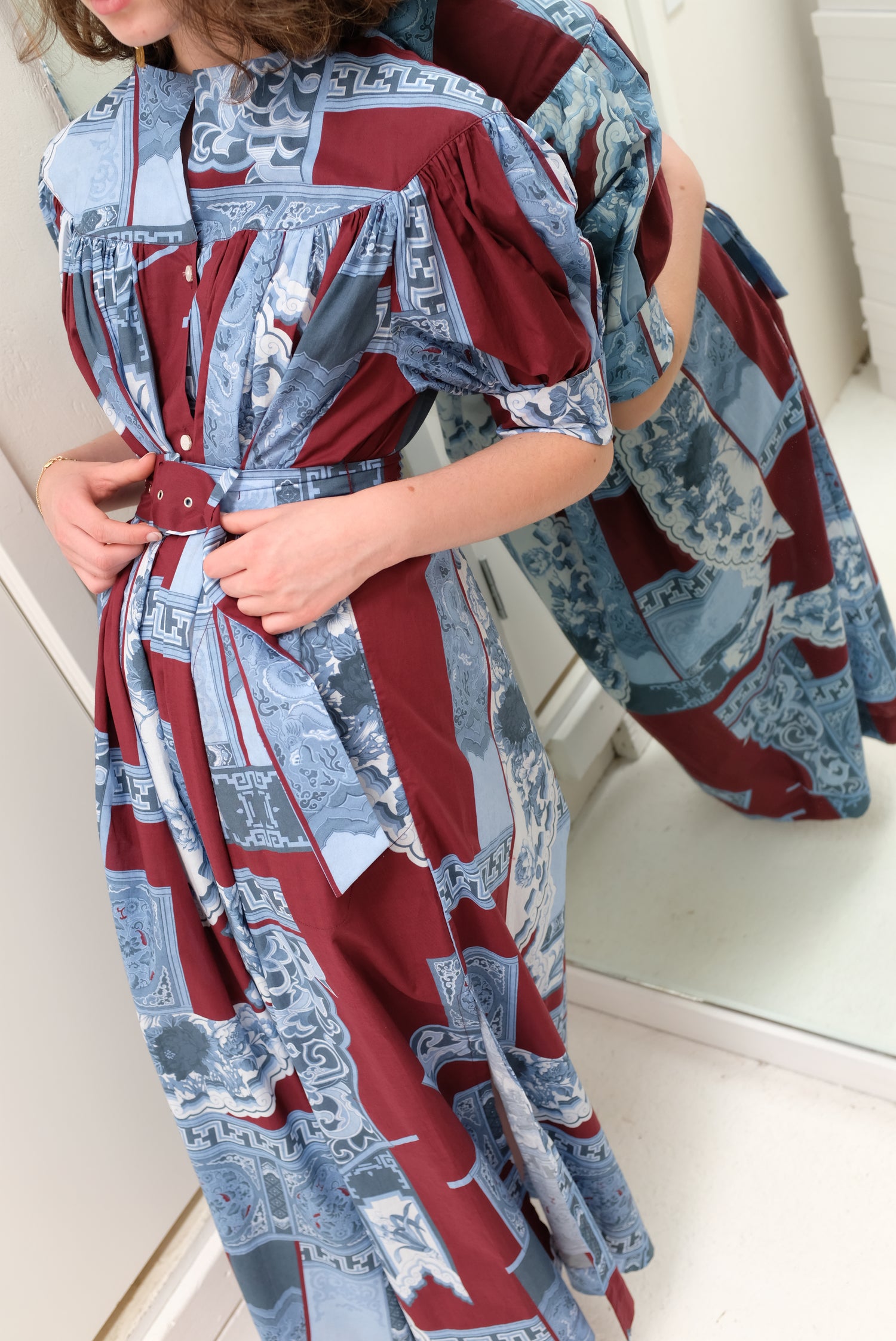 Midi dress with front button closure, voluminous short sleeves, and removable matching belt. Side pockets. Full, gathered silhouette. Artwork comes from a famed Italian mill, different motifs are juxtaposed with each other, to modernize the traditional Chinese artwork. Every garment will be unique. 100% Cotton.