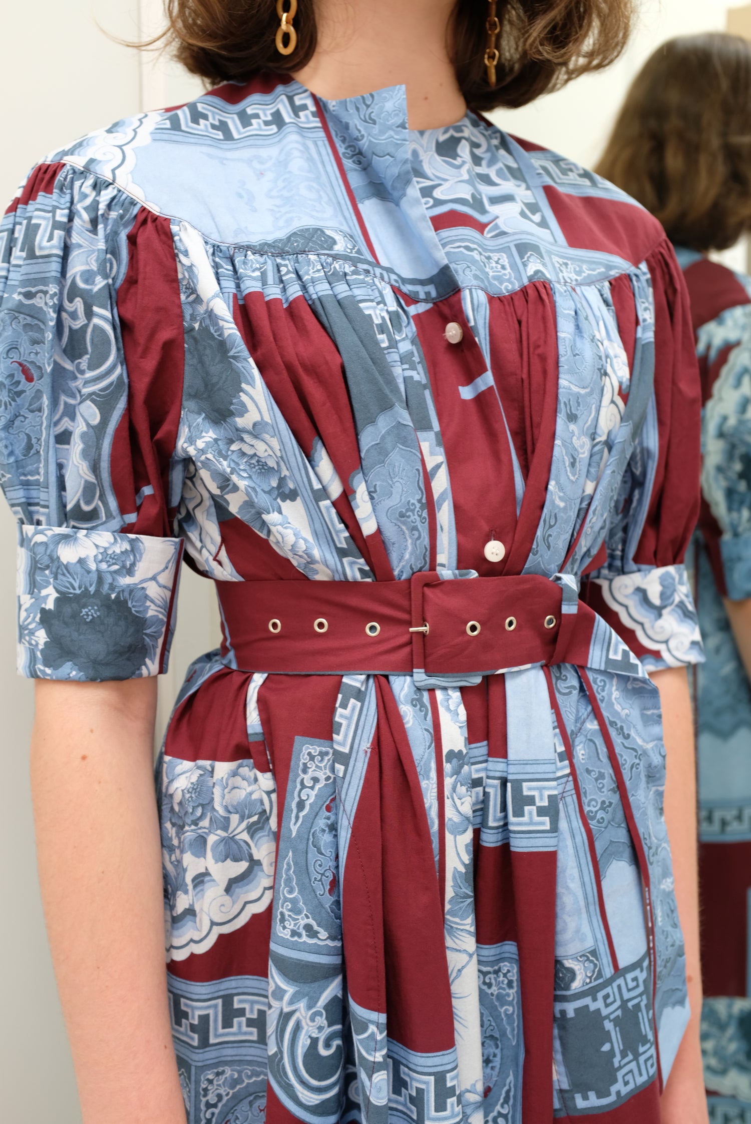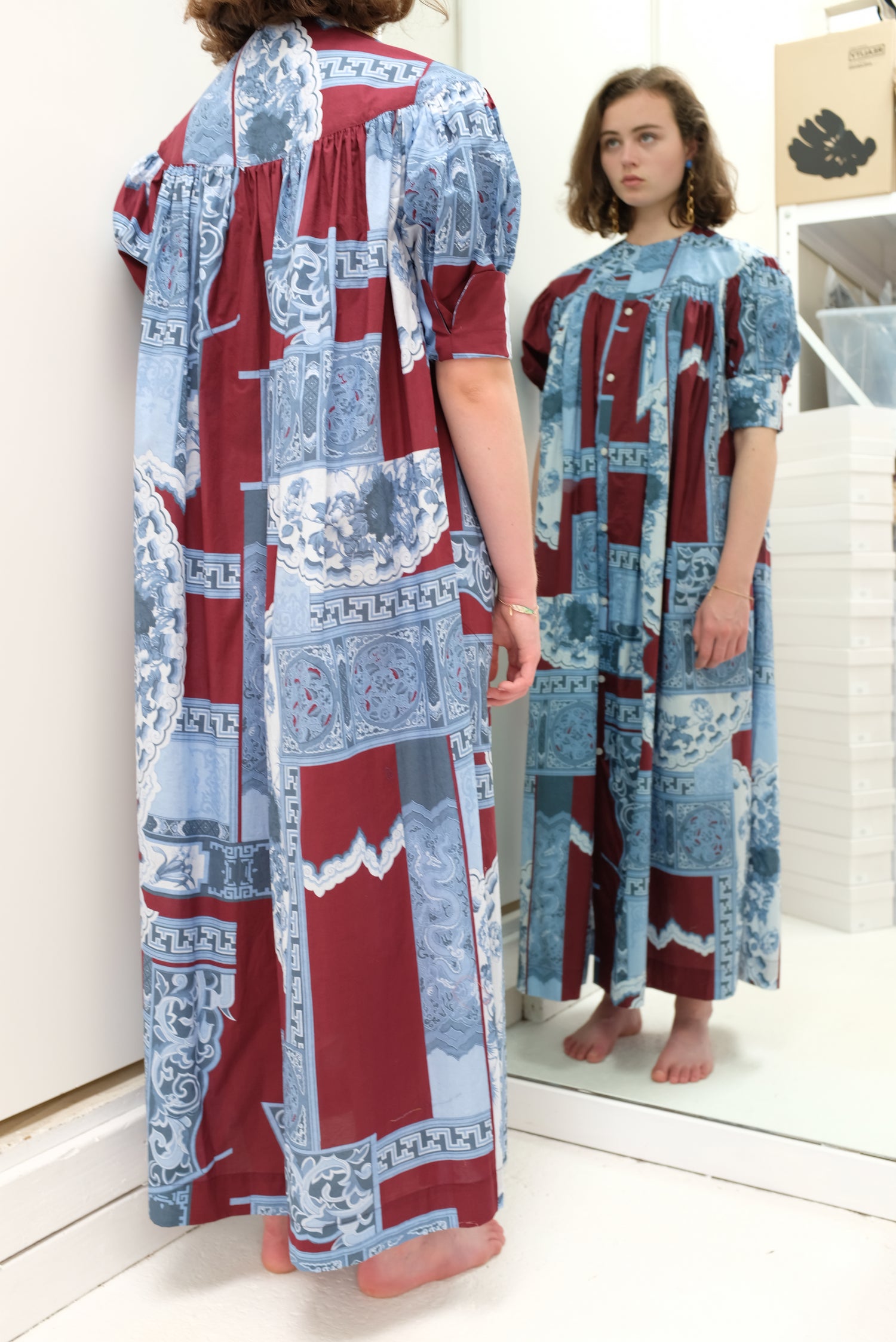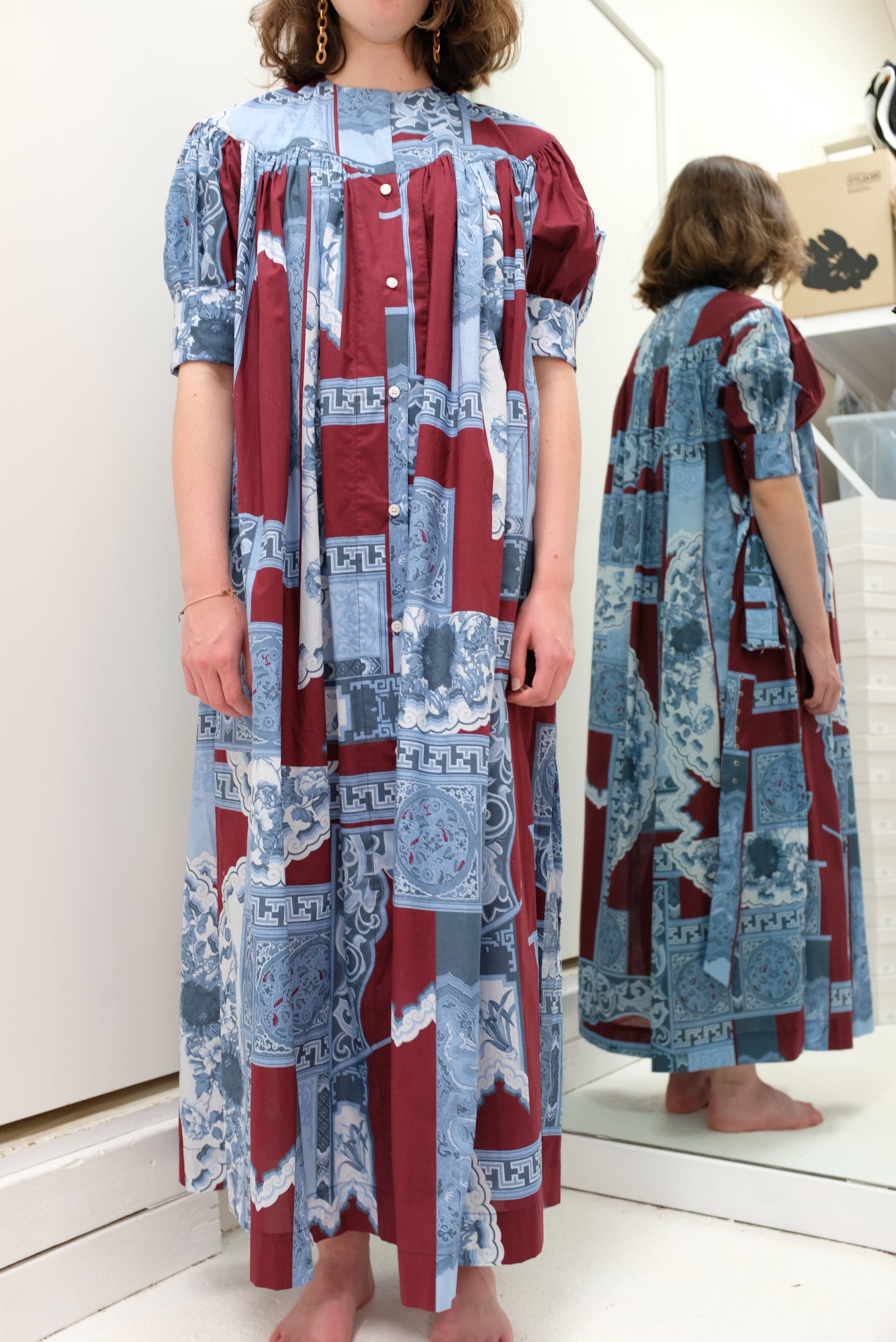 Midi dress with front button closure, voluminous short sleeves, and removable matching belt. Side pockets. Full, gathered silhouette. Artwork comes from a famed Italian mill, different motifs are juxtaposed with each other, to modernize the traditional Chinese artwork. Every garment will be unique. 100% Cotton.