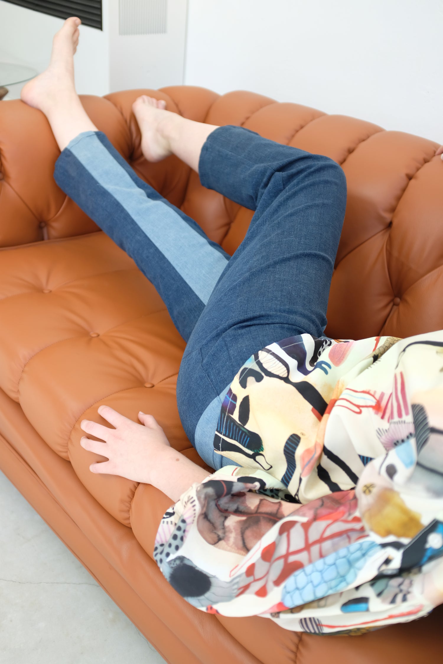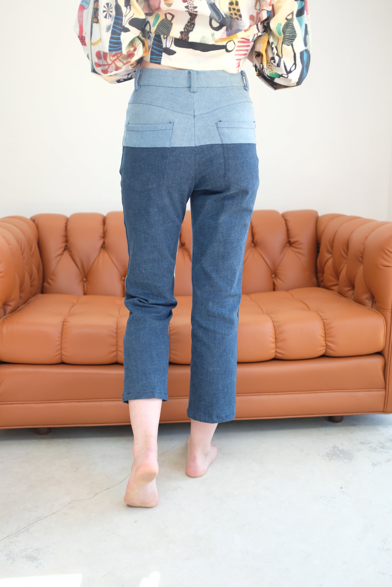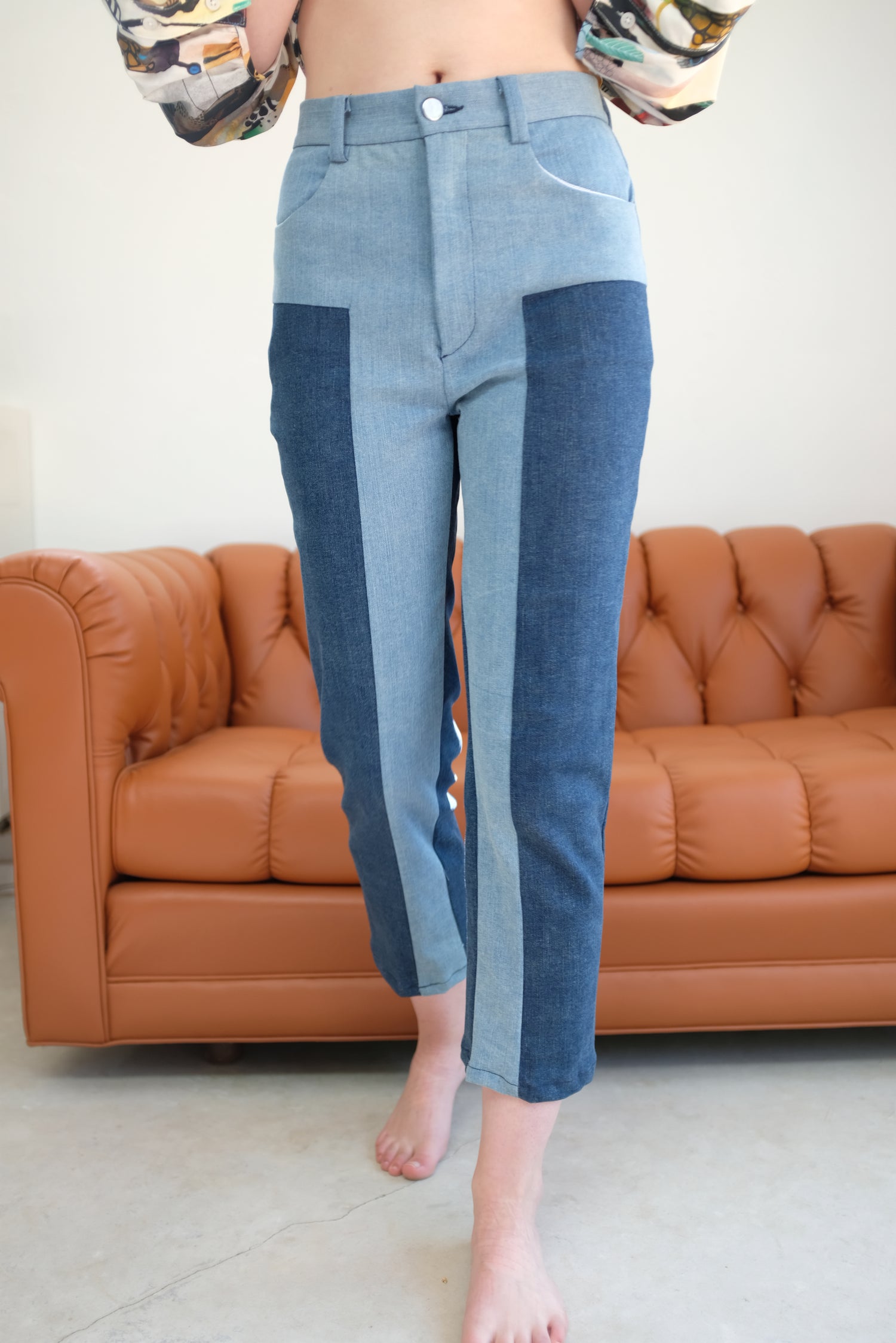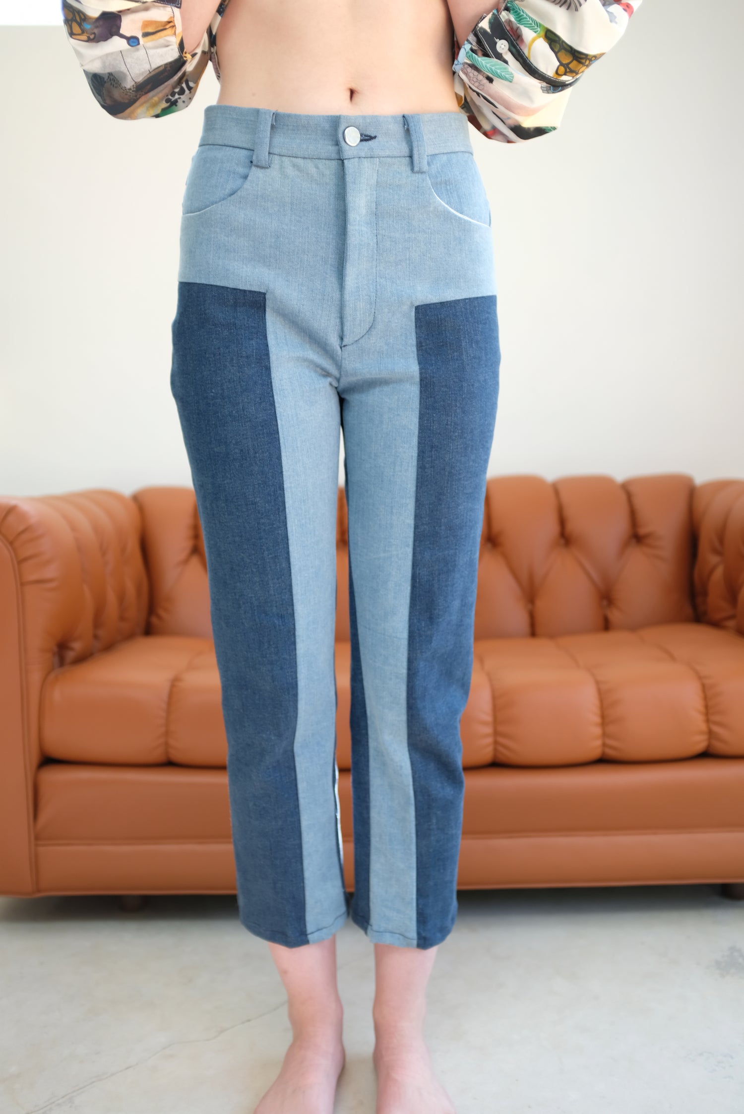 Mid-rise pant, four pocket design with back yoke, split color leg, concealed zip up fly with button closure. Straight leg, slightly cropped. 89% Cotton, 8% Polyester, 3% Elastane.