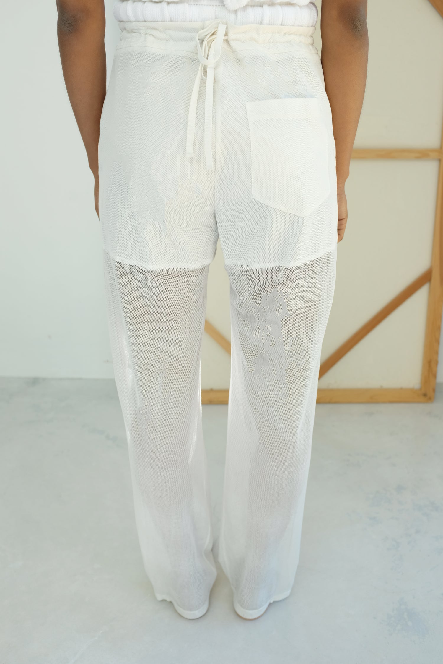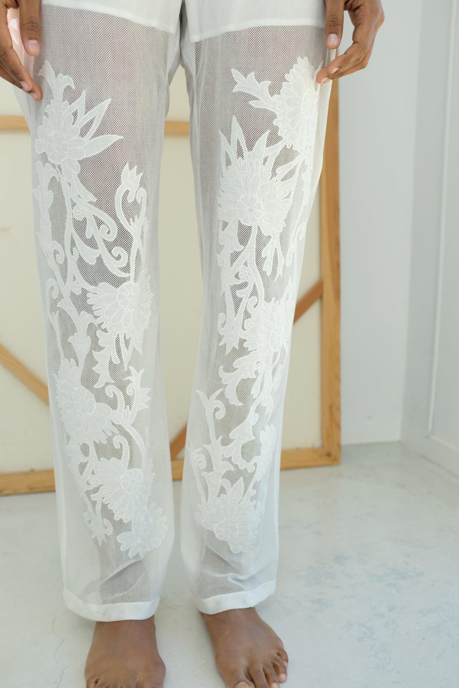 Cotton mesh pant, embroidered flower pattern down leg front. Dress up or down. Lined shorts under pant. Natural rise, button fly and closure, front slit pockets, rear waist v-insert with adjustable drawstring at back of waist, single back patch pocket, gusseted crotch, adjustable button tab at ankle hem. Relaxed fit. 100% cotton.