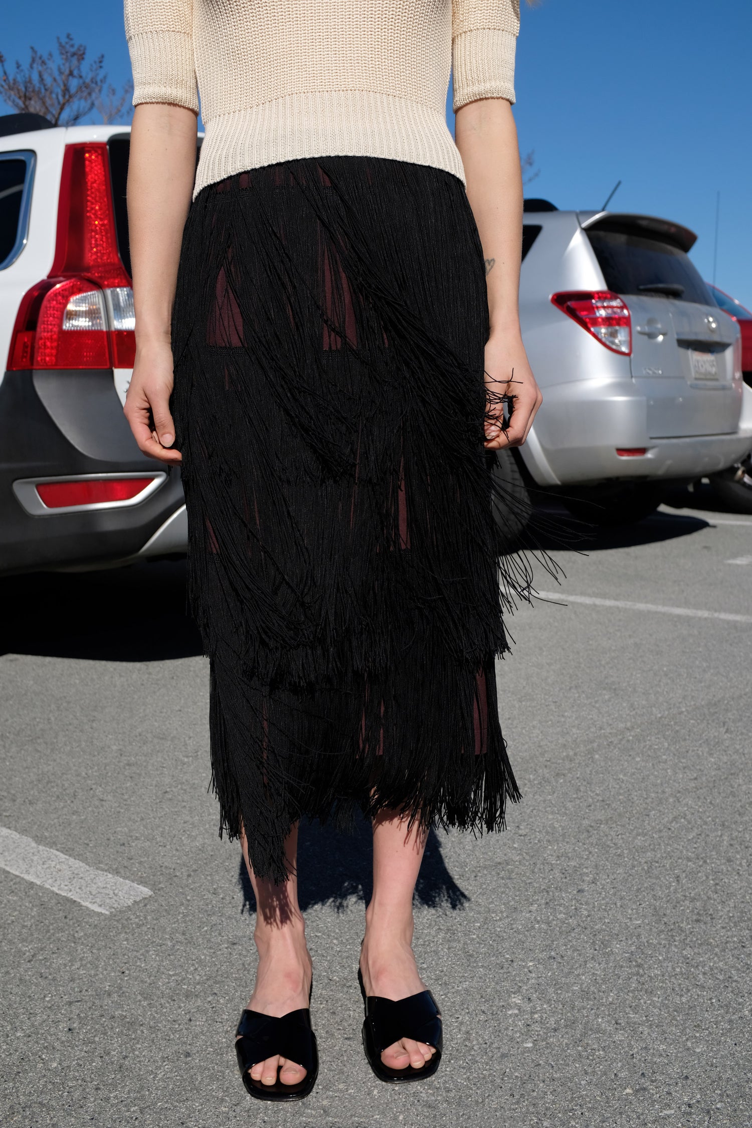 Slim cut, maxi skirt with cascading tiers of black fringe. Contrast waistband at high waist, hits mid-calf. Concealed zipper at back. Weighty, flattering fit. Fully lined. 70% silk, 30% linen. Fringe is 100% rayon.