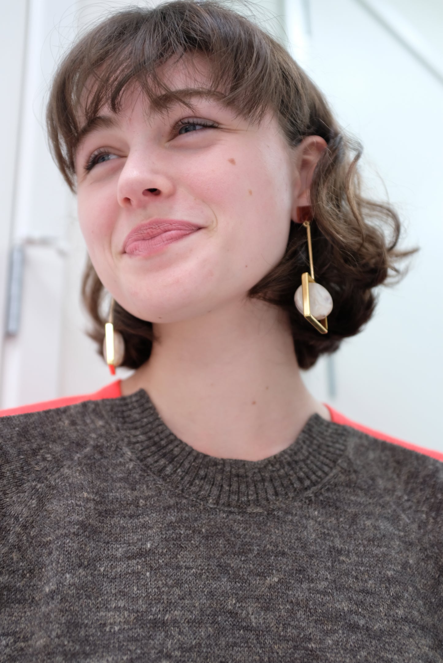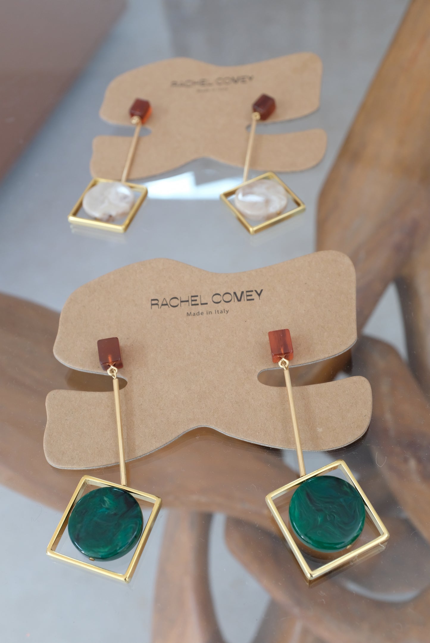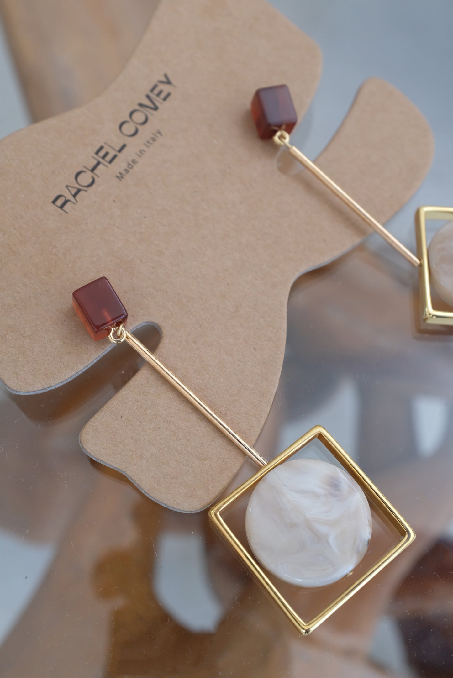 Acrylic and brass drop earrings. Stud fastening for pierced ears. Plated steel post. Aprox 3.5"
