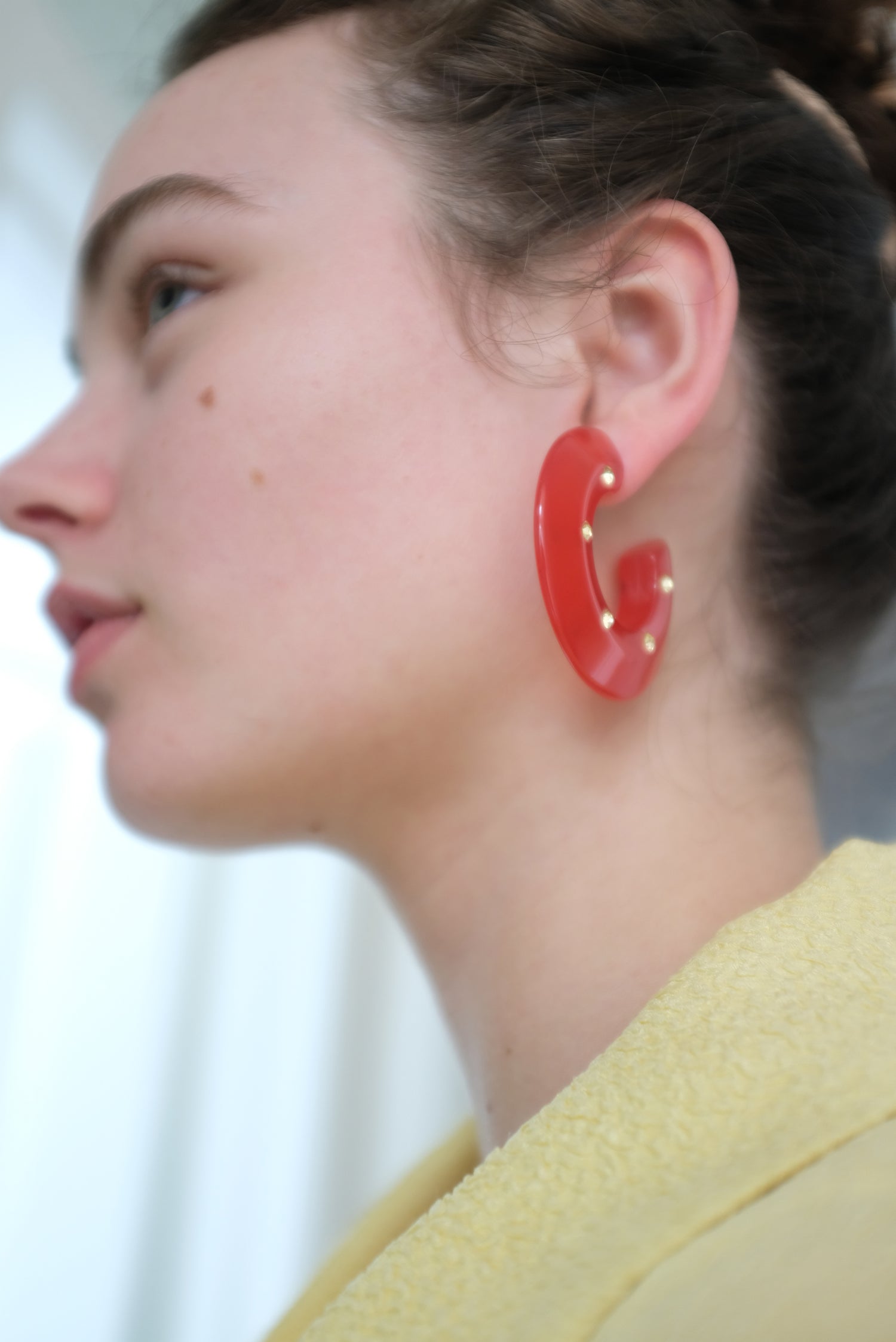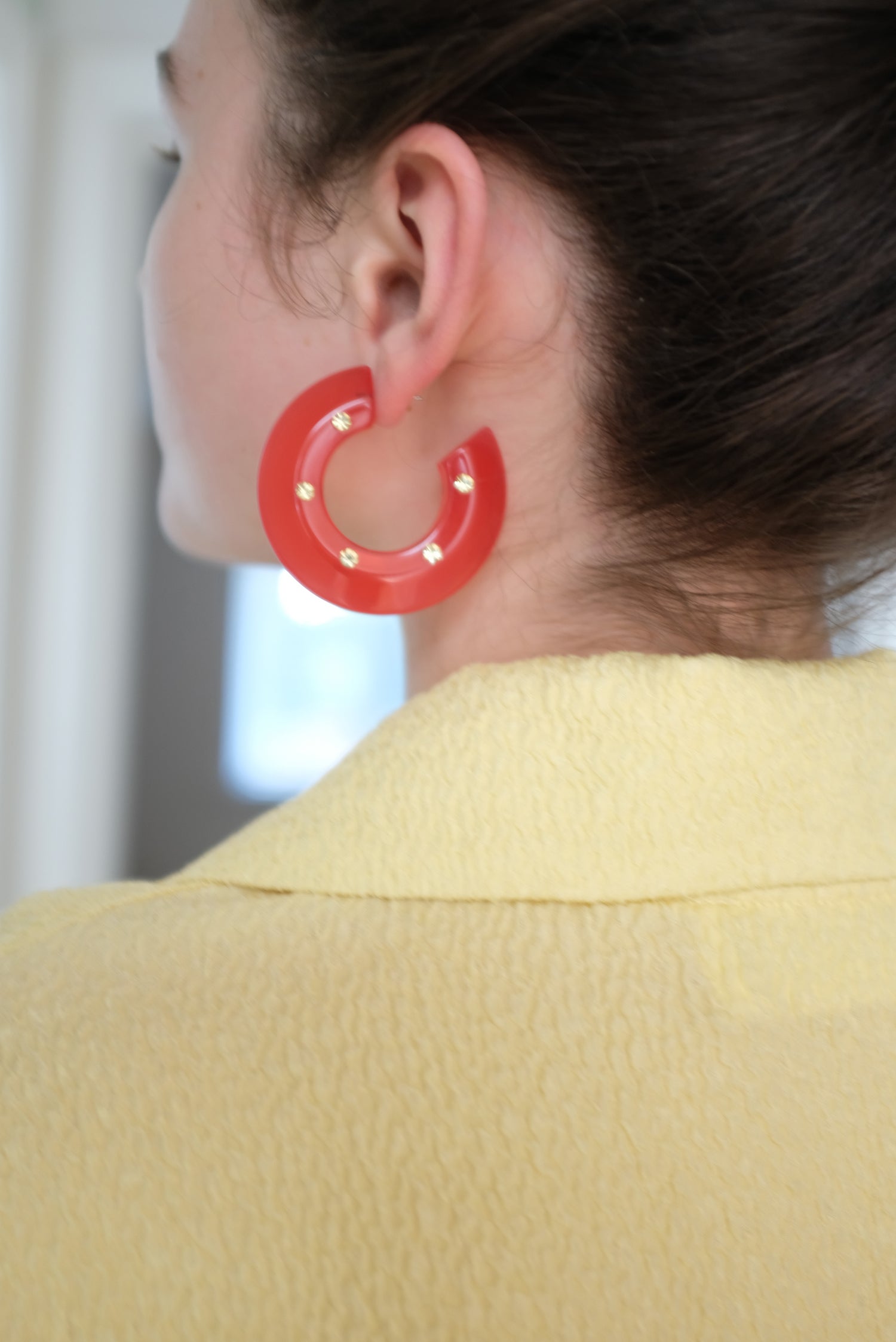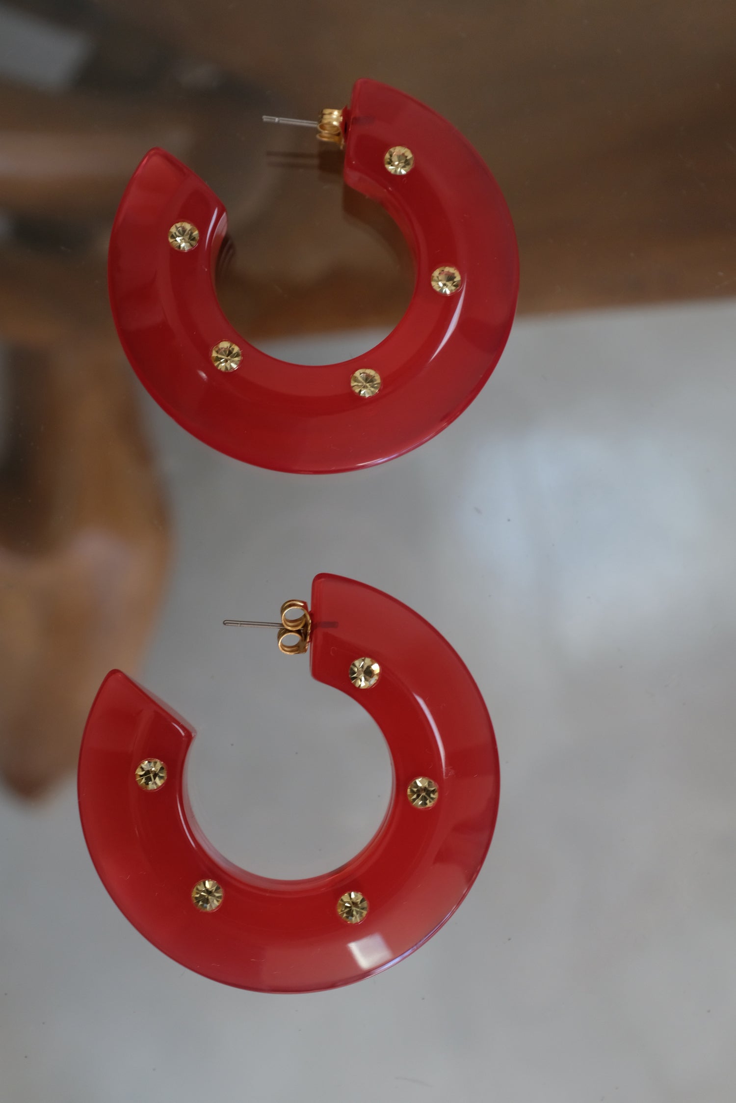 C-shaped acrylic hoop earrings with embedded rhinestones. Plated steel posts with gold fastening for pierced ears. Aprox 2" diameter.