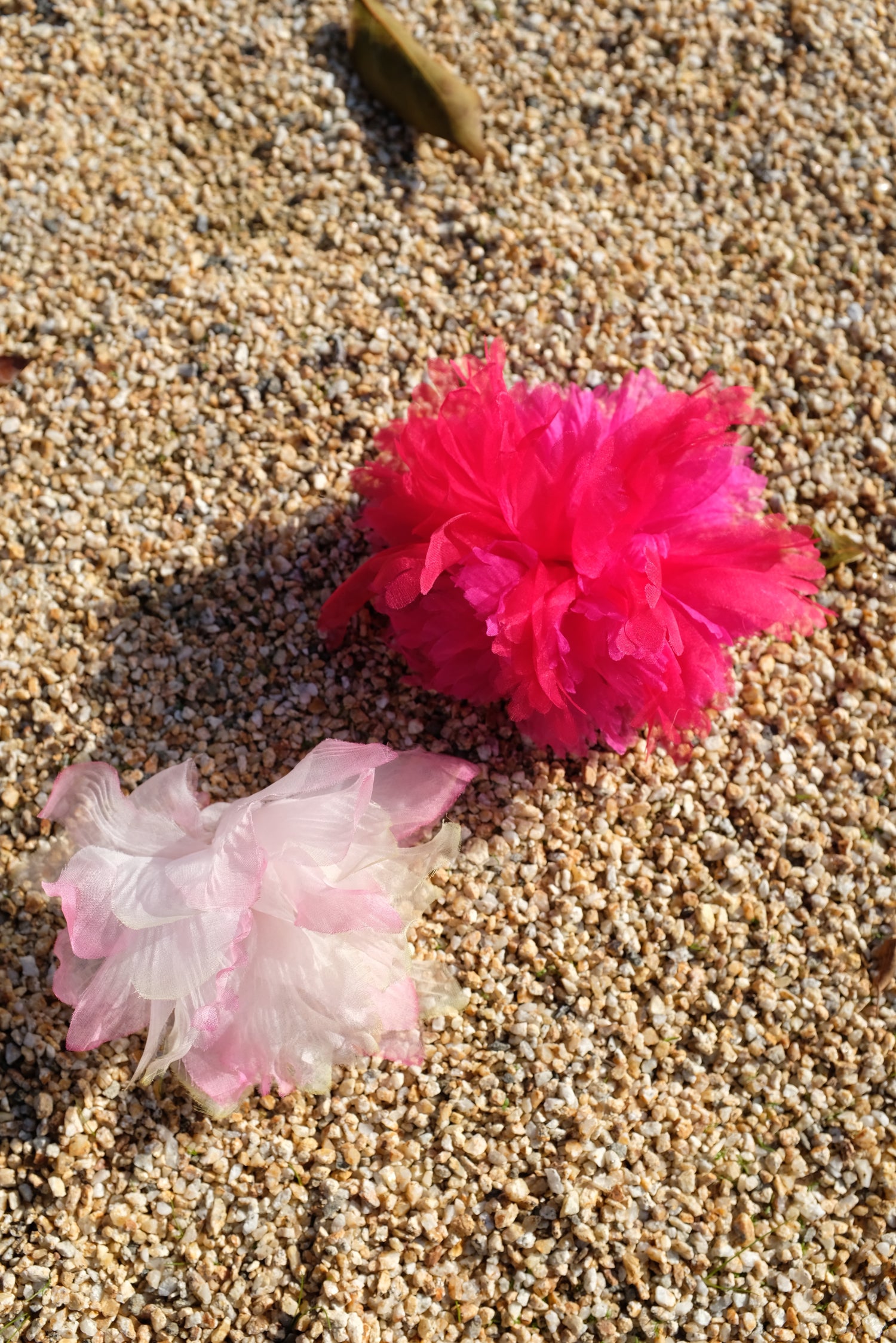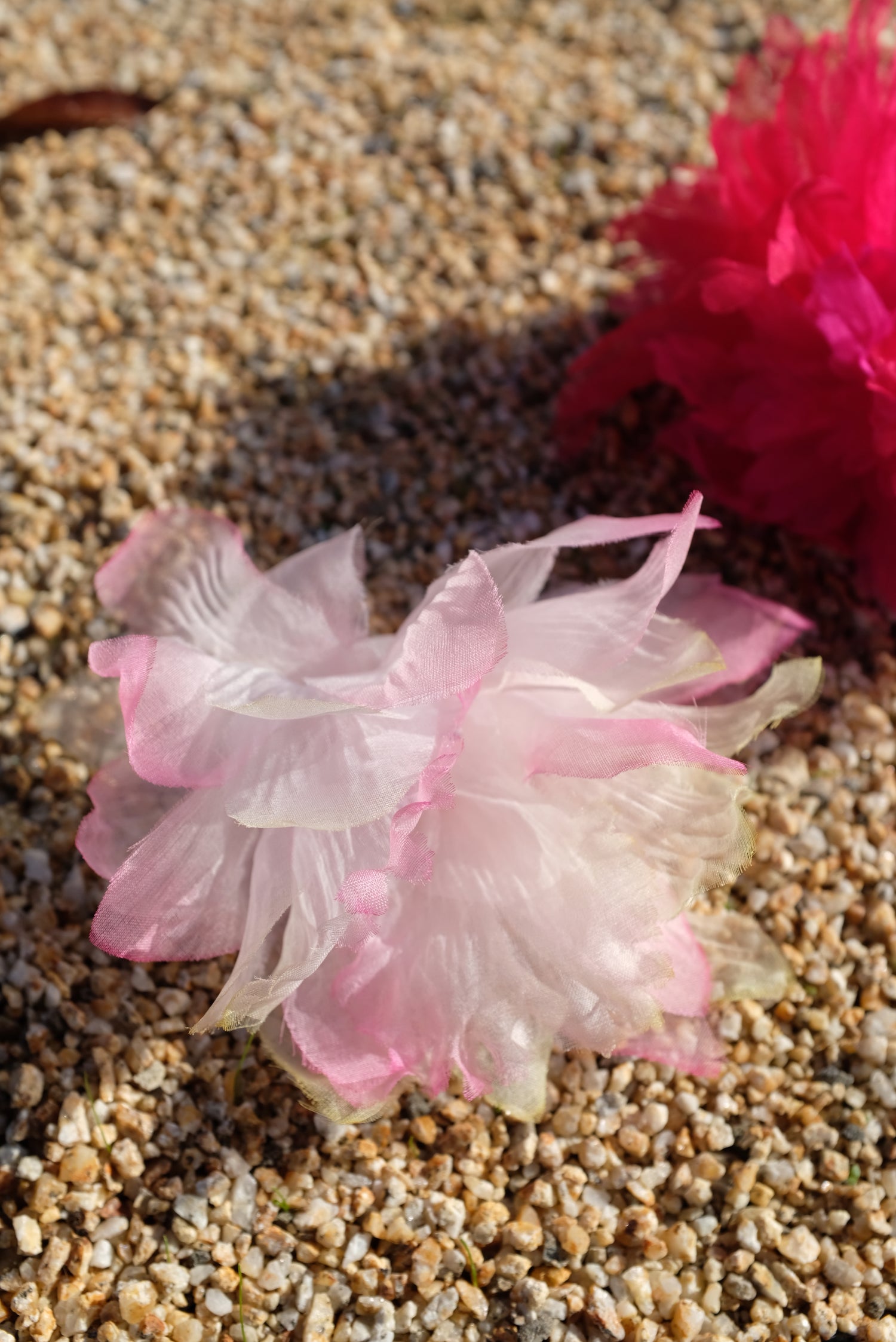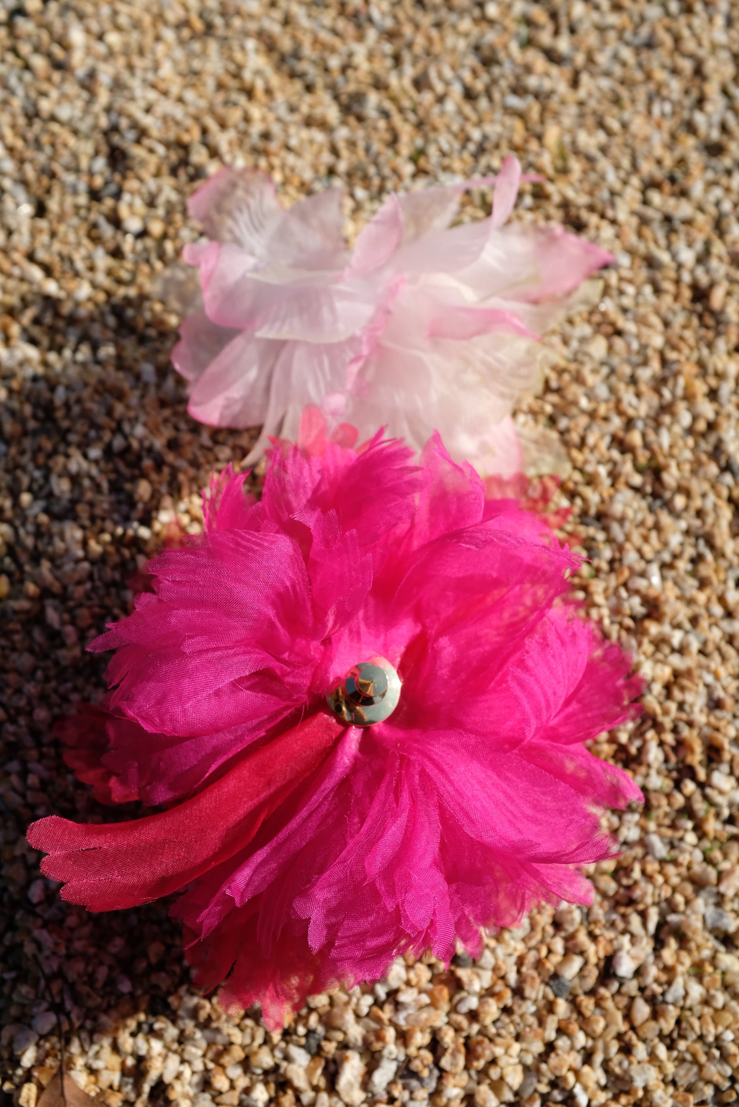 100% Silk flower brooch. Available in vibrant red and fuschia or in a delicate pink and white. Aprox 5" diameter.