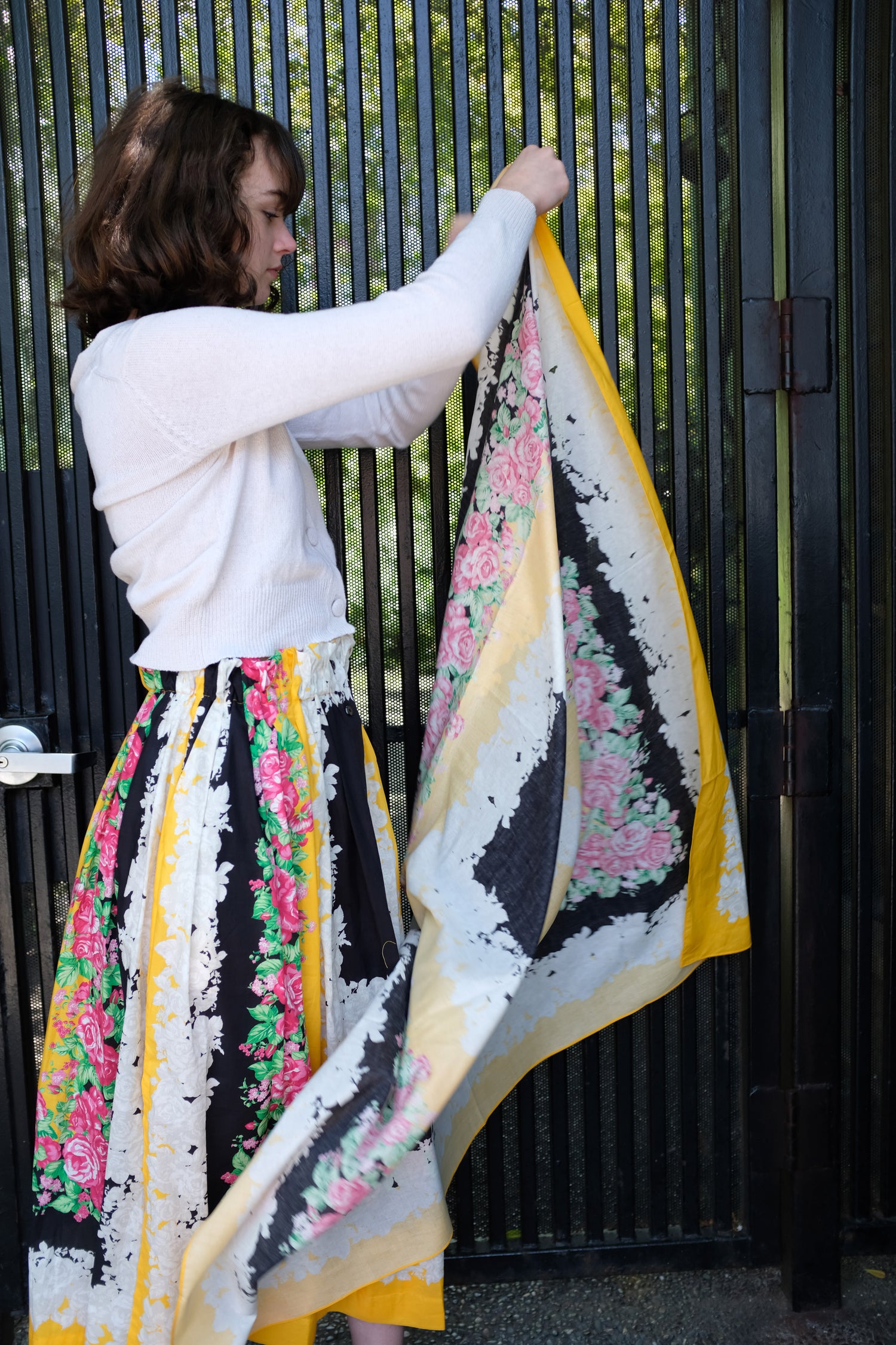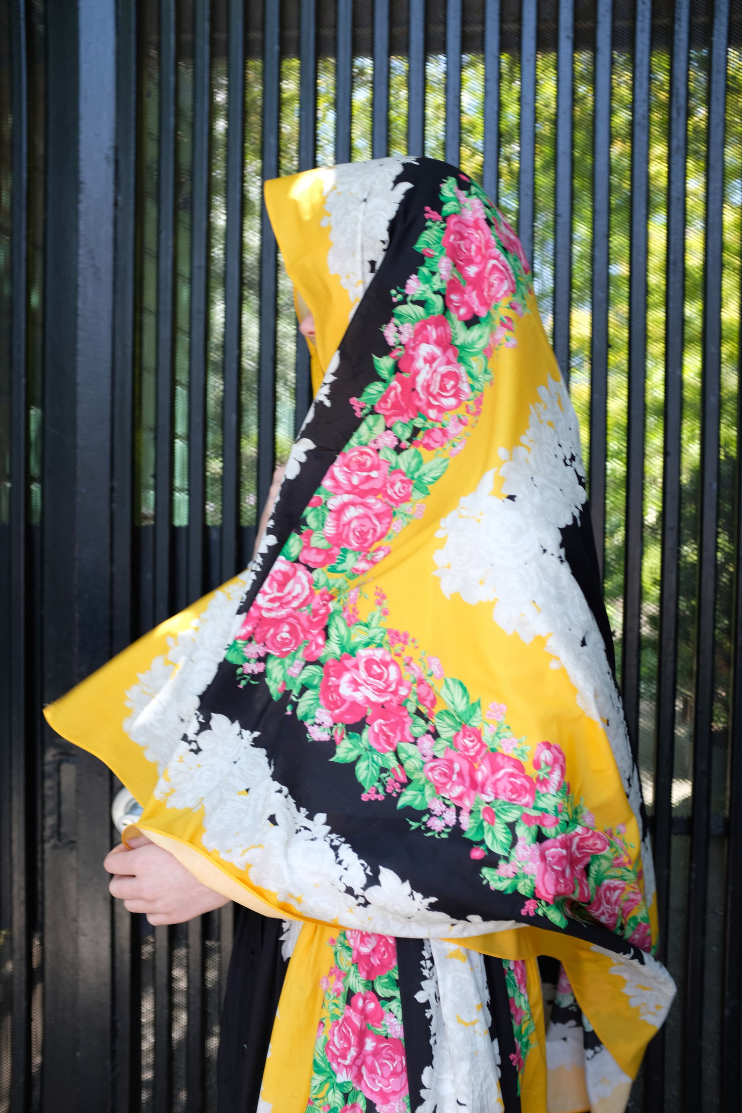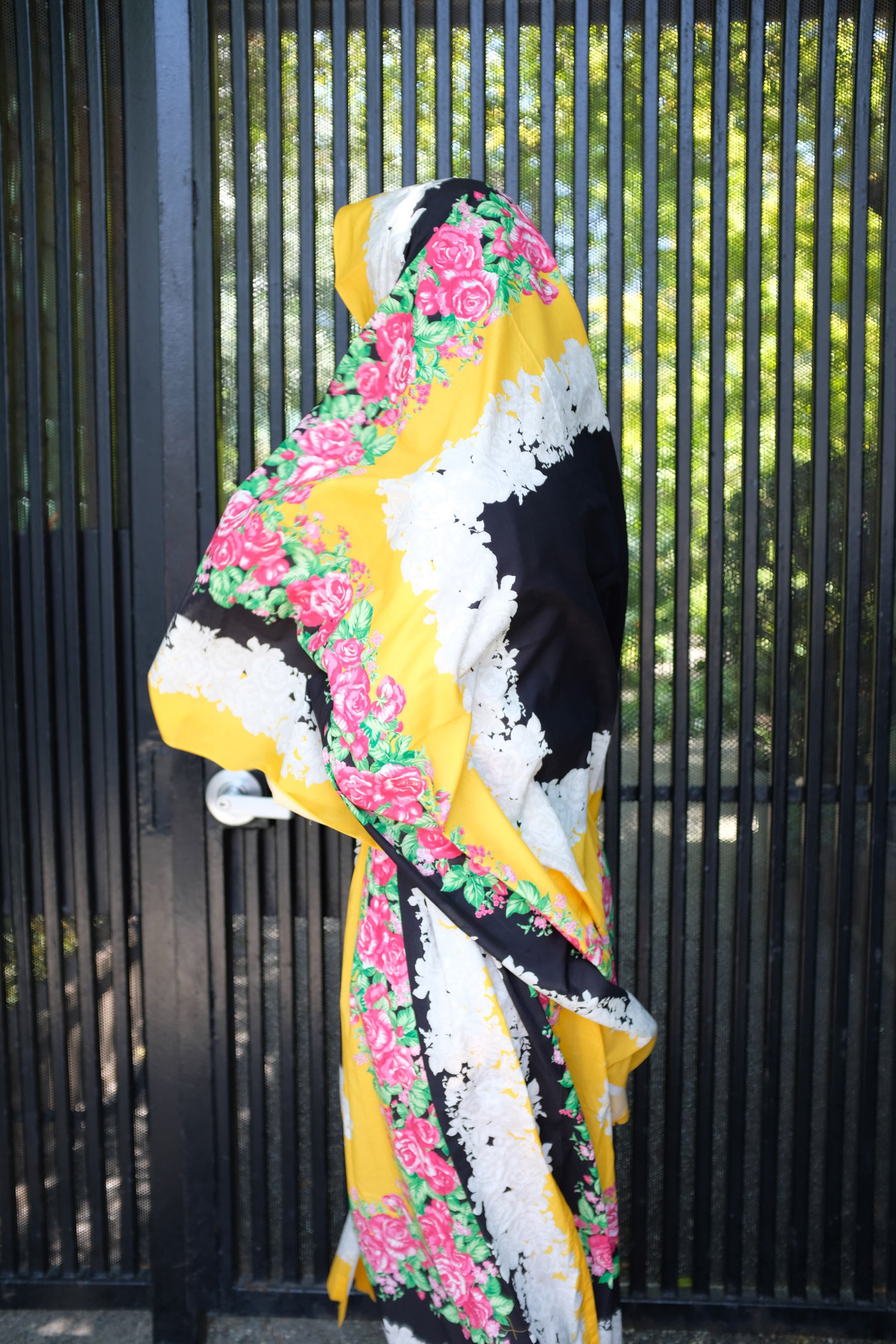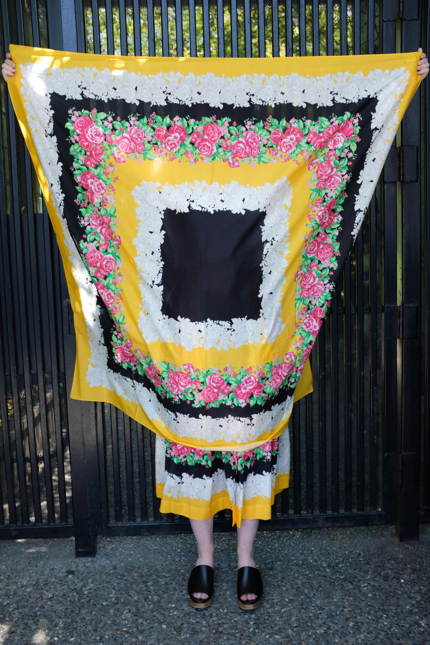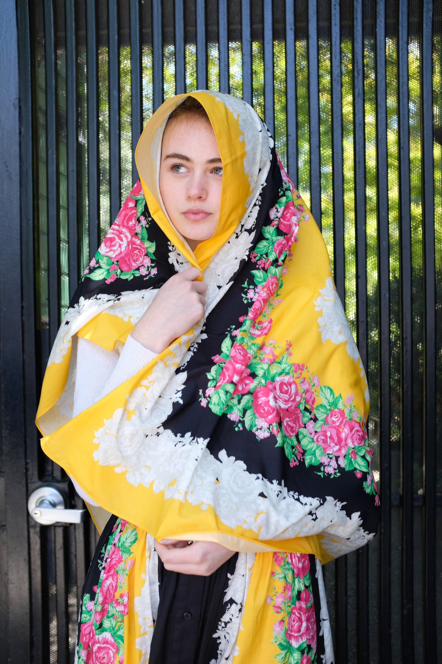Large scarf, Yellow Foulard print on cotton voile, inspired by vintage floral and paisley scarves. The square design is placed differently on each silhouette to create a graphic visual silhouette. 50" Long, 50" Wide. 100% Cotton.