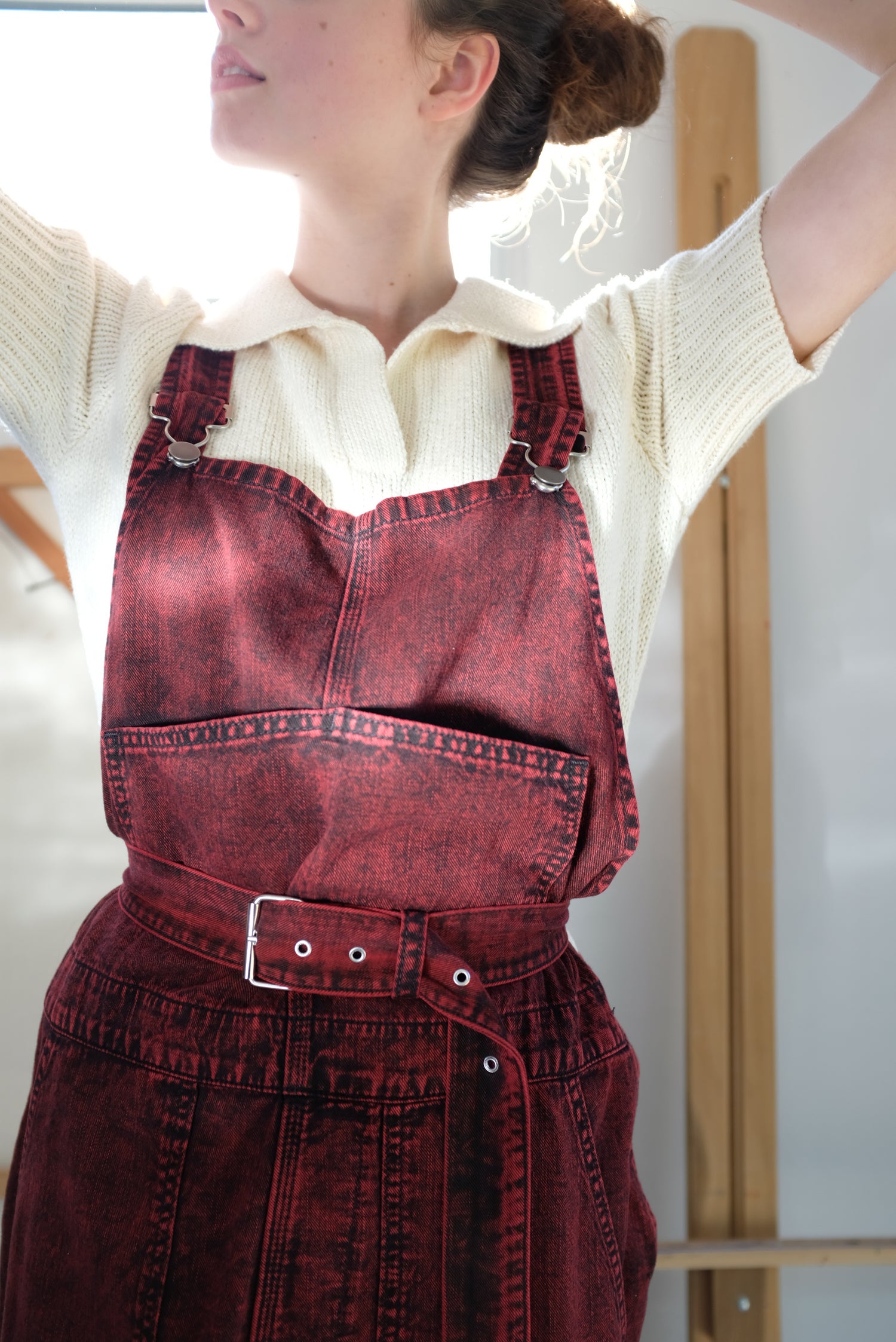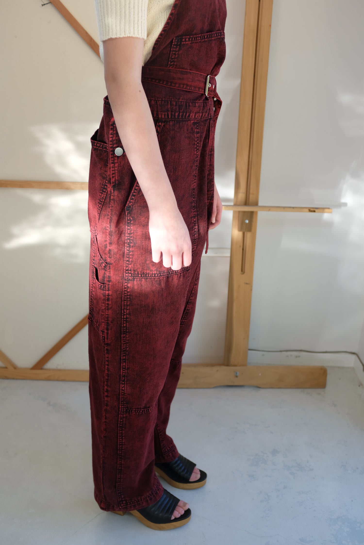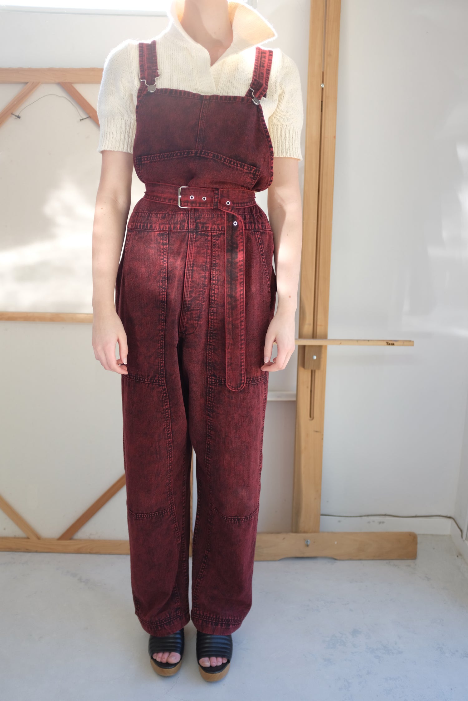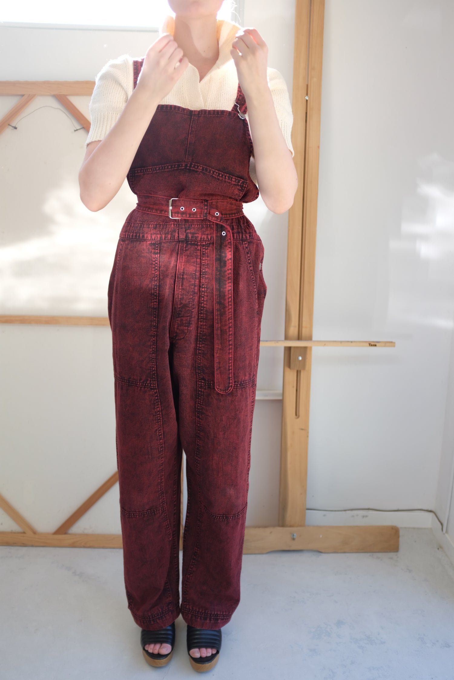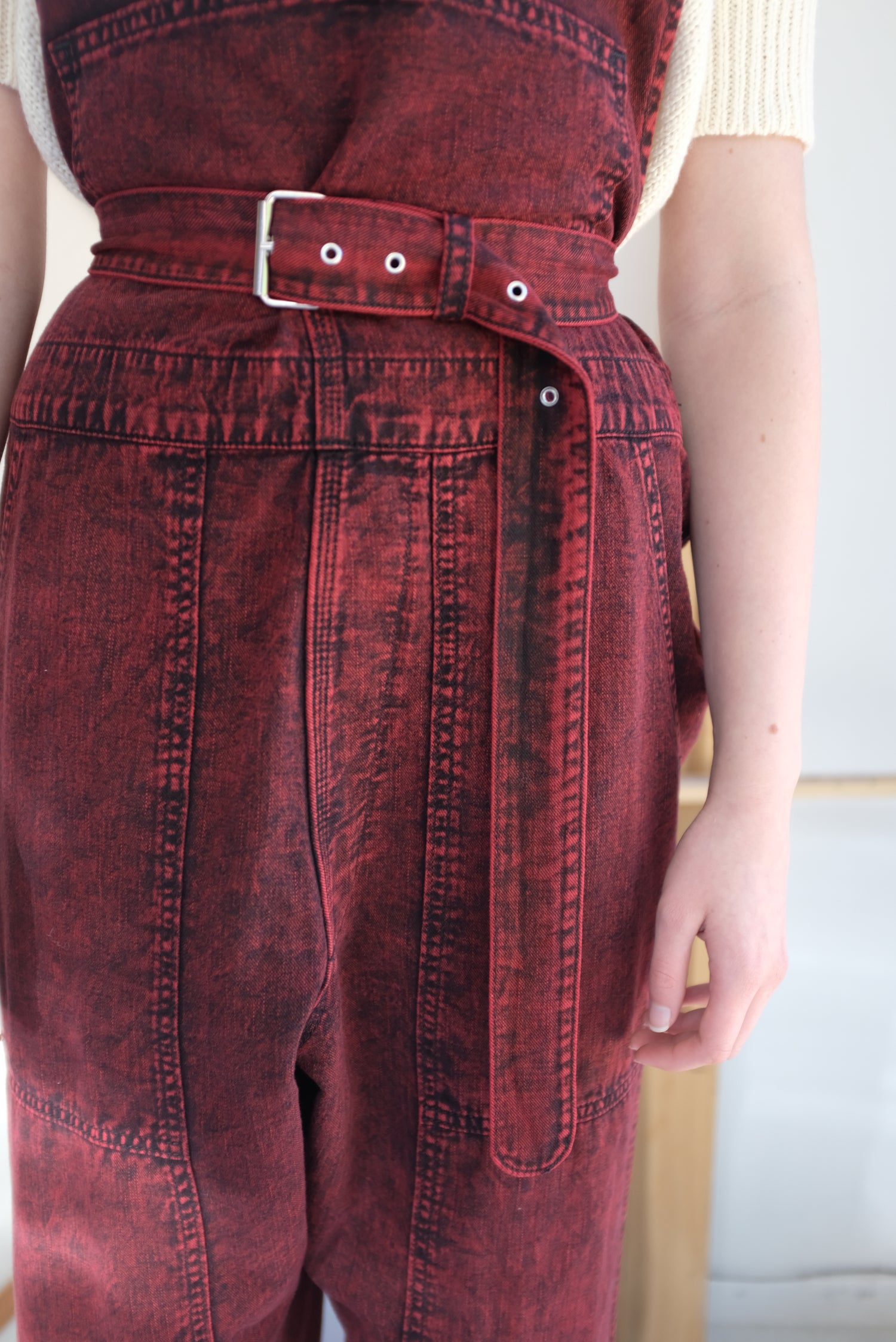 Oversized, belted overall in soft washed denim. Comfortable fit with long, wide legs, adjustable belt, and straps that crossover in the back. Lightweight denim with seam detailing and 80's flare, drapes beautifully. Overall strap closures, side slip pockets, patch pockets at the back. Front dual chest pocket, button closure on sides. 100% Cotton.