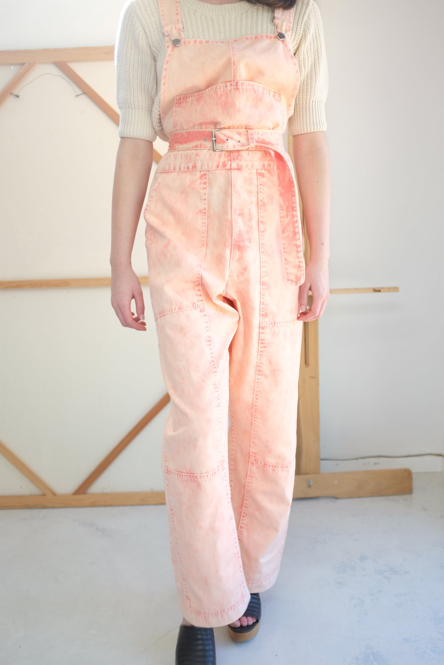 Oversized, belted overall in soft washed chino. Comfortable fit with long, wide legs, adjustable belt, and straps that crossover in the back. Lightweight chino with seam detailing and 80's flare. Overall strap closures, side slip pockets, patch pockets at the back. Front dual chest pocket, button closure on sides. 100% Cotton.