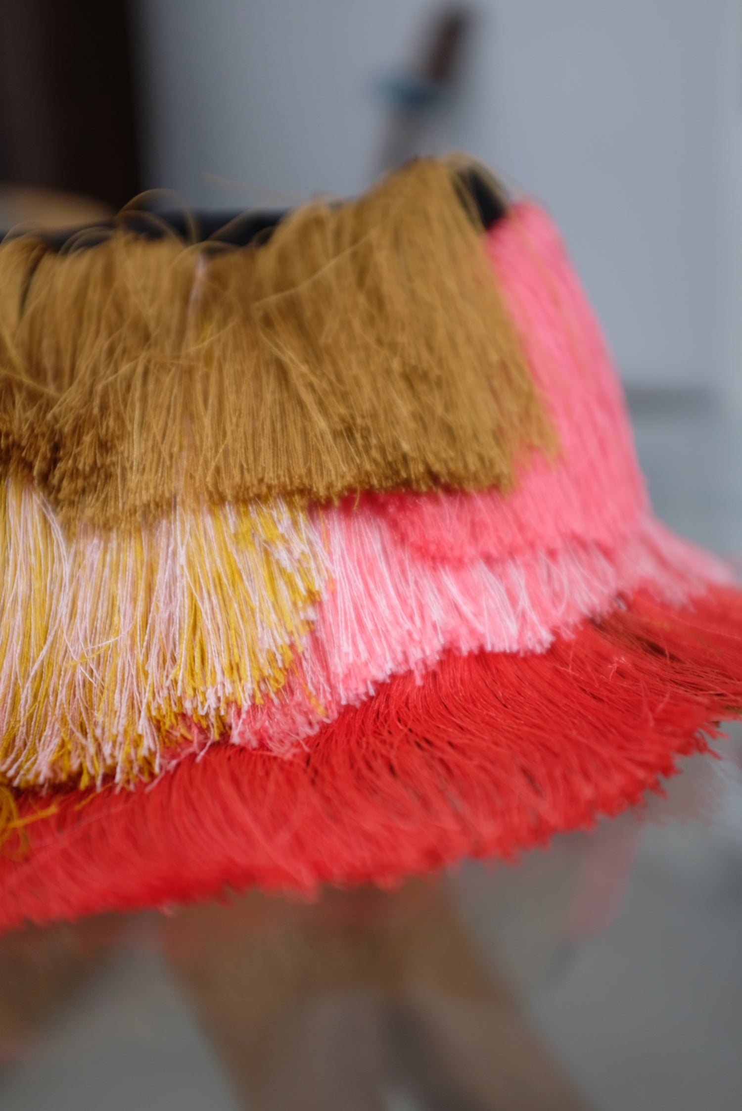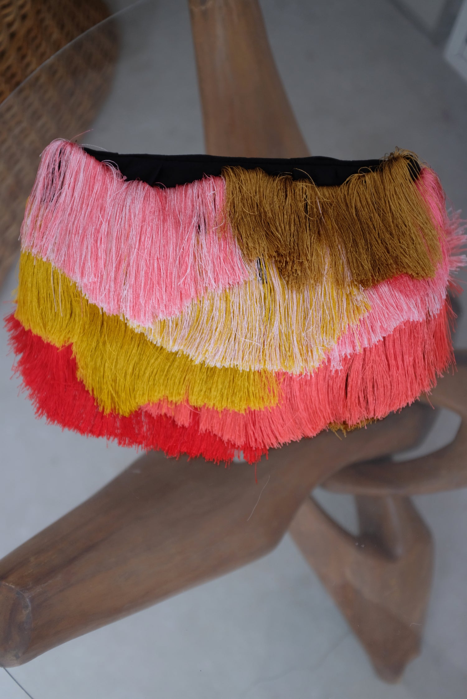Slim clutch covered with colorful fringe detail in layered waves that swing and swish. Metal snap top closure, fully lined interior. 11” X 5”.